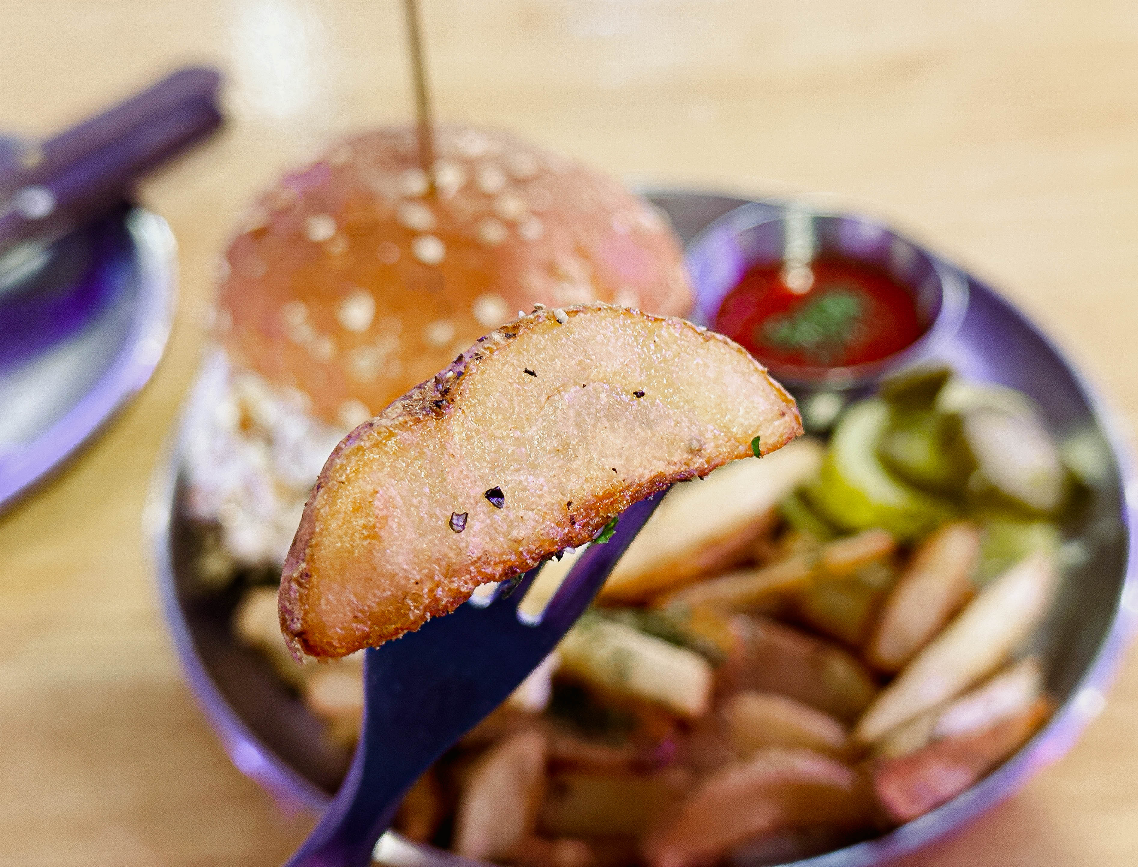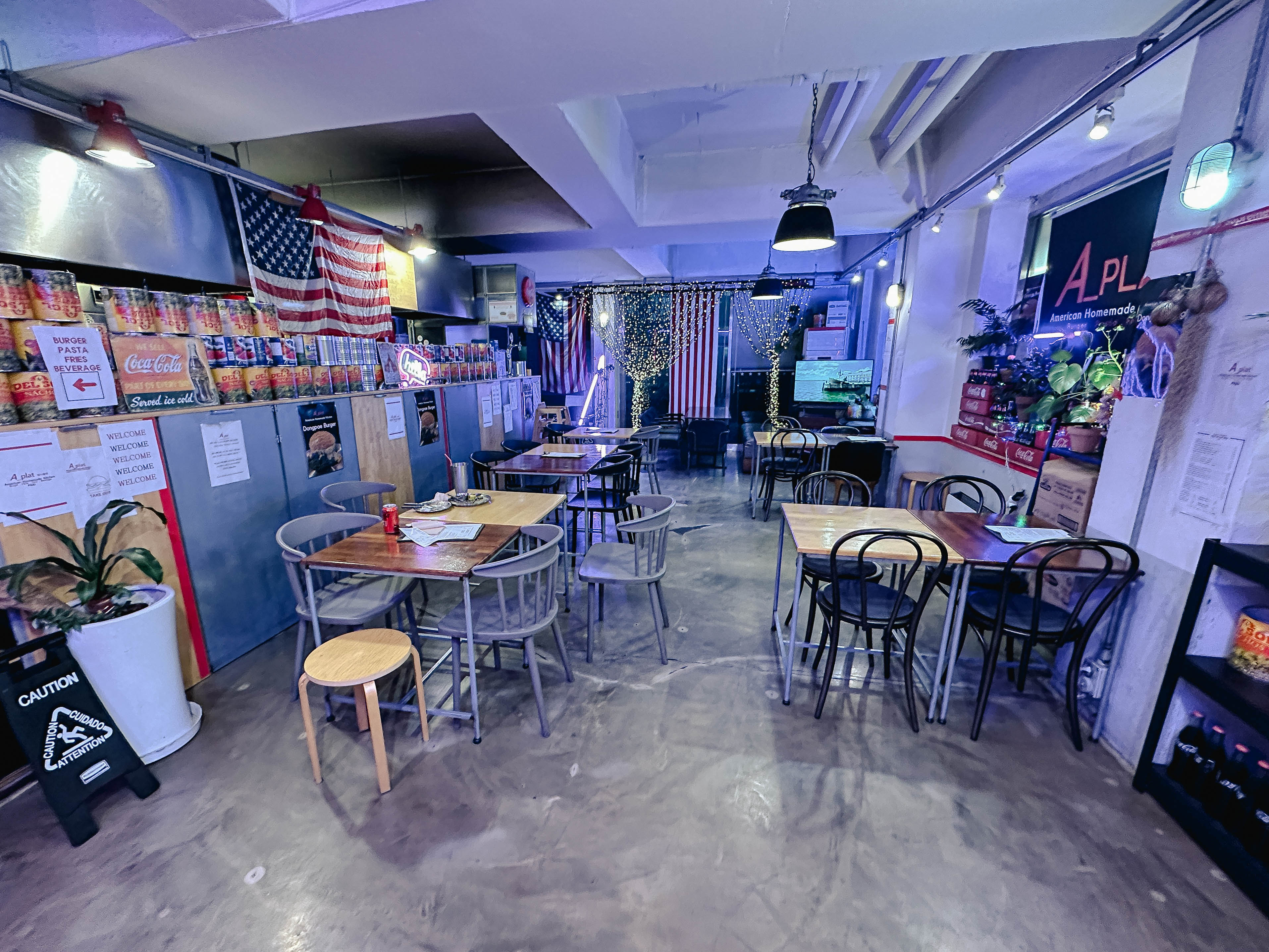 파주 운정 카페거리에 위치한 에이플렛은 수제버거로 유명한 가게였습니다. 동패버거와 비프머쉬룸버거가 유명한데, 저는 비프머쉬룸버거를 주문했습니다. 고소한 크림과 버섯, 그리고 양파로 달달하면서도 육즙 가득 풍미가 좋았던 메뉴였습니다. 다만 저는 좀 짭짤한 수제버거를 선호하다 보니 맛에서 조금 아쉬웠고, 조명에 푸른색과 보라색을 많이 써서 음식 색깔이 맛깔나게 안 보인다는 게 좀 아쉽더라고요.