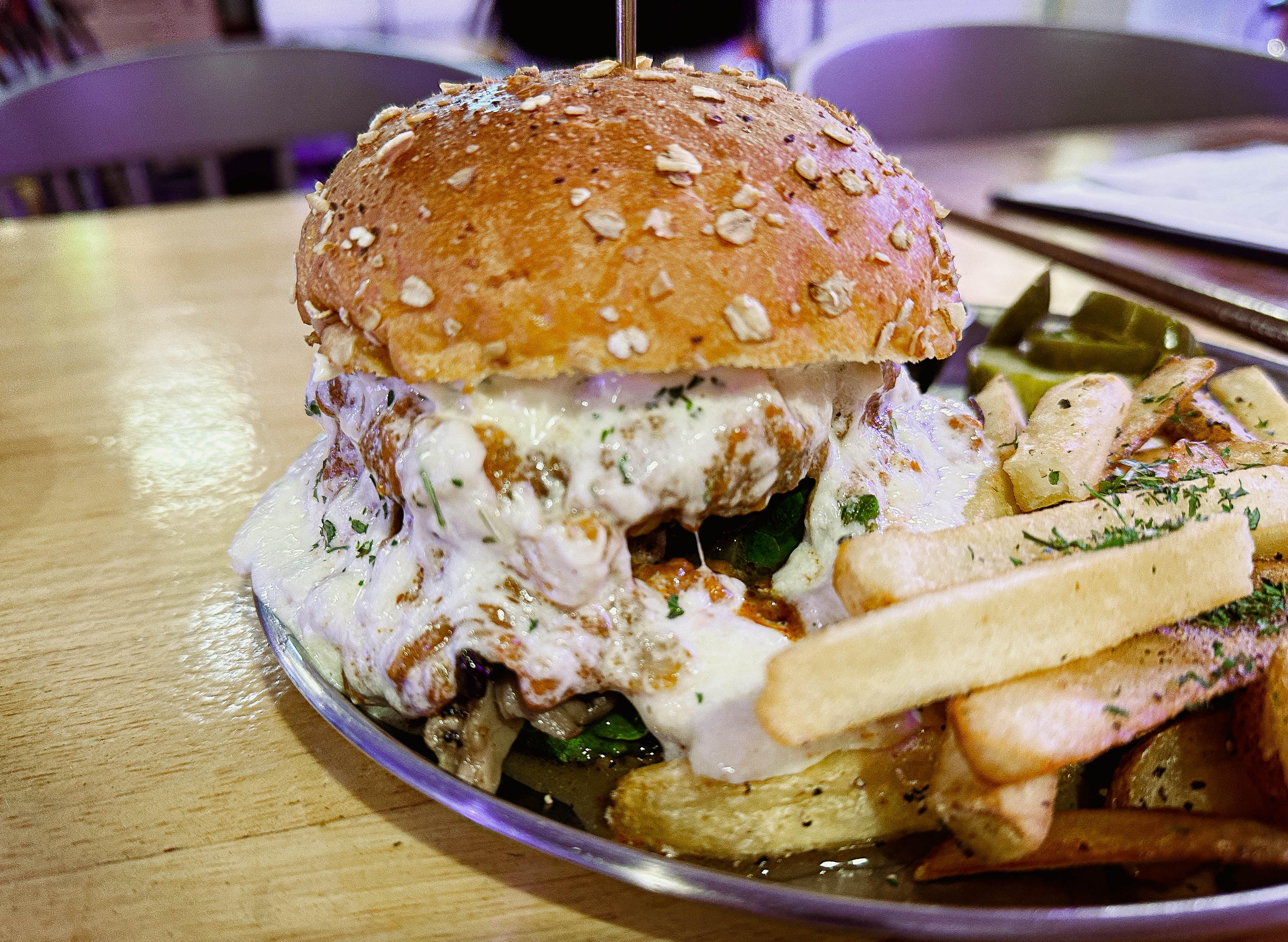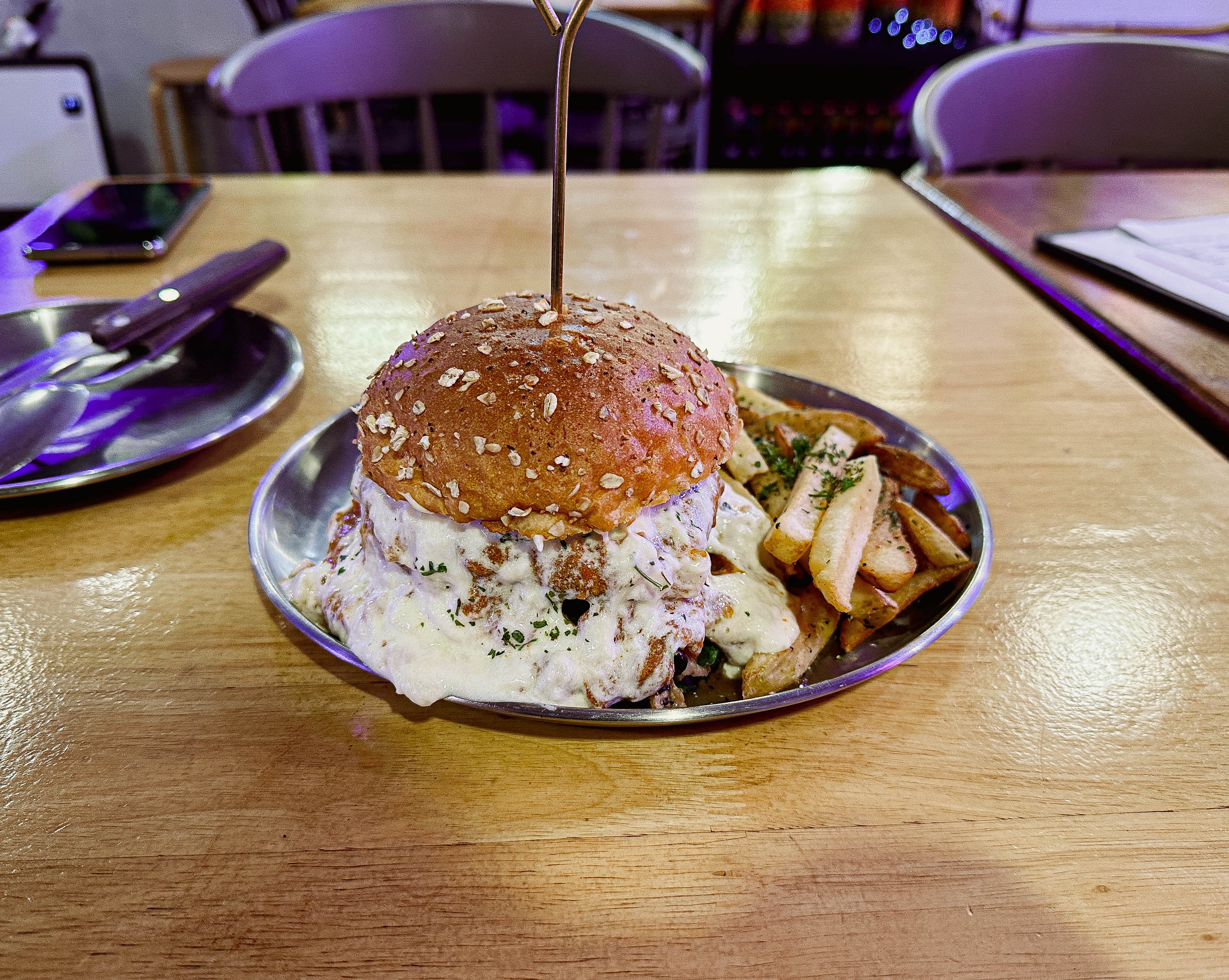 파주 운정 카페거리에 위치한 에이플렛은 수제버거로 유명한 가게였습니다. 동패버거와 비프머쉬룸버거가 유명한데, 저는 비프머쉬룸버거를 주문했습니다. 고소한 크림과 버섯, 그리고 양파로 달달하면서도 육즙 가득 풍미가 좋았던 메뉴였습니다. 다만 저는 좀 짭짤한 수제버거를 선호하다 보니 맛에서 조금 아쉬웠고, 조명에 푸른색과 보라색을 많이 써서 음식 색깔이 맛깔나게 안 보인다는 게 좀 아쉽더라고요.