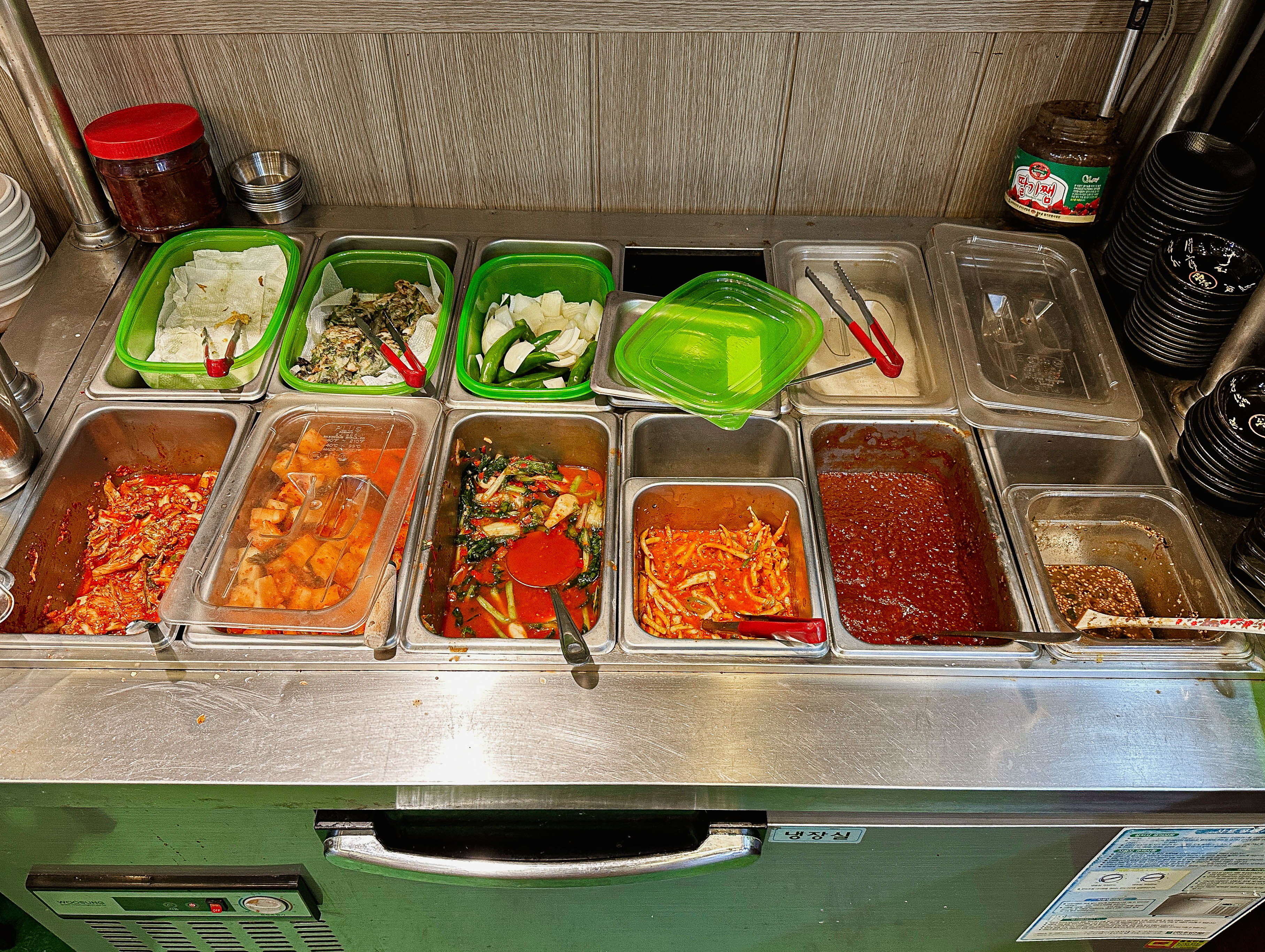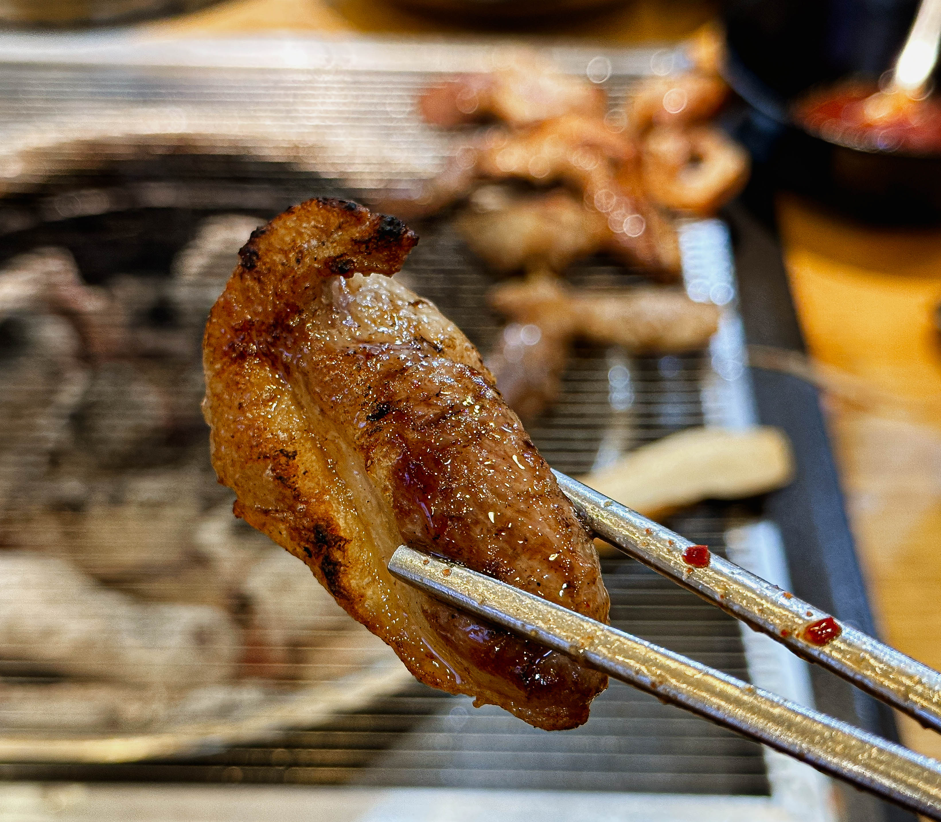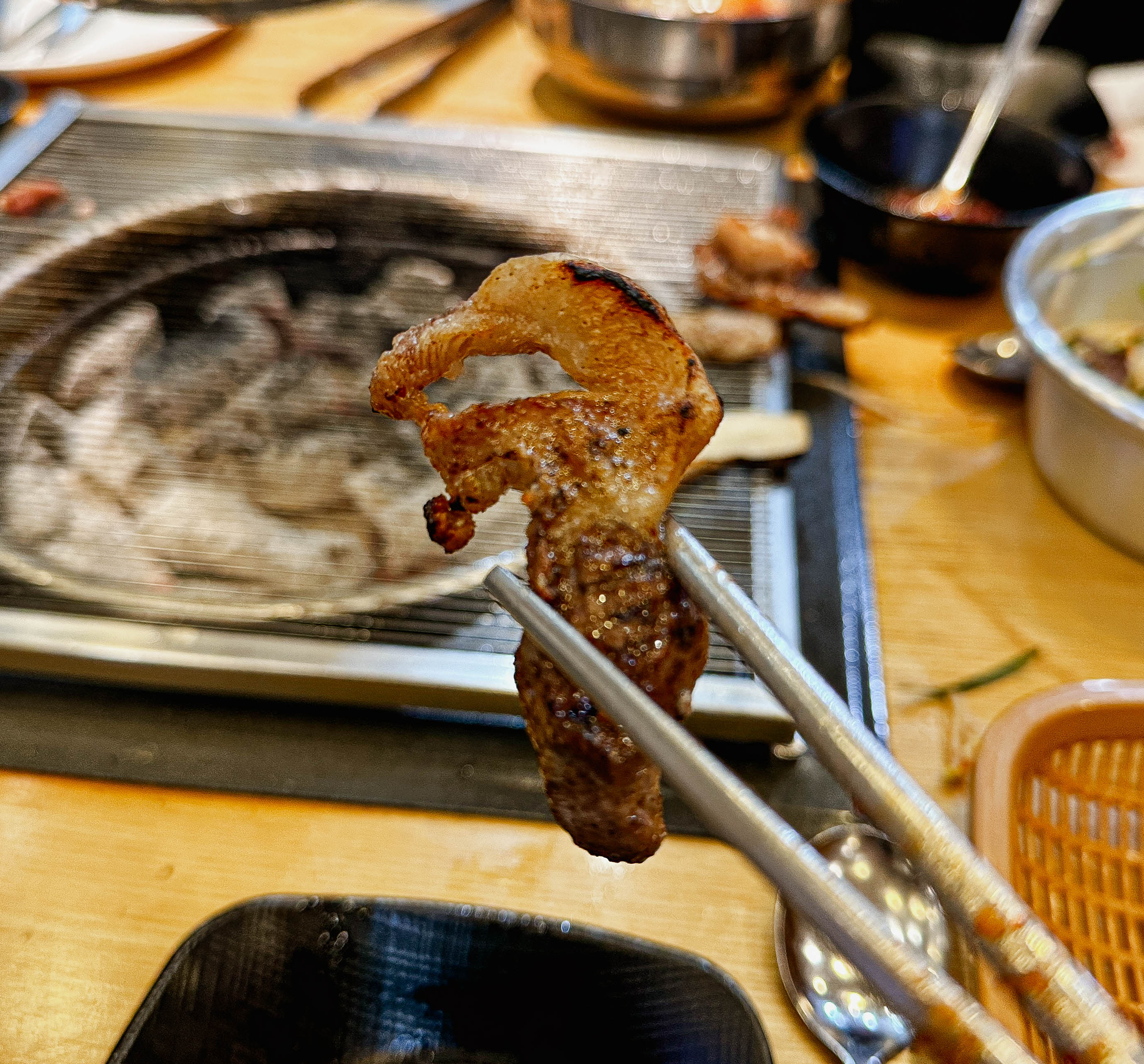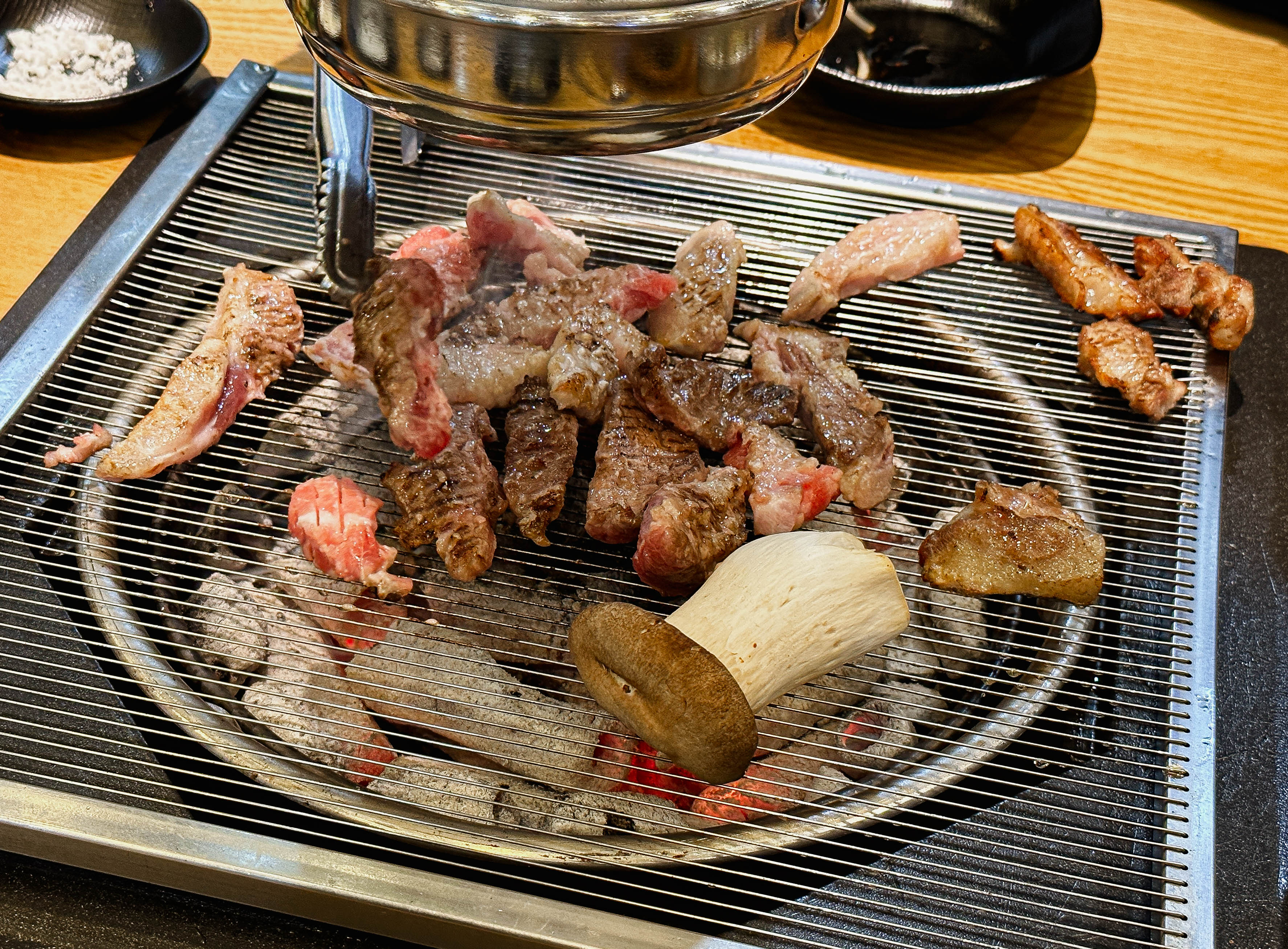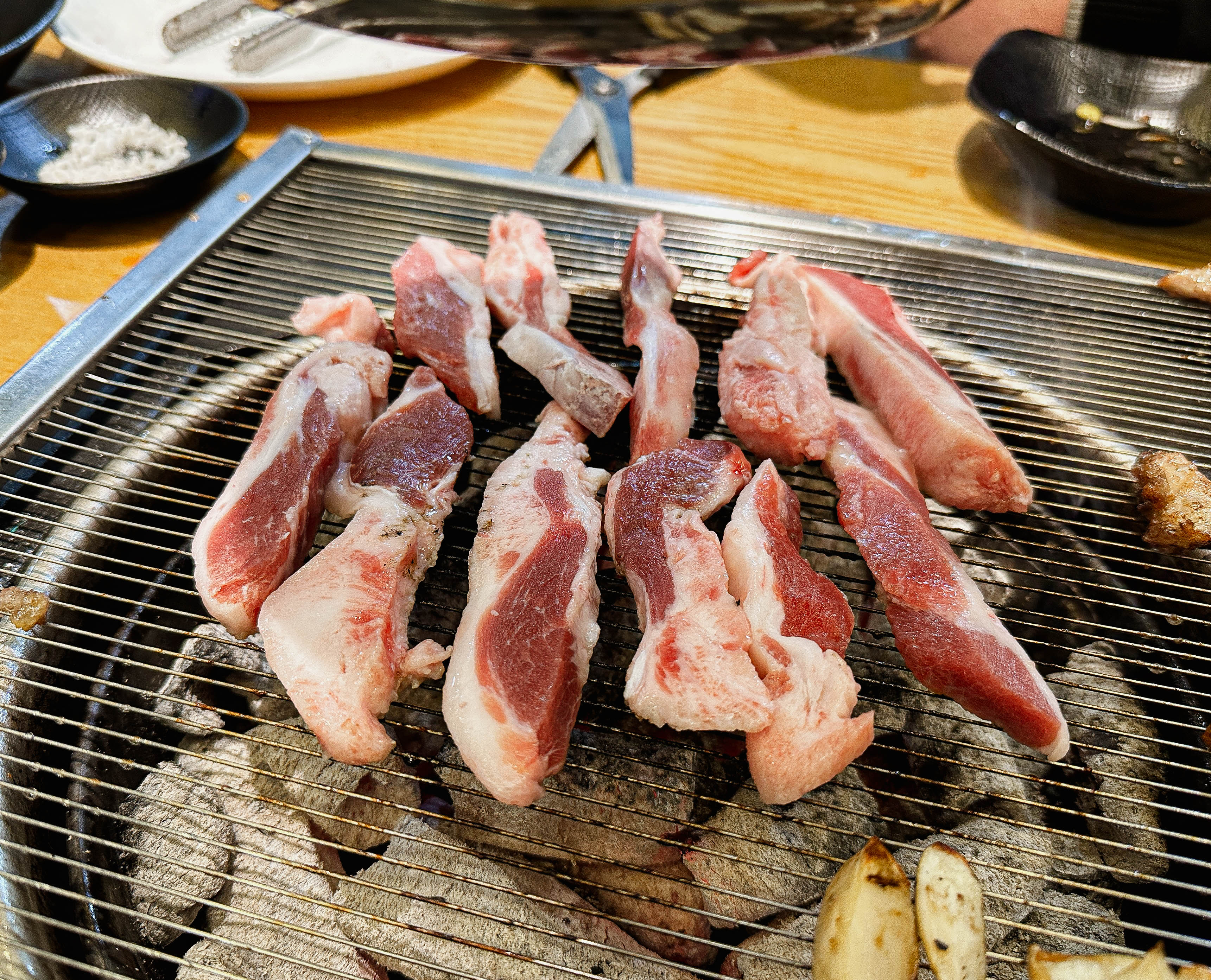 먼저 모둠뒷고기의 구성은 항정살, 뽈살, 덜미살, 콧살로 되어있었습니다. 불판 위에 고기를 올리고 서서히 구워주었습니다. 참고로 반찬과 양념 및 김치는 셀프코너에서 직접 가져다가 먹을 수 있게 되어있었습니다.