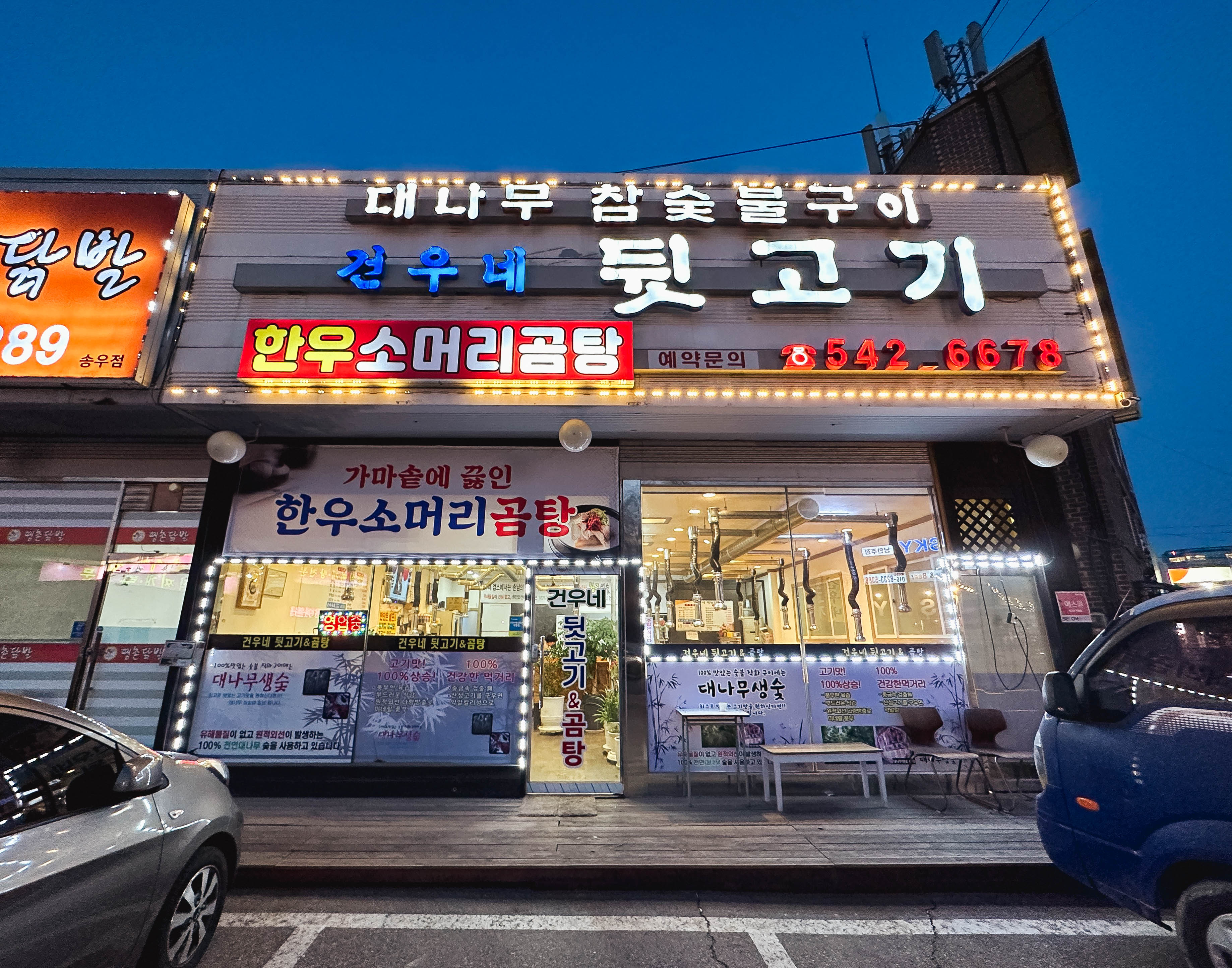 건우네뒷고기는 경기 포천시 소흘읍 송우리 564-2 에 위치한 가게입니다. 이곳은 소머리곰탕이랑 뒷고기를 함께 판매하는 가게인 것 같더라고요. 특히 만족스러운 점은 천연 대나무숯을 사용해 향도 좋고 맛있었습니다.