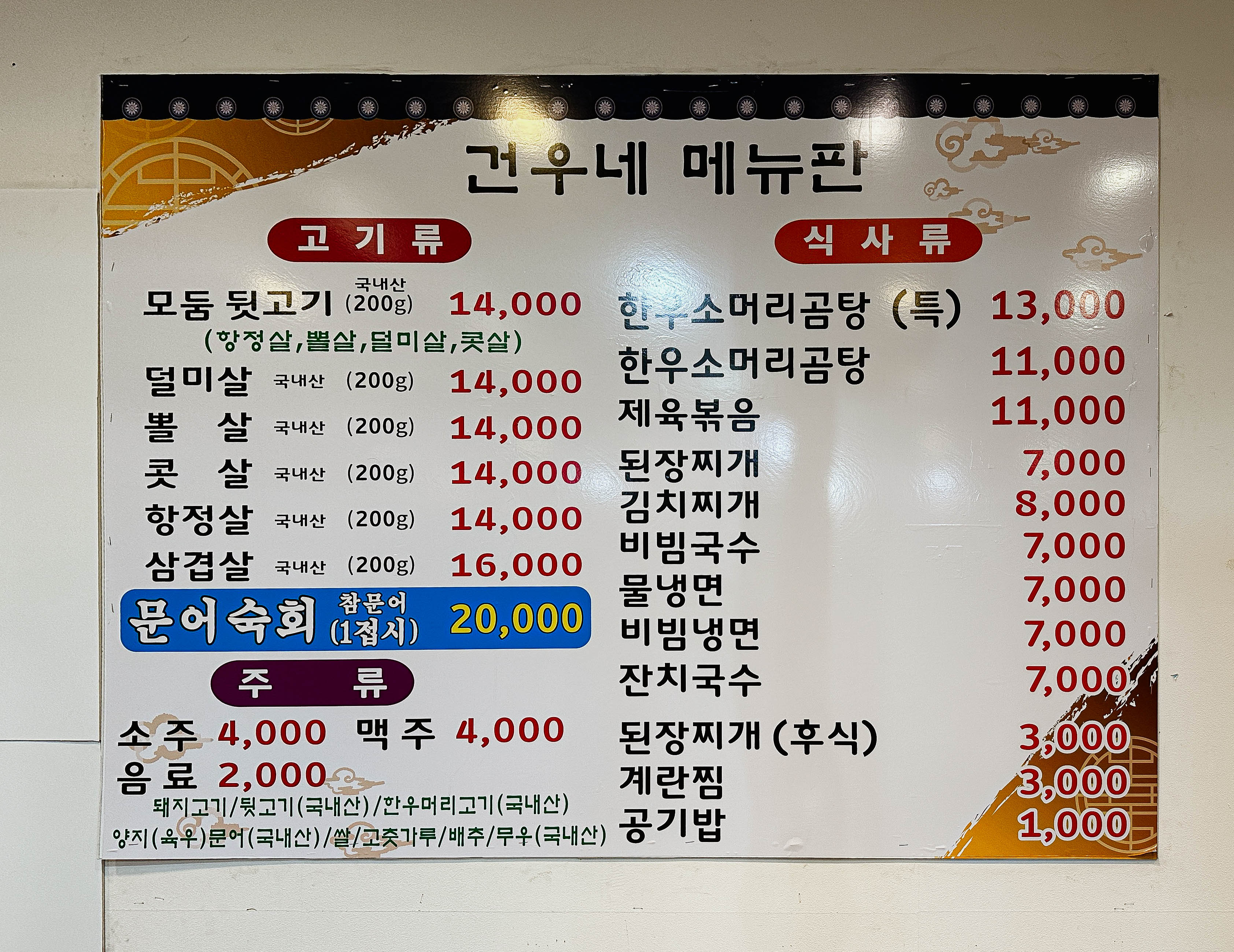 포천 건우네뒷고기의 메뉴는 모둠뒷고기, 덜미살, 뽈살, 콧살, 항정살, 삼겹살, 문어숙회, 한우소머리곰탕, 제육볶음, 된장찌개, 김치찌개, 비빔국수, 물냉면, 비빔냉면, 잔치국수, 계란찜이 있었습니다.