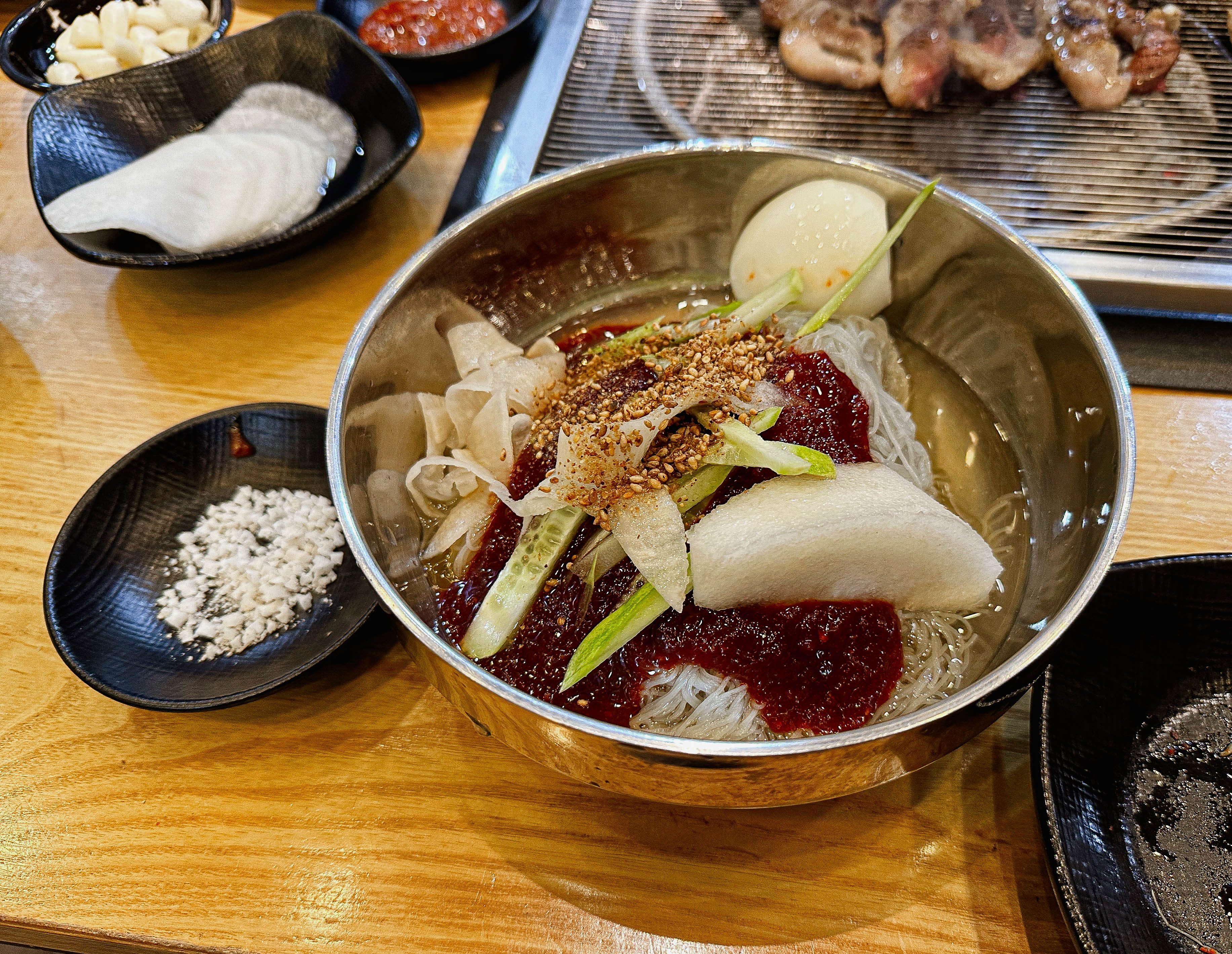 뒷고기 중 콧살은 처음 먹어보는데, 돼지 콧살의 모습은 길쭉한 모습으로 통째로 내어오면 손님들이 거부감을 느끼기 때문에 썰어준다고 하시더라고요. 실제로 먹다 보면 돼지의 콧구멍으로 보이는 고기가 더러 보이더라고요. 사장님께 여쭤보니 돼지콧살은 쫄깃한 식감이 특징이라고 하셨고, 실제 먹어보니 약간 꼬들한 느낌이 있는 부위였습니다. 참, 비빔냉면도 먹어보았는데, 비빔냉면도 참 맛있더라고요.