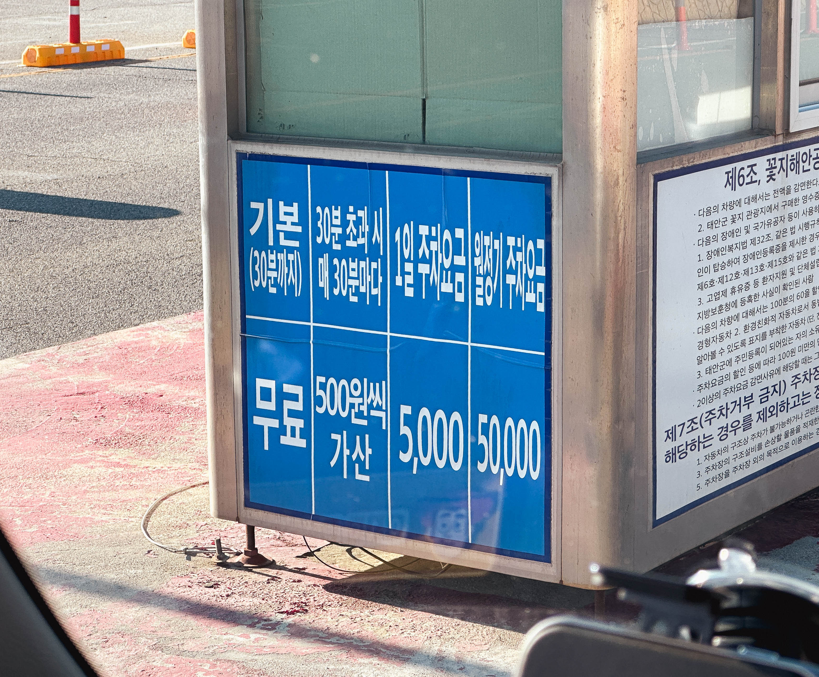 코리아플라워파크 행사장 인근 꽃지해안공원 주차는 기본 30분 무료이며, 30분 초과 시 30분마다 500원씩 가산된다고 합니다. 1일 주차요금이 5,000원이니 주차요금은 크게 부담되지 않을 것으로 생각됩니다. 이용에 참고하시면 좋을 것 같습니다.