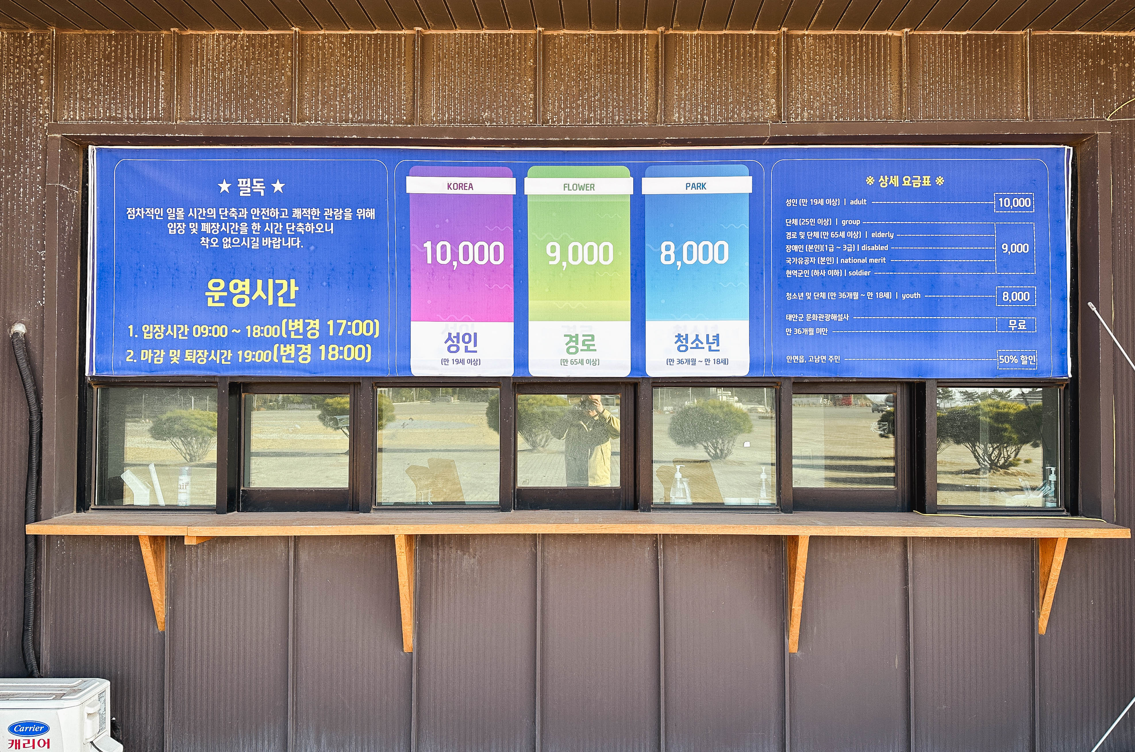 태안 튤립축제는 안면도 꽃지 해수욕장 근처 <코리아 플라워파크>라는 곳에서 열립니다. 입장료는 성인 10,000원 경로 9,000원, 청소년 8,000원에 판매된다고 합니다. 행사장 운영시간은 09시부터 17시까지이며, 퇴장시간은 18시라고 안내하고 있었습니다.