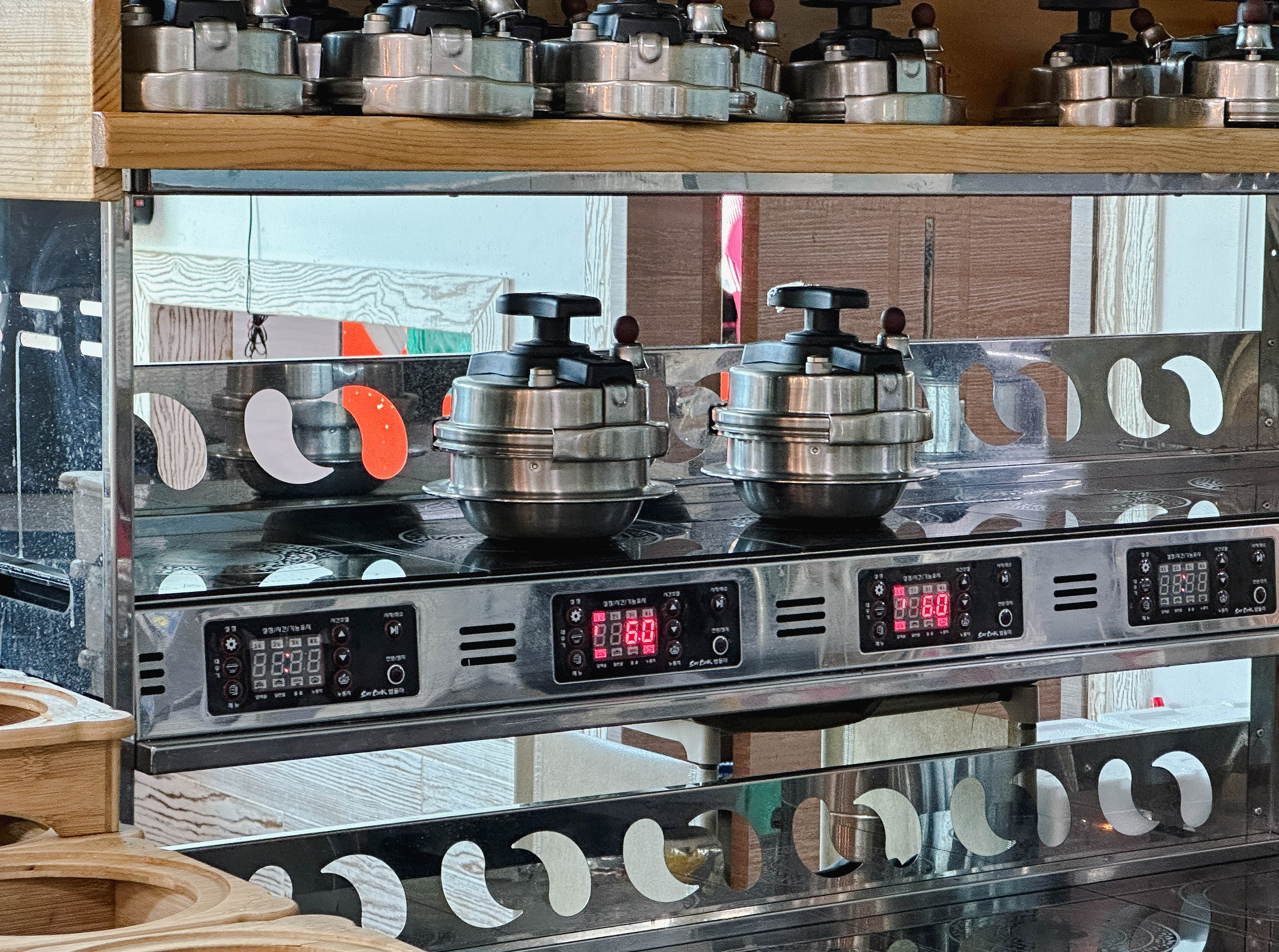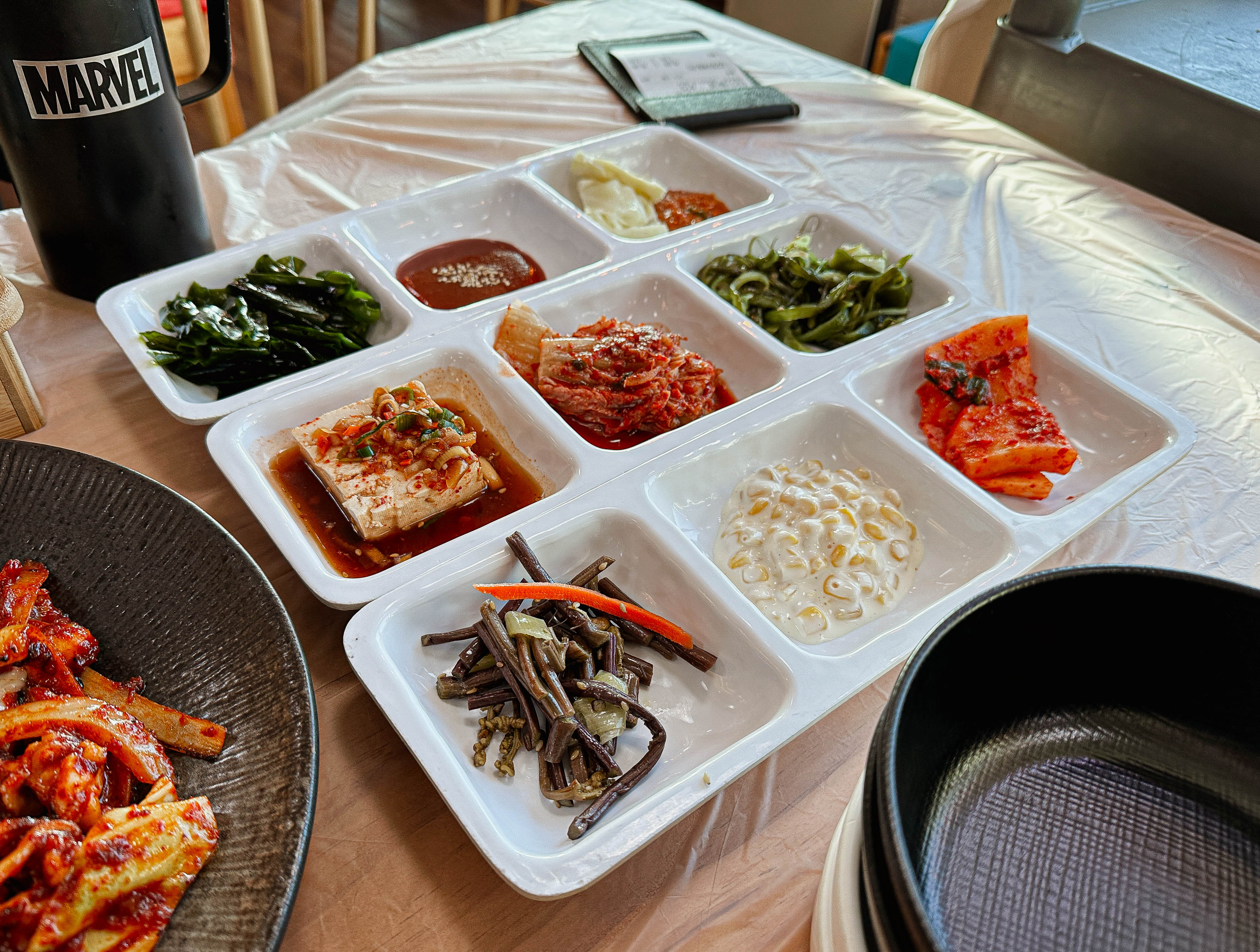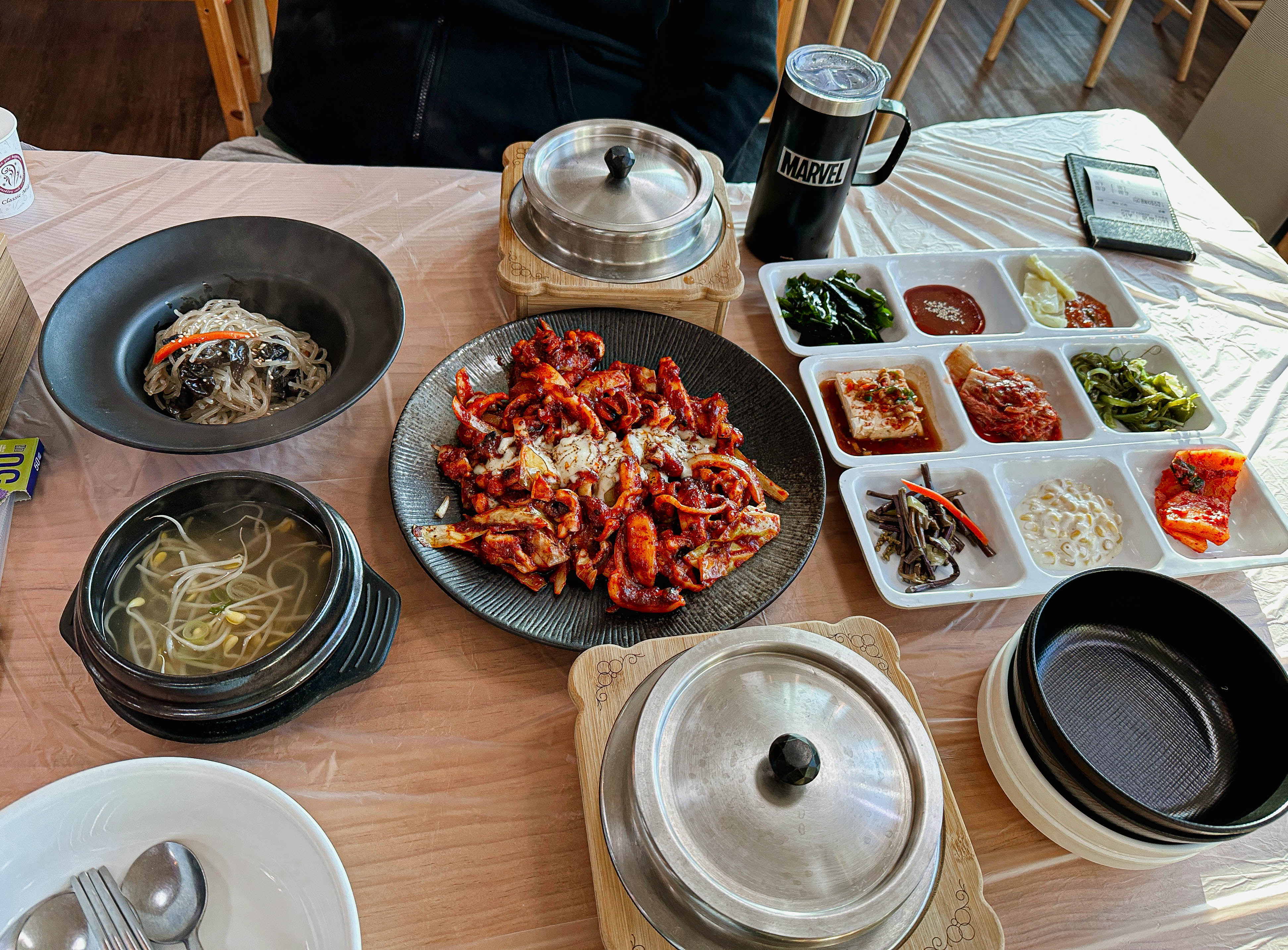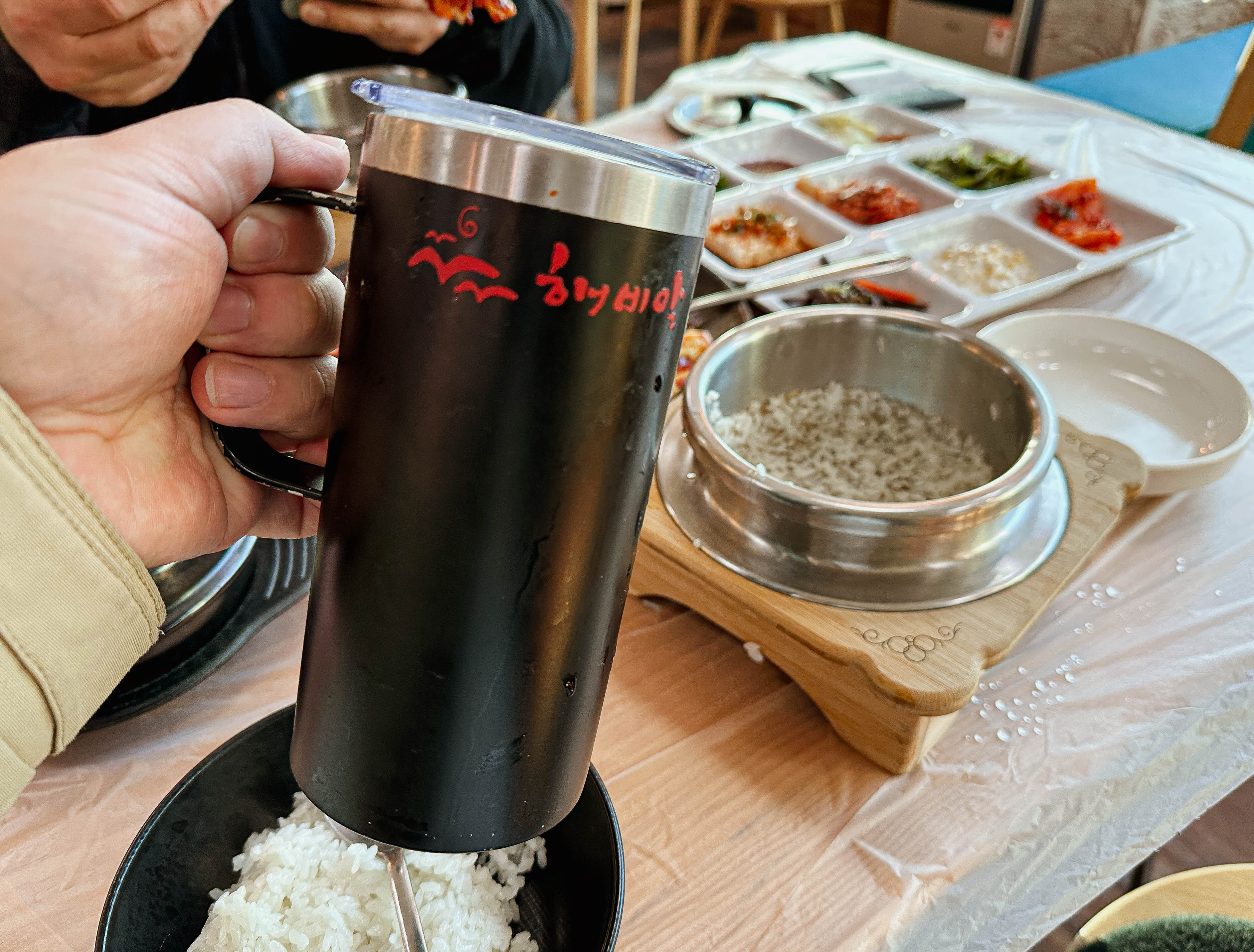 곧이어 주문한 갑오징어볶음과 솥밥이 등장했습니다. 콩나물국과 반찬도 함께 나왔는데, 반찬들이 깔끔하고 정갈하게 잘 나오는 편이었습니다. 솥밥도 갓 지어져 나와서 그런지 윤기가 있는 게 맛있었습니다. 참고로, 이곳은 특이하게 숭늉 만들 물을 텀블러에 제공하고 있었습니다.