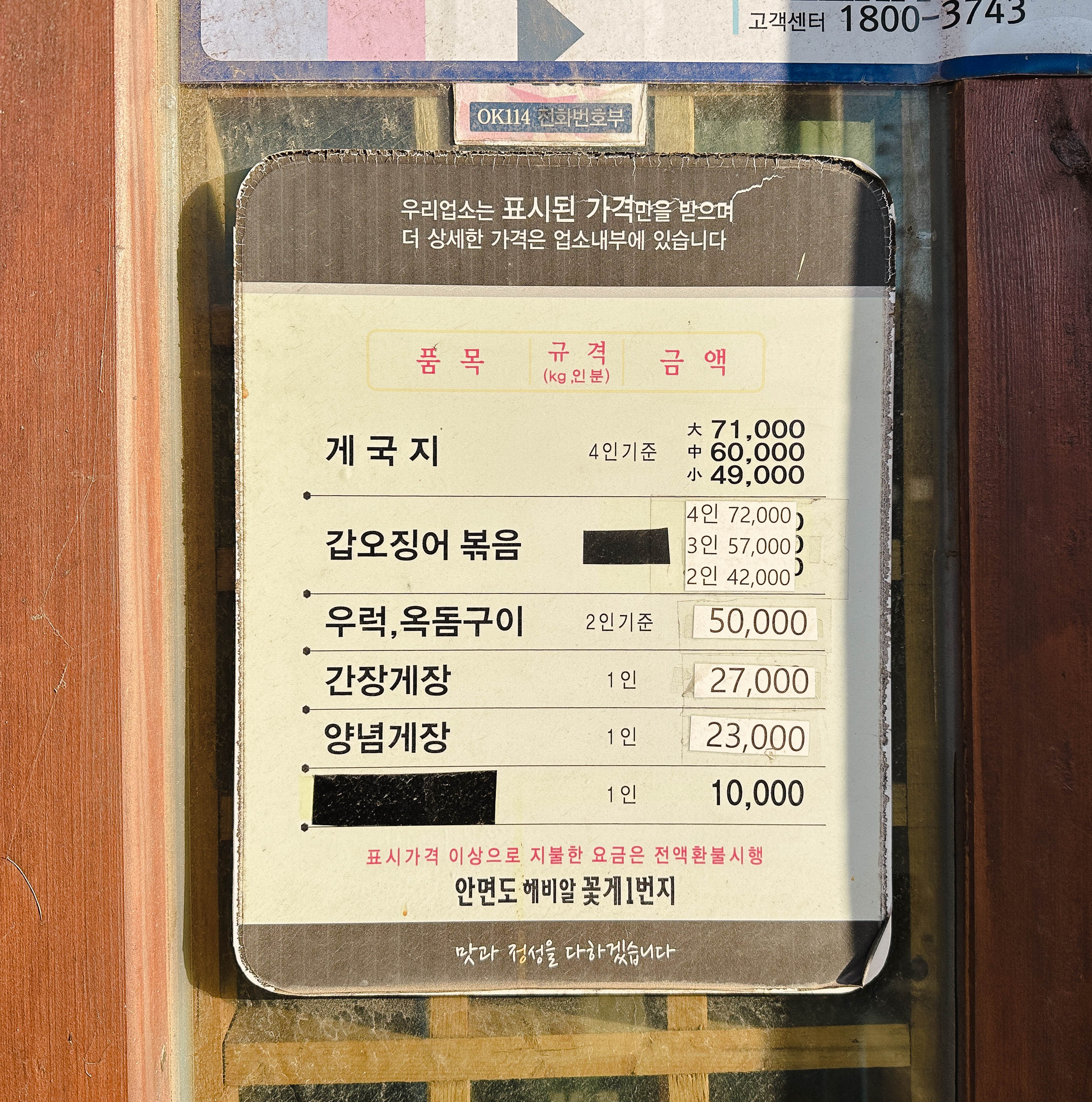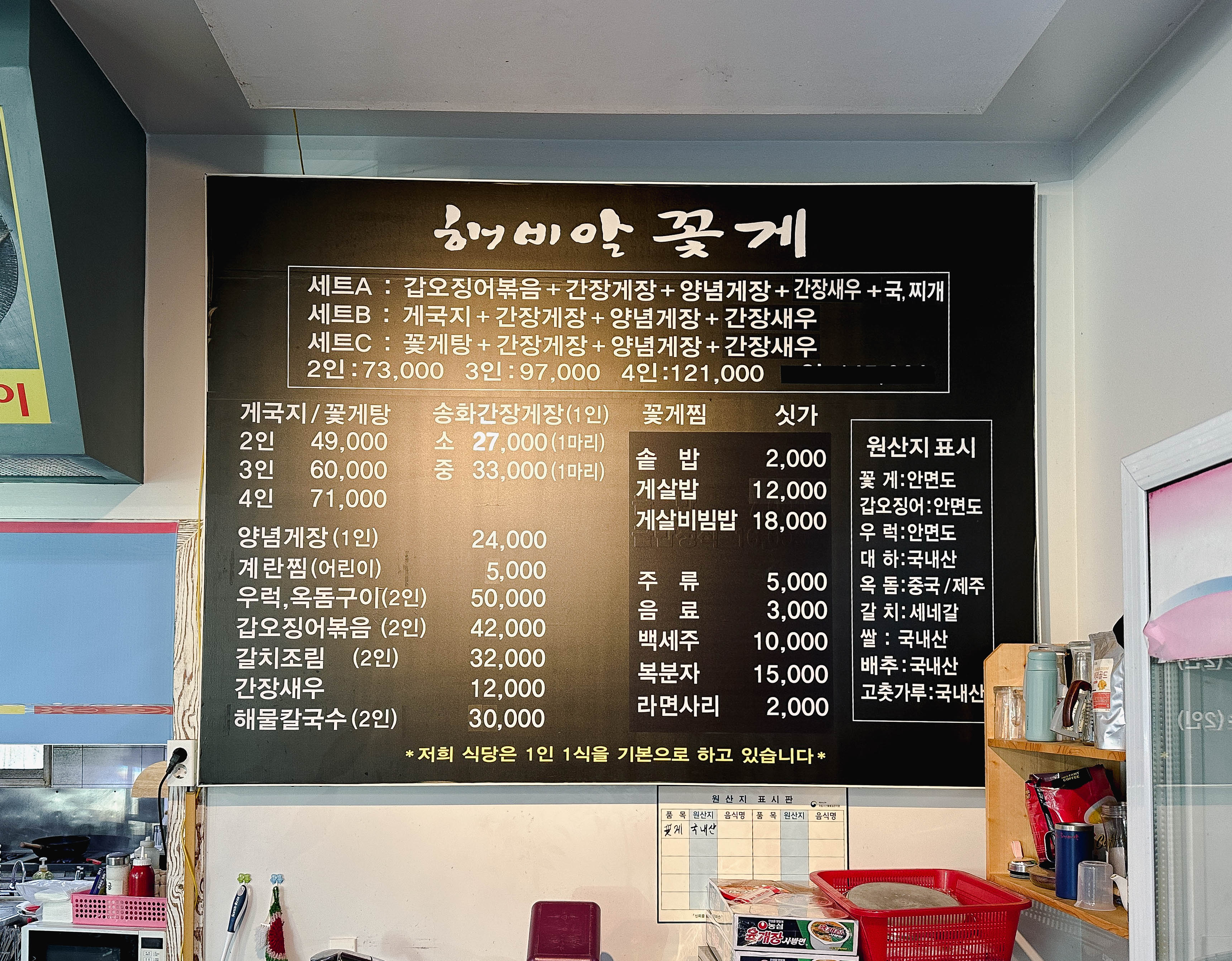 해비알꽃게는 충남 태안군 안면읍 승언리 723-3 에 위치한 가게입니다. 영업시간은 09:00~21:00 까지이며, KBS 2TV ⎡생생정보⎦라는 프로그램에 나온 적이 있는 가게라고 하더라고요. 옥외 메뉴판에는 게국지, 갑오징어볶음, 우럭・옥돔구이, 간장게장, 양념게장이 있었습니다.