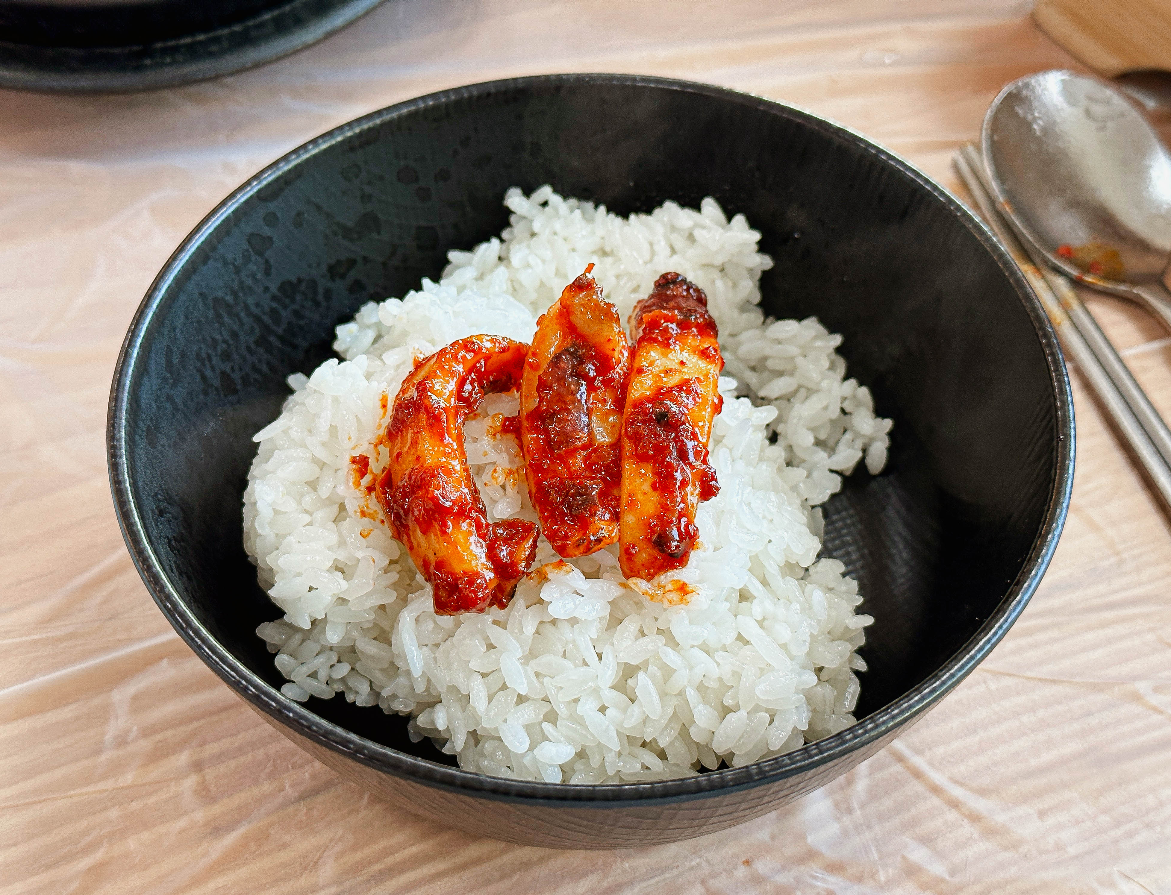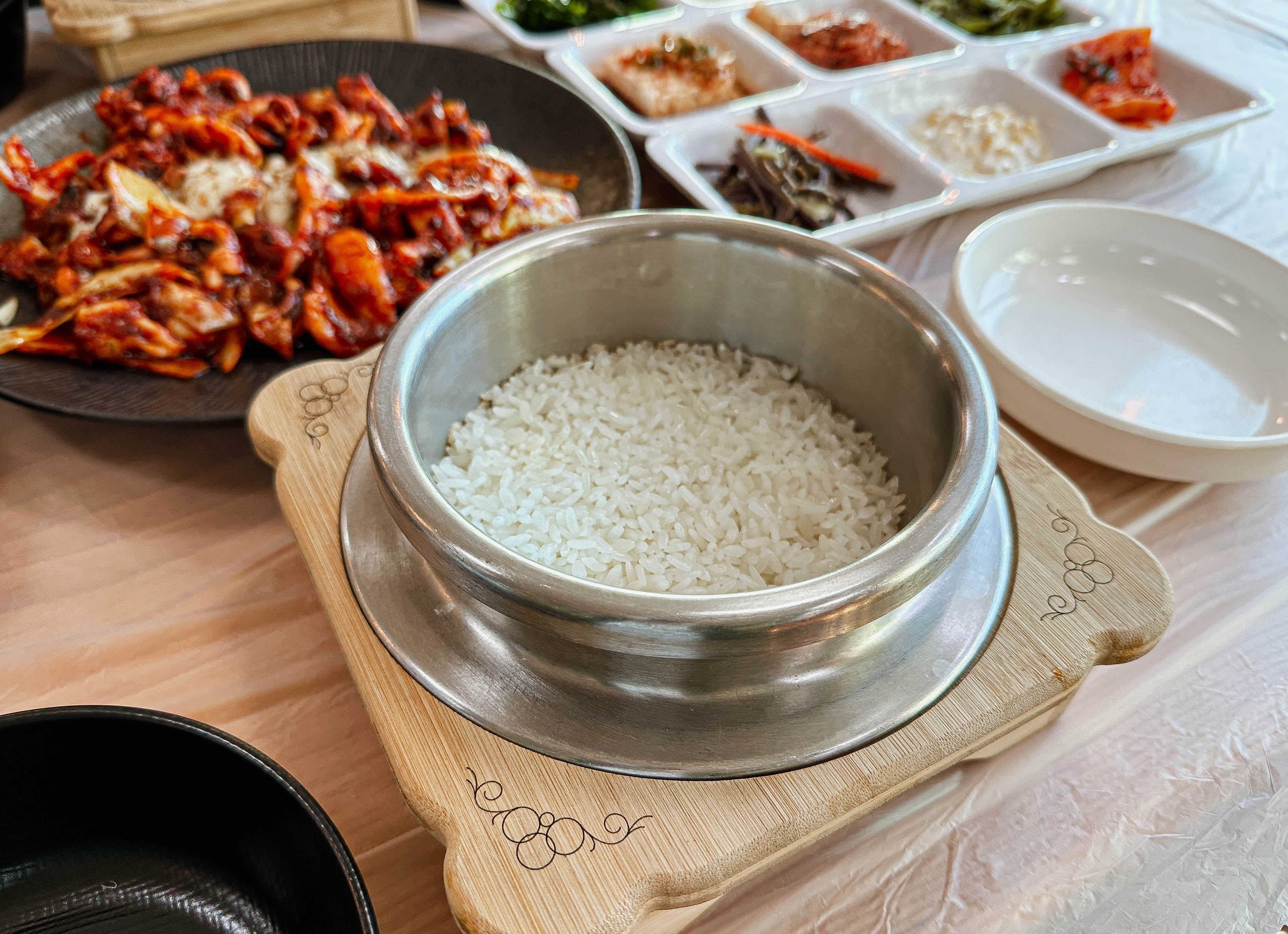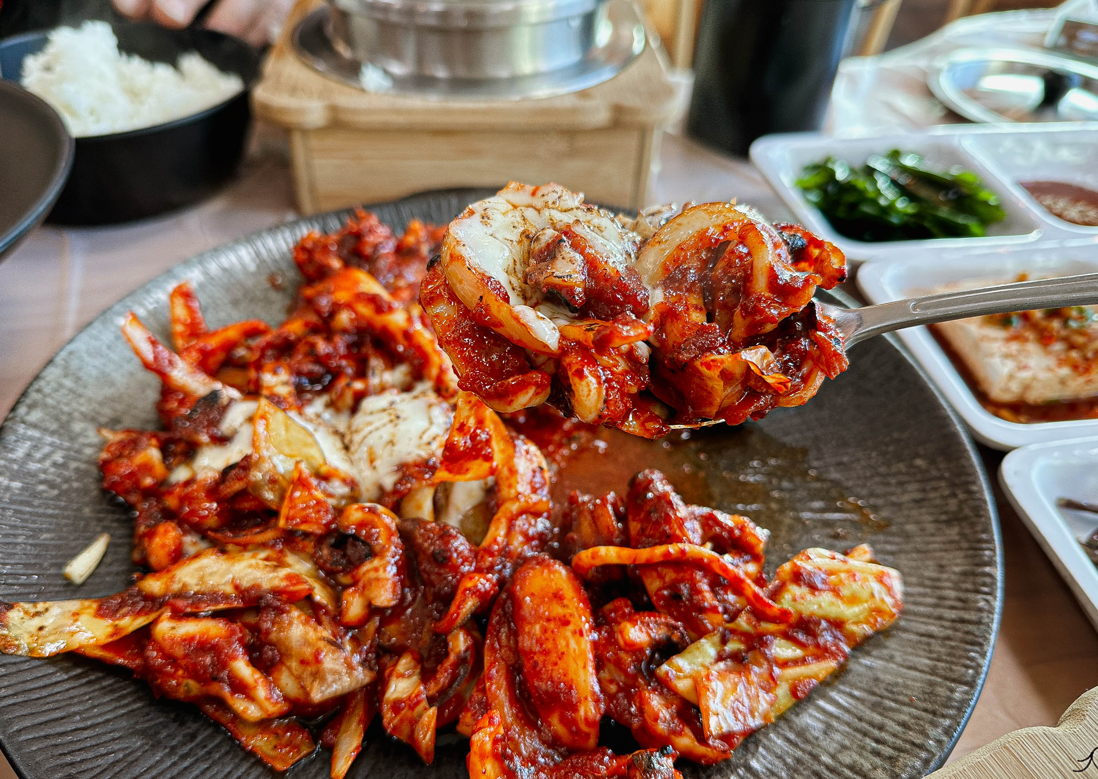 갓 지어서 솥에서 덜어낸 밥에 매콤한 불맛 나는 갑오징어볶음까지 정말 매콤하면서 당기는 맛이 계속 손이 가는 메뉴였습니다. 갑오징어의 탱글한 식감도 좋지만, 위에 올라간 치즈 덕분에 더 고소한 맛이 강조되어 맛이 좋았습니다.