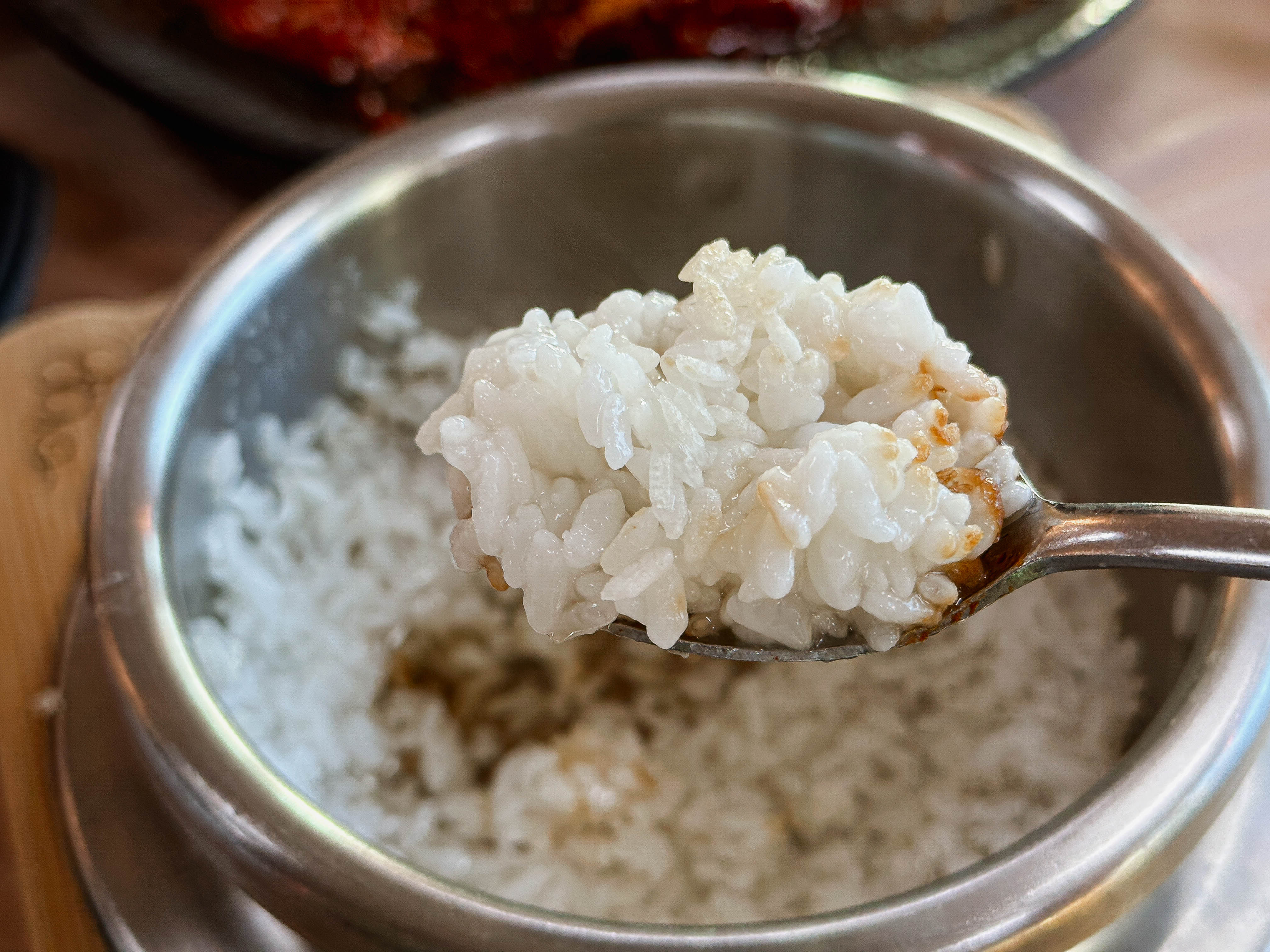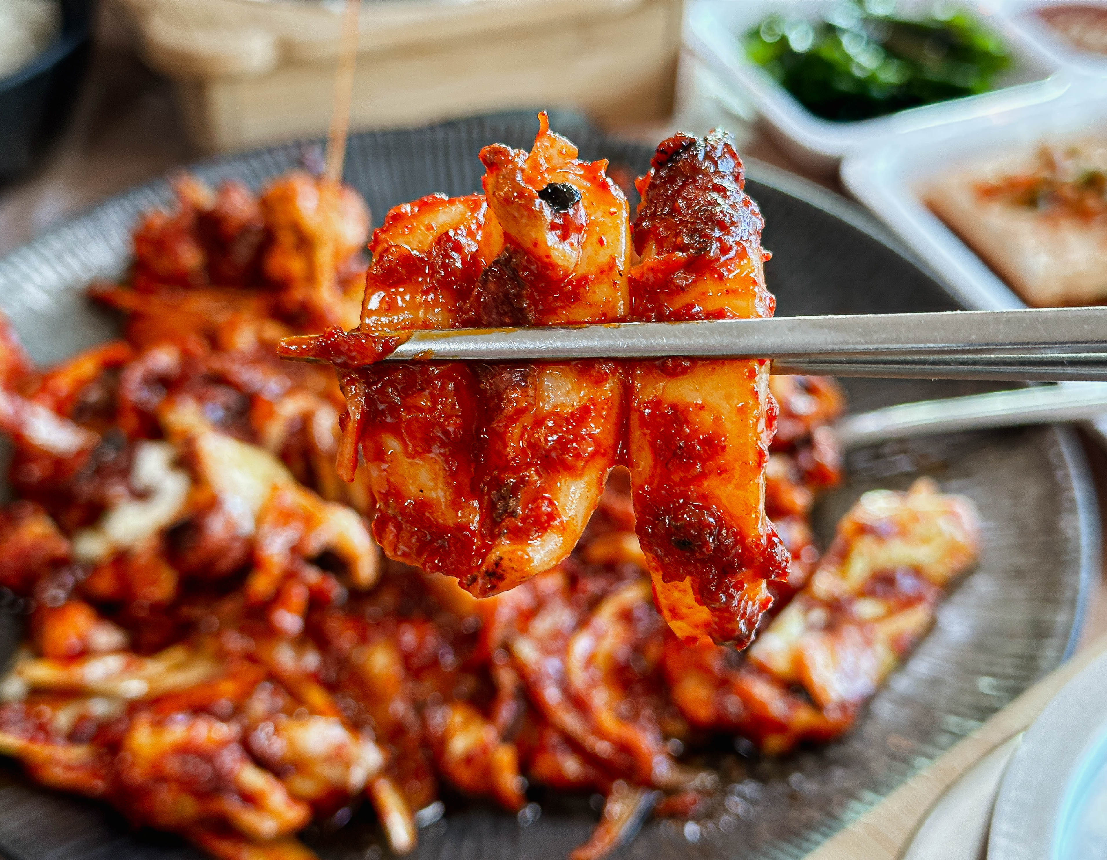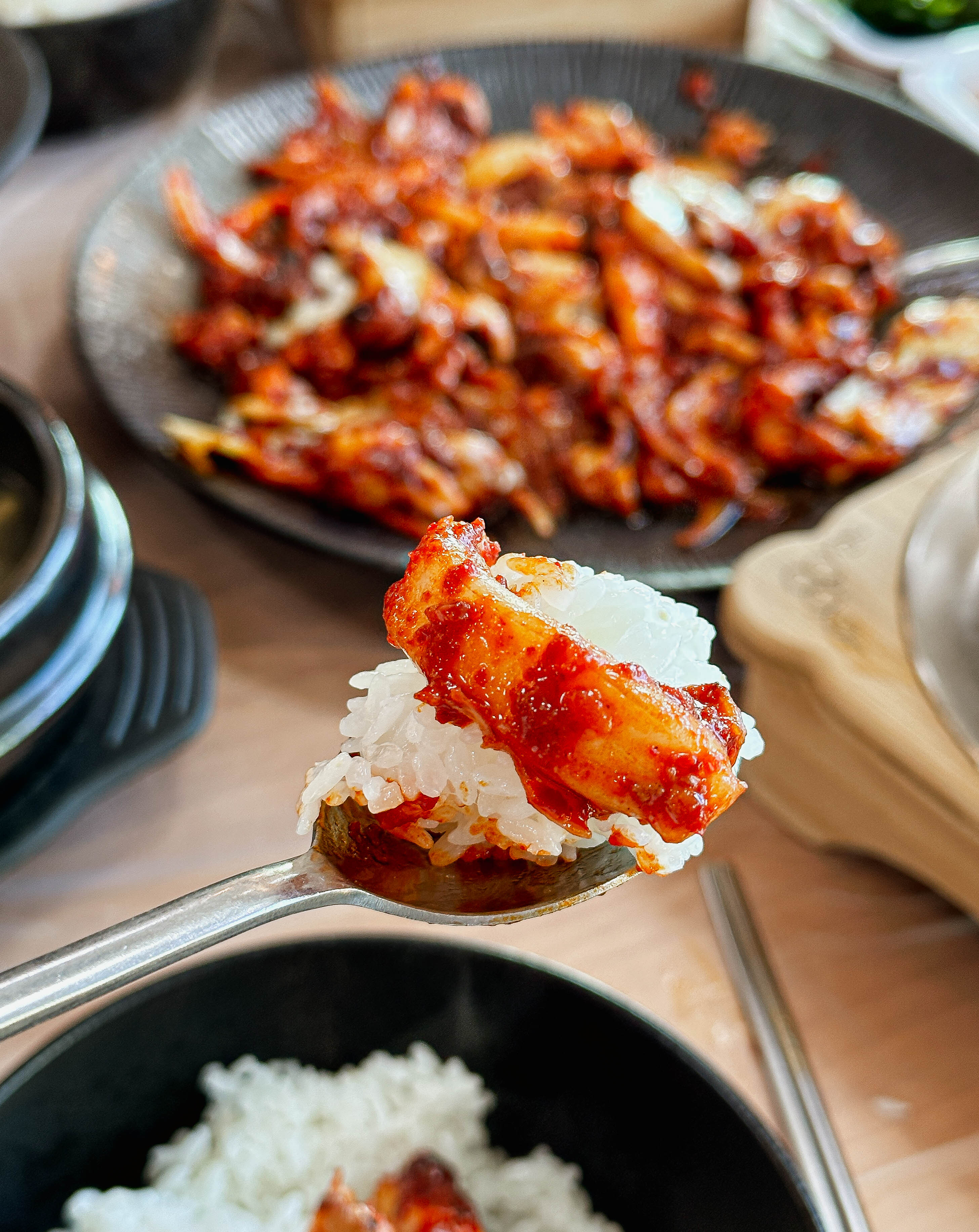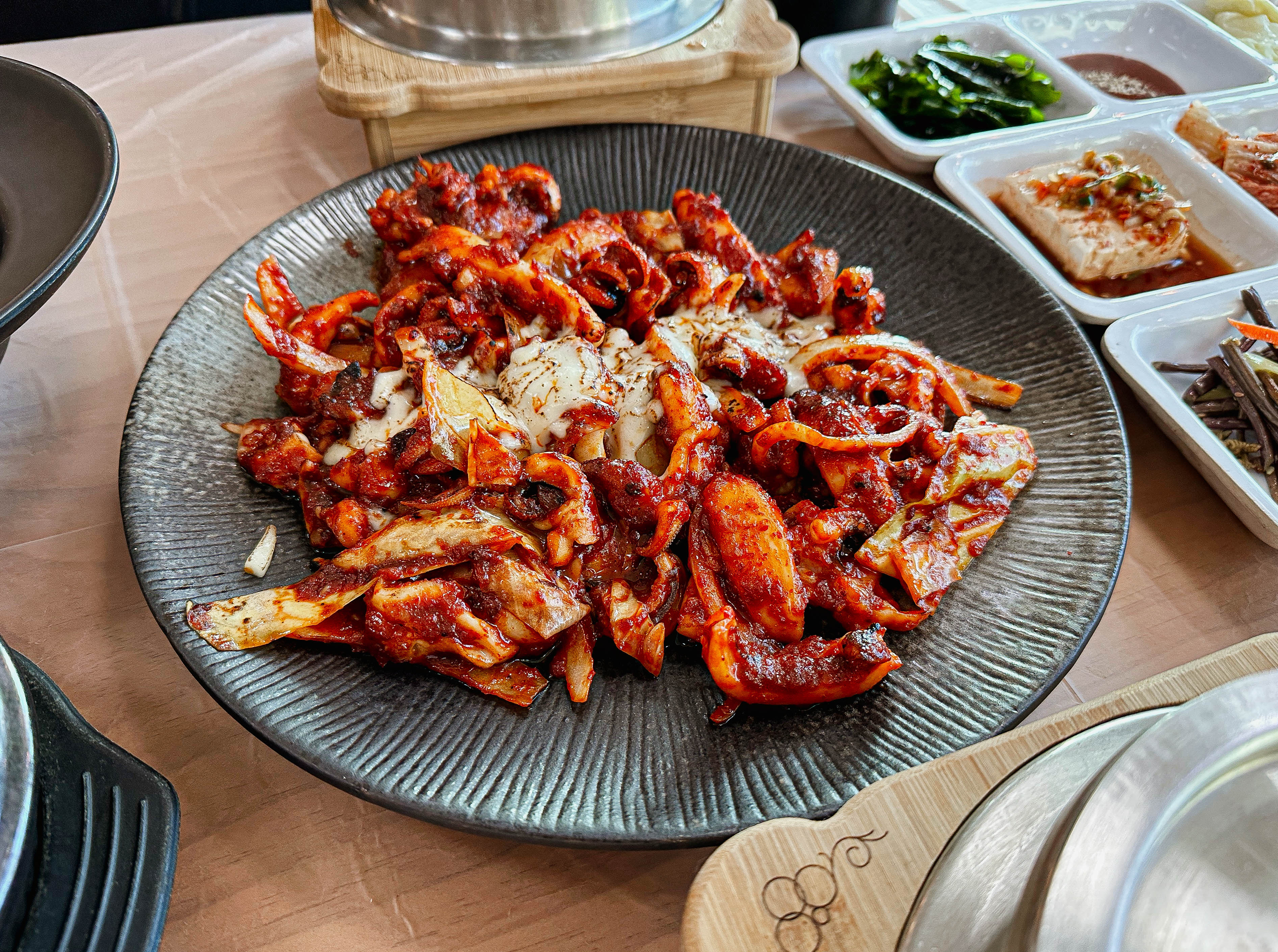 갓 지어서 솥에서 덜어낸 밥에 매콤한 불맛 나는 갑오징어볶음까지 정말 매콤하면서 당기는 맛이 계속 손이 가는 메뉴였습니다. 갑오징어의 탱글한 식감도 좋지만, 위에 올라간 치즈 덕분에 더 고소한 맛이 강조되어 맛이 좋았습니다.