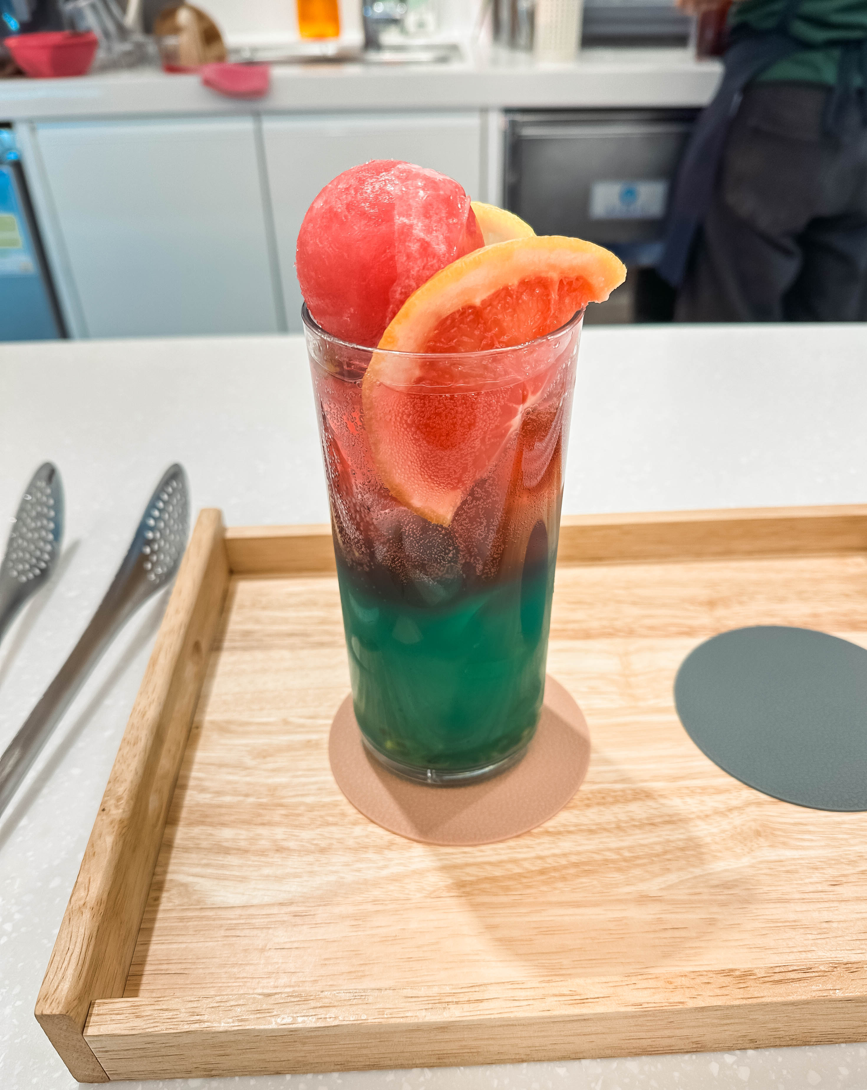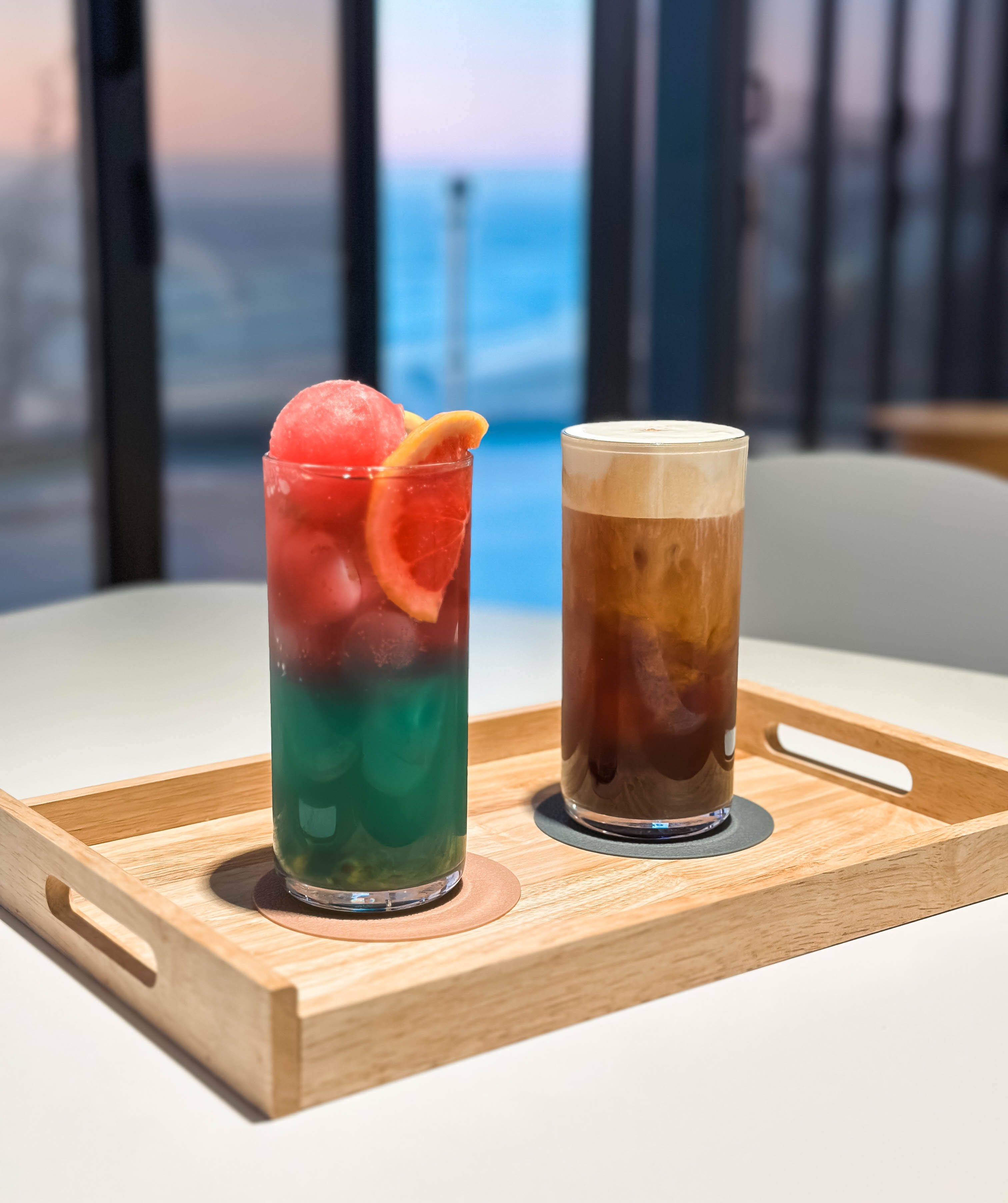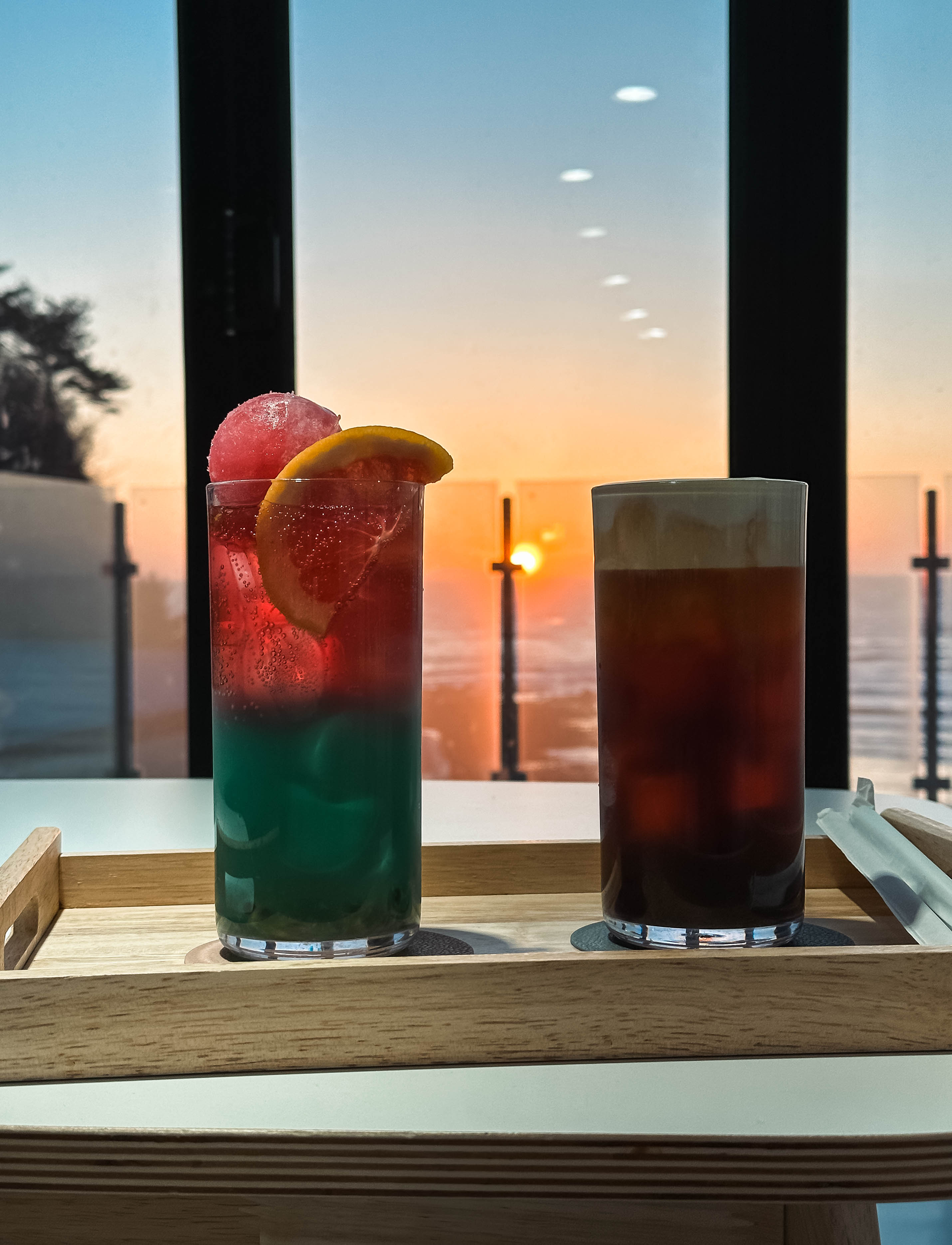 피엠뷰의 메뉴는 일반적인 카페와 비슷한 메뉴들로 구성되어 있었고, 가격은 5,000~7,5000원 사이였습니다. 저는 피엠뷰에서만 판매하는 메뉴를 먹고 싶어서 피엠뷰의 시그니쳐 메뉴인 '피엠뷰아인슈페너'와 '피엠뷰에이드'를 주문했습니다. 둘 중에 가장 돋보이는 메뉴는 단연 피엠뷰에이드였는데, 서해로 떨어지는 일몰을 연상케 하는 에이드는 푸른색과 붉은색 반으로 나뉜 에이드에 태양을 상징(?)하는 동그란 얼음이 올라간 모습이었습니다.