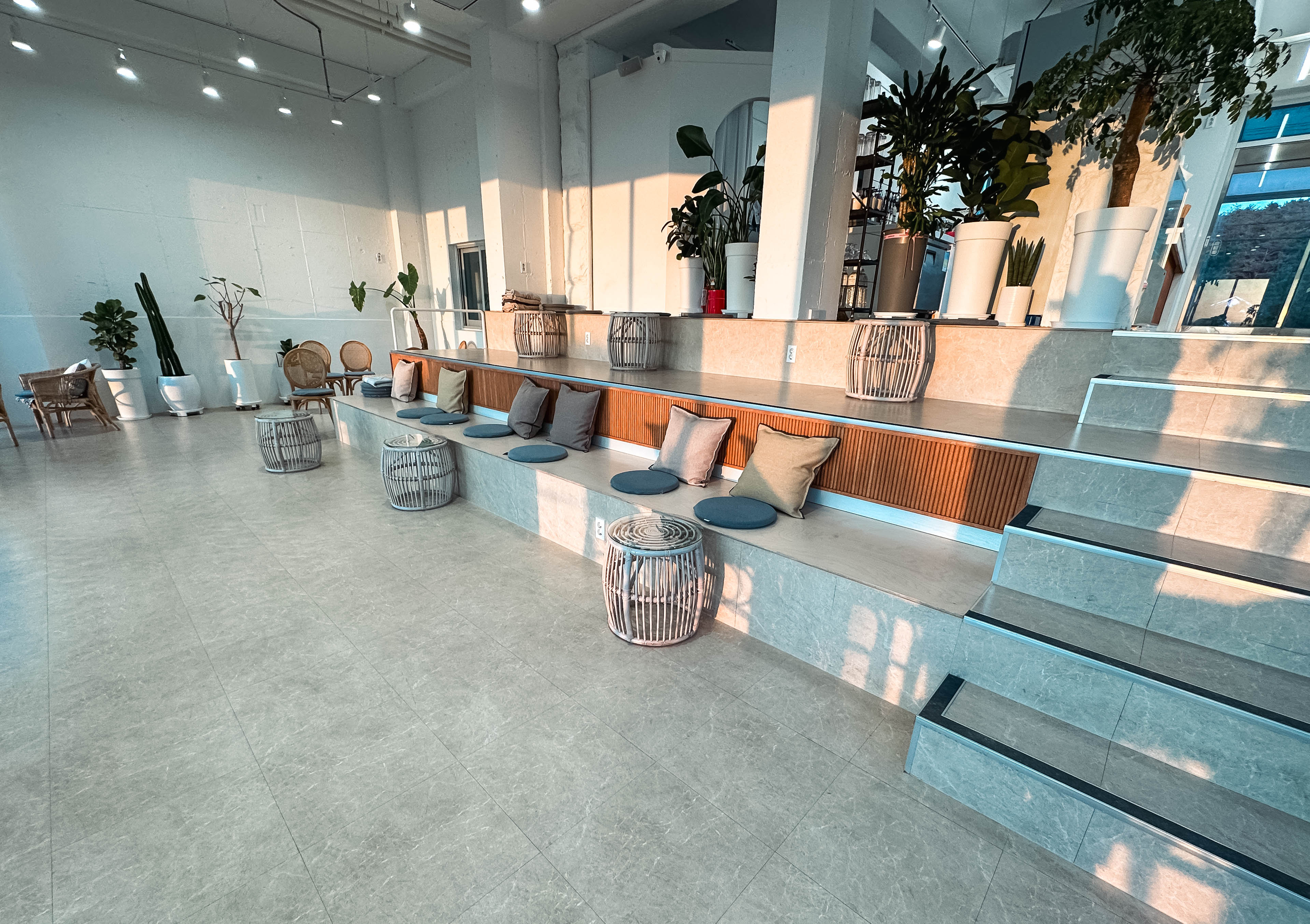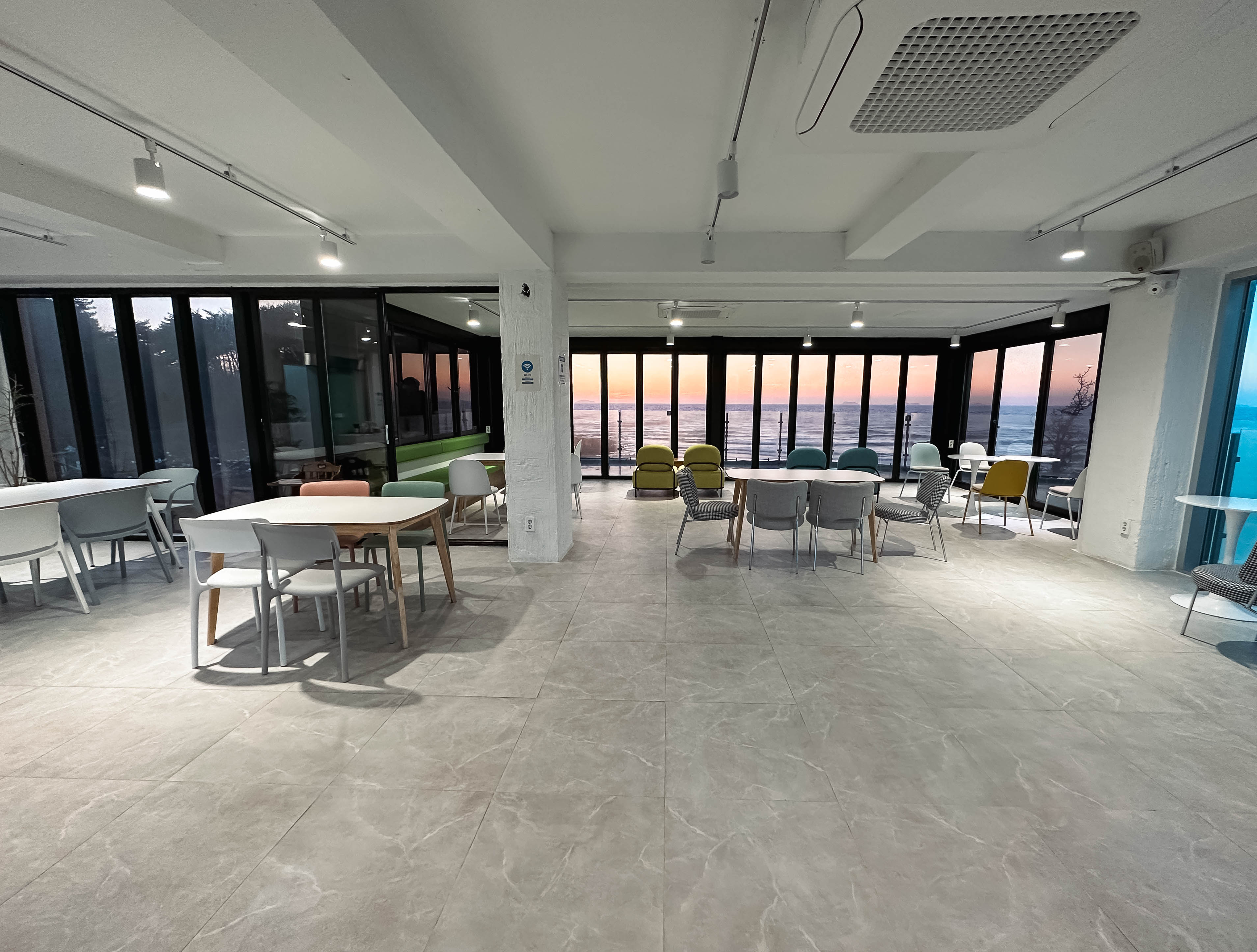 안면도 피엠뷰는 2.5층 규모로 구성된 가게입니다. 주차장에 주차를 하고 들어가면 계단식으로 된 의자가 있었고, 계단을 따라서 반층 올라가면 메뉴를 주문할 수 있었습니다. 저희는 메뉴를 주문하고 2층으로 올라갔는데, 확실히 2층의 전망이 더 멋지더라고요.
