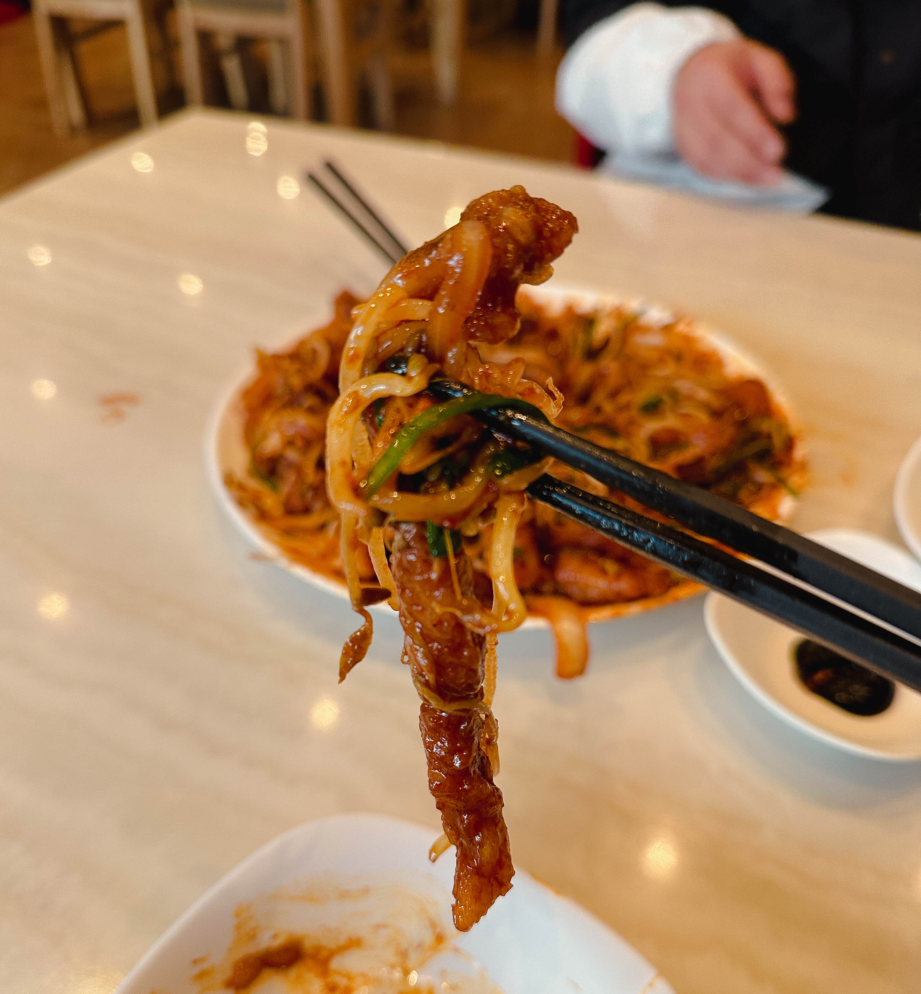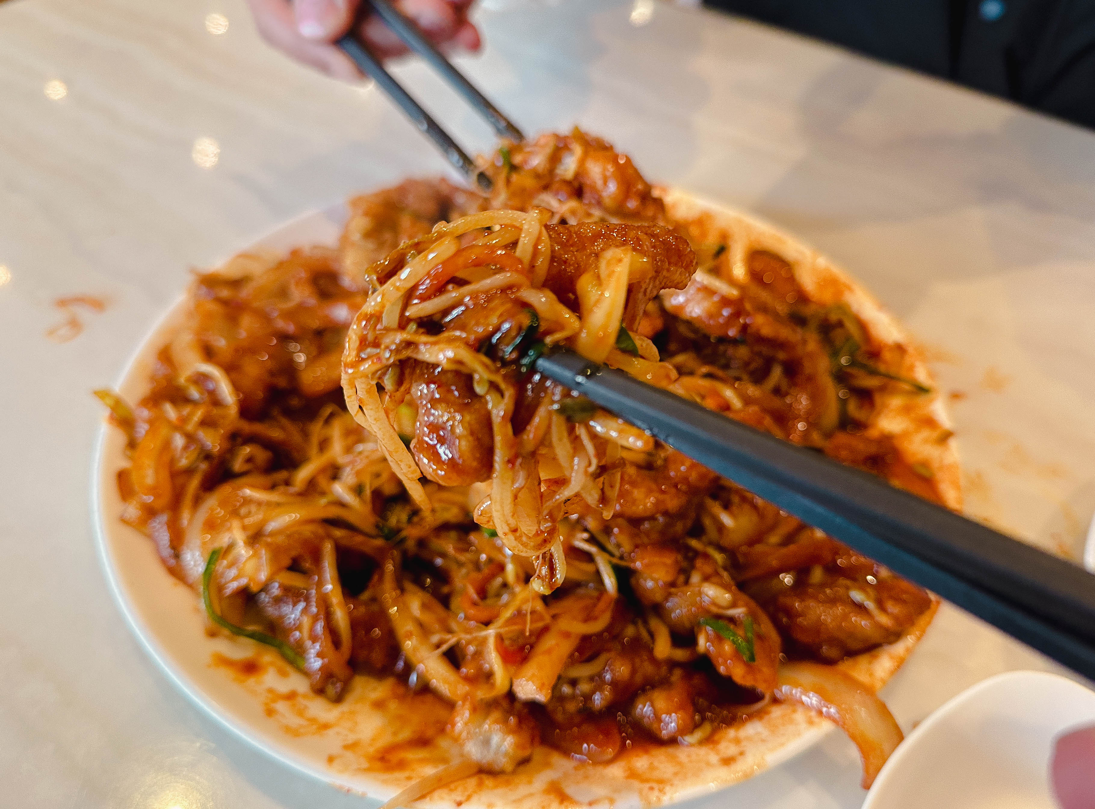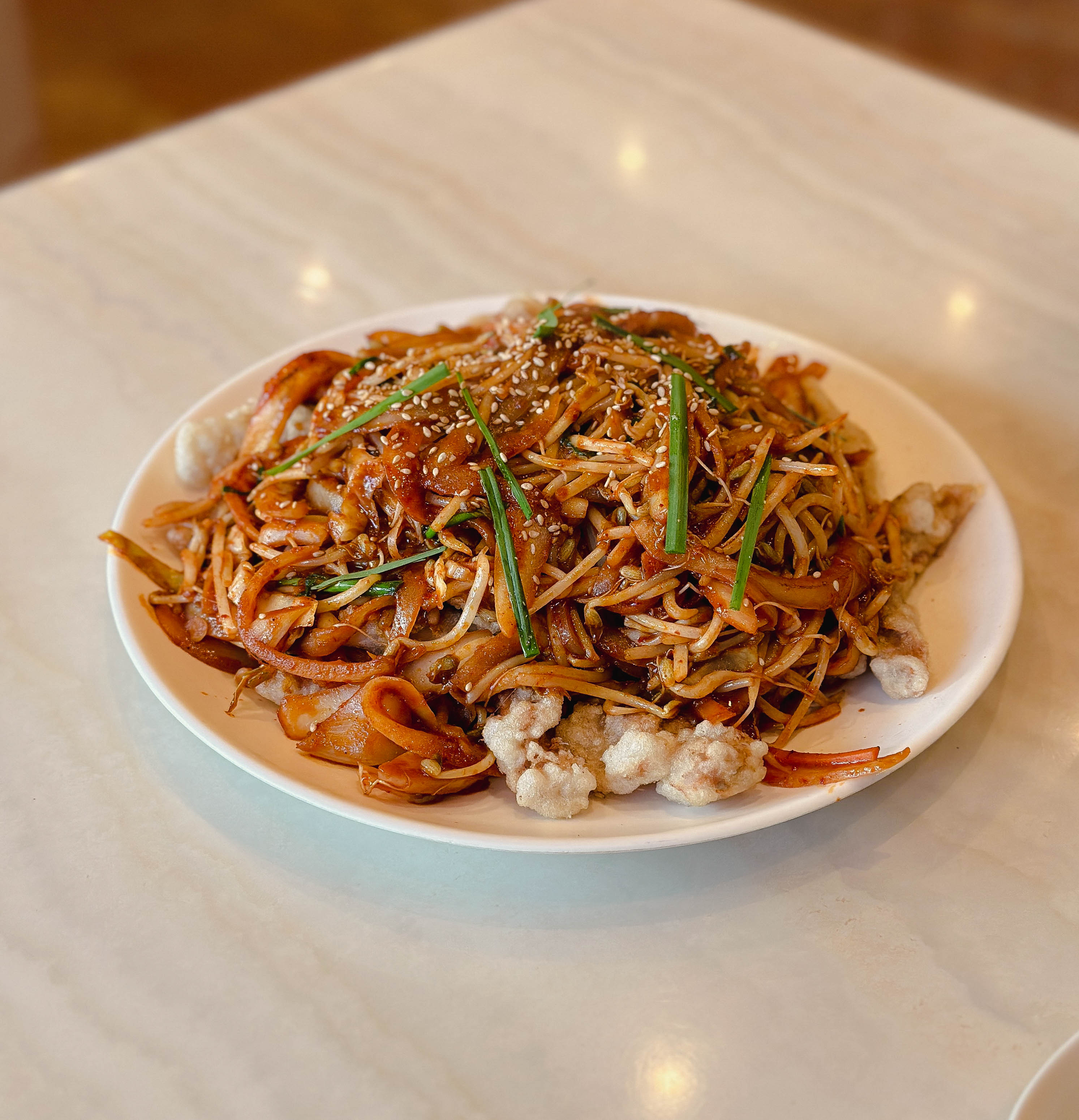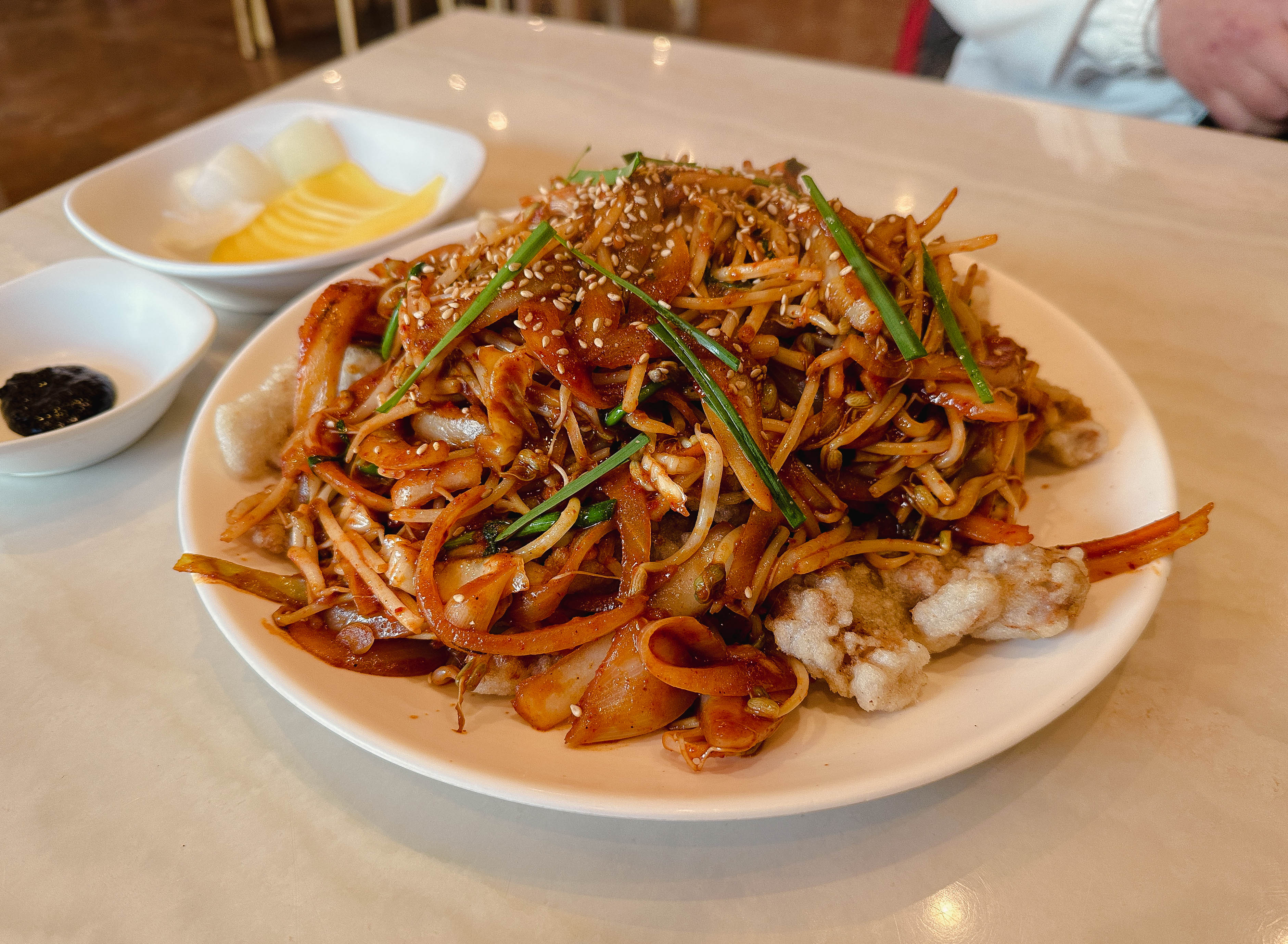 푸름각의 탕수육찜은 아구찜과 비슷한 느낌이었는데, 엄밀히 따지면 아귀찜은 아니고 불맛 나는 돼지고기숙주볶음을 탕수육 위에 얹은 메뉴였습니다. 사실 탕수육찜이라길래 많은 기대하고 방문했는데, 생각했던 모습과는 사뭇 다른 모습이어서 조금 실망했습니다.