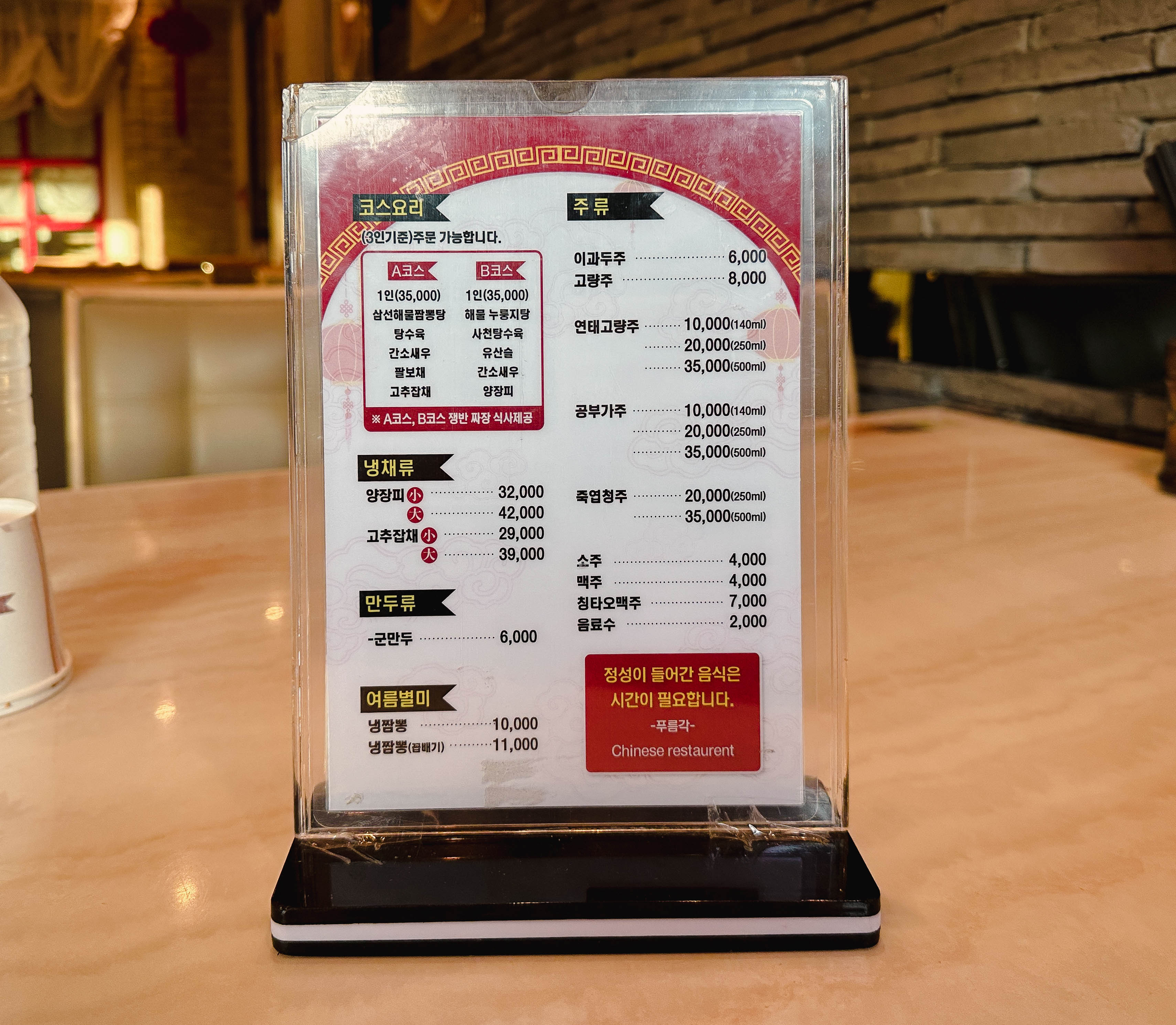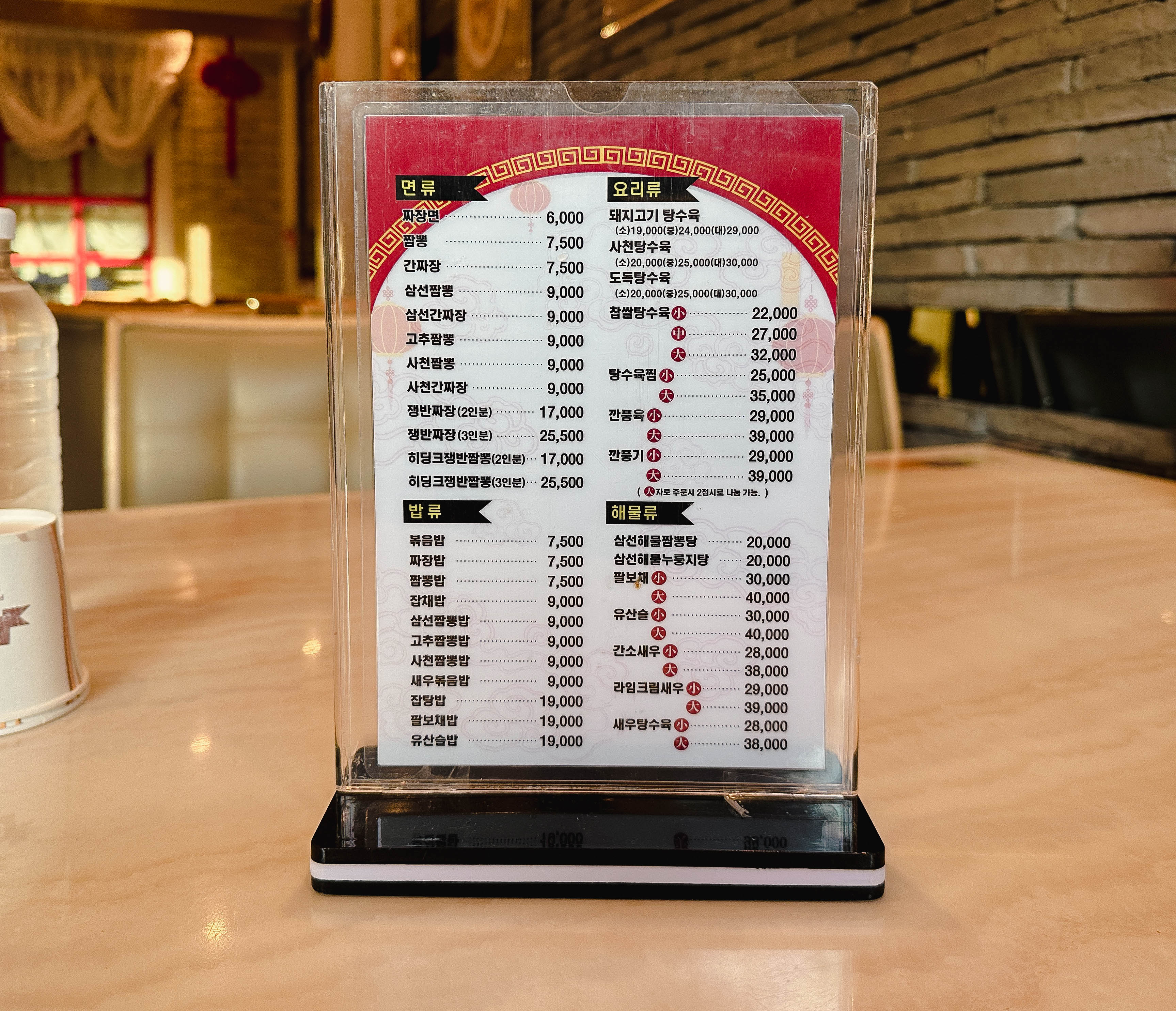 메뉴는 짜장면, 짬뽕, 간짜장, 삼선짬뽕, 삼선간짜장, 고추짬뽕, 사천짬뽕, 사천간짜장, 쟁반짜장, 히딩크쟁반짬뽕, 볶음밥, 짜장밥, 짬뽕밥, 잡채밥, 삼선짬뽕밥, 고추짬뽕밥, 사천짬뽕밥, 새우볶음밥, 잡탕밥, 팔보채밥, 유산슬밥, 돼지고기탕수육, 사천탕수육, 도독탕수육(독도탕수육), 찹쌀탕수육, 탕수육찜, 깐풍육, 깐풍기, 삼선해물짬뽕탕, 삼선해물누룽지탕, 팔보채, 유산슬, 간소새우, 라임크림새우, 새우탕수육, 양장피, 고추잡채, 군만두, 냉짬뽕 등이 있었습니다.