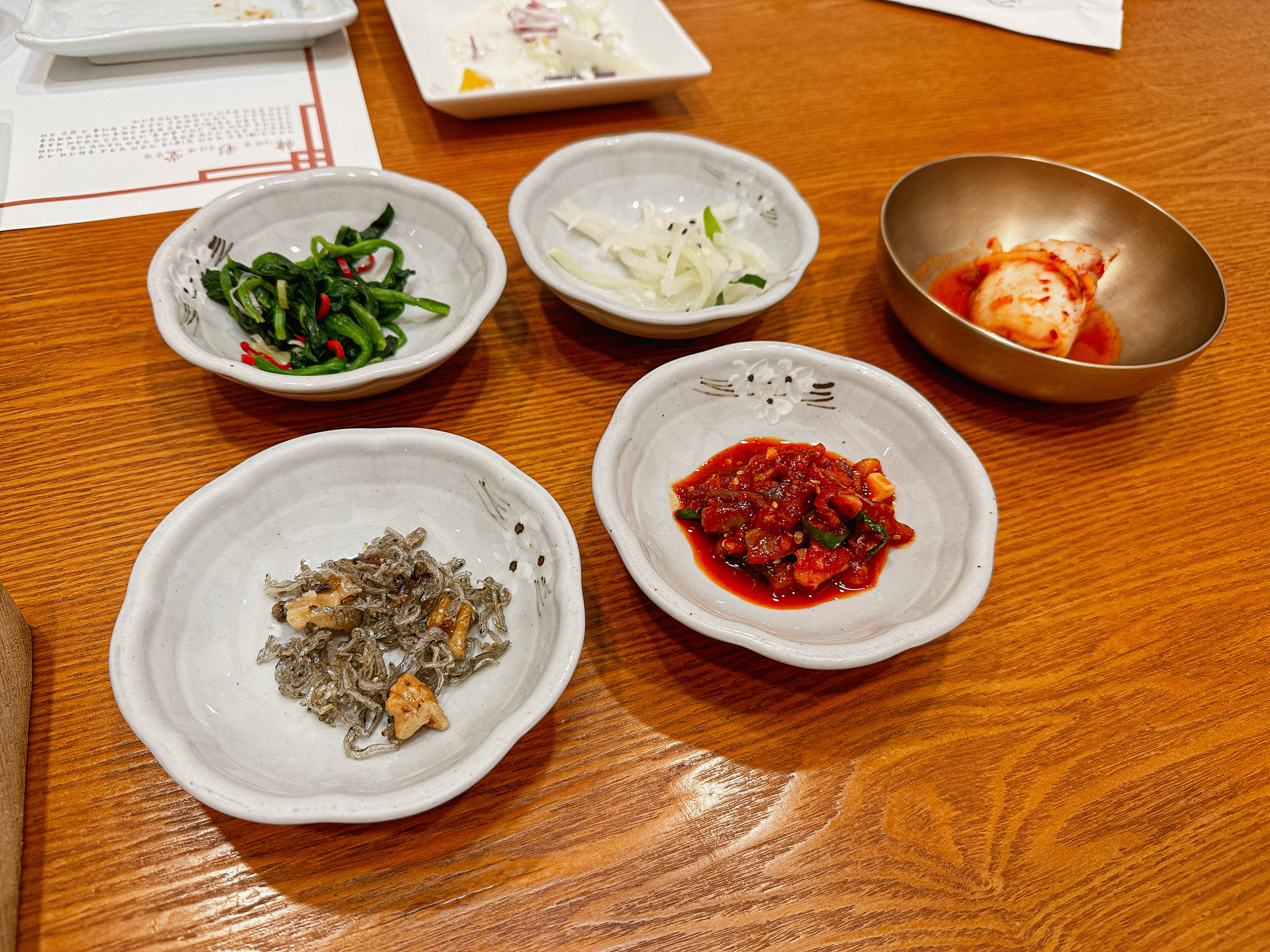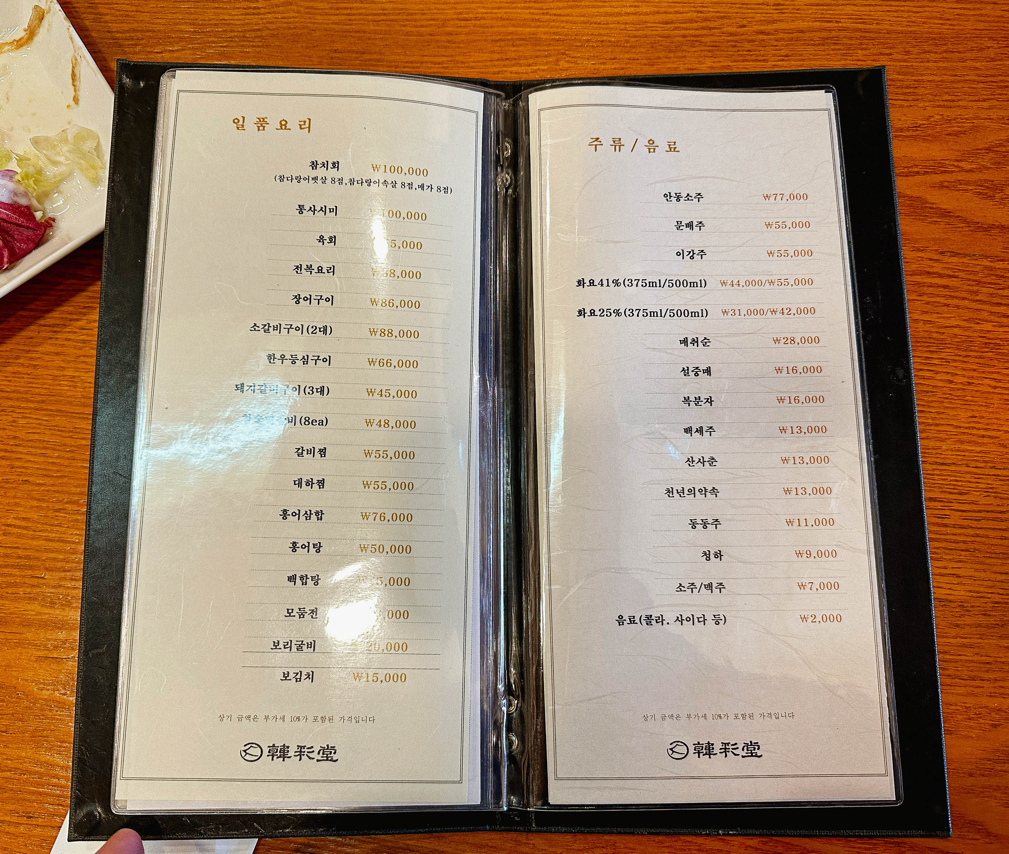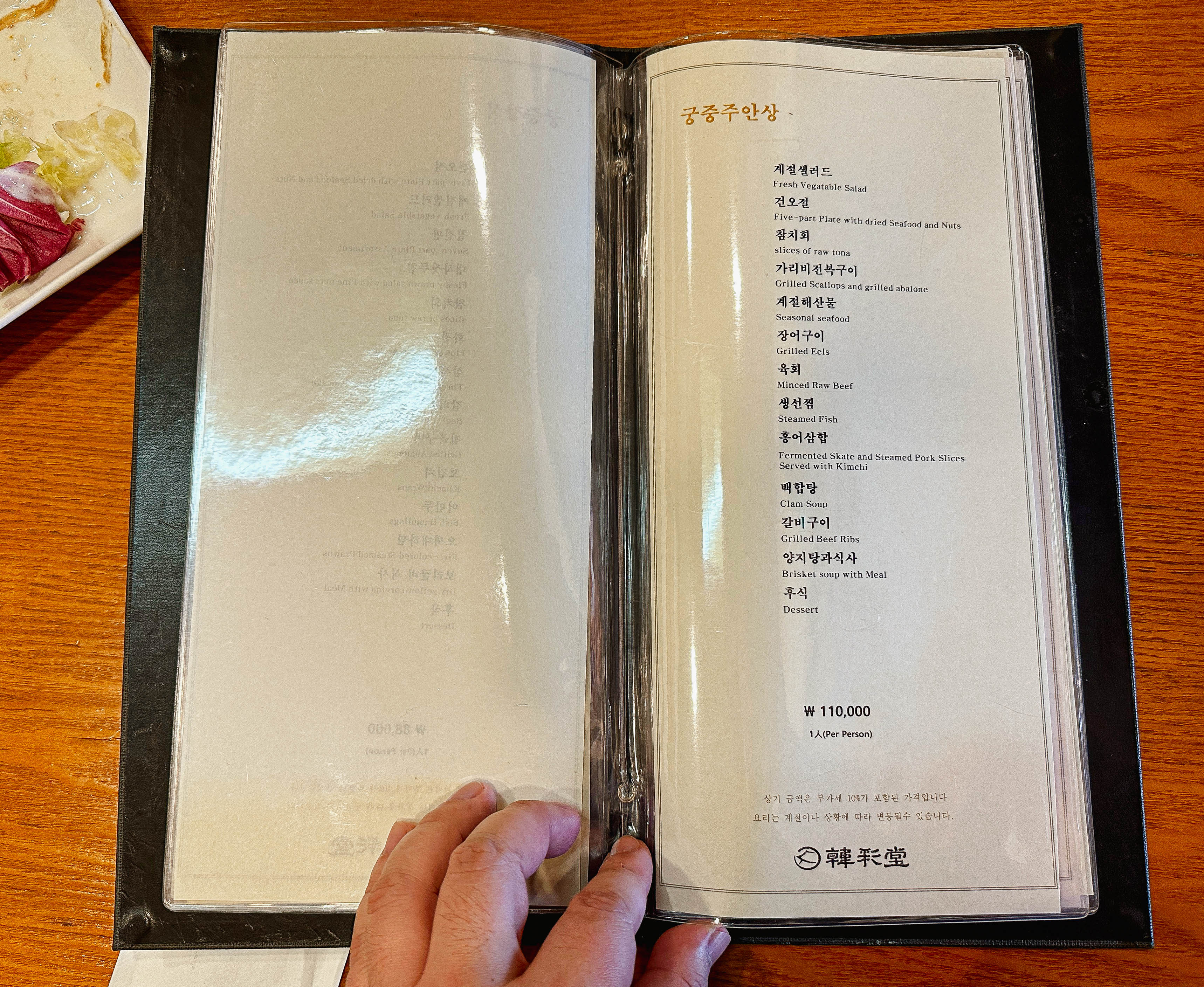 한채당의 메뉴는 양반정식, 사대부정식, 사대부주안상, 궁중정식, 궁중주안상, 수라상, 일품요리가 있었습니다. 저랑 친구는 원래 '수라상(1인 17만 원)'을 주문하려고 했는데, 수라상은 예약을 해야 주문할 수 있다고 해서 한단계 아랫등급인 '궁중주안상(1인 11만 원)'을 선택했습니다.