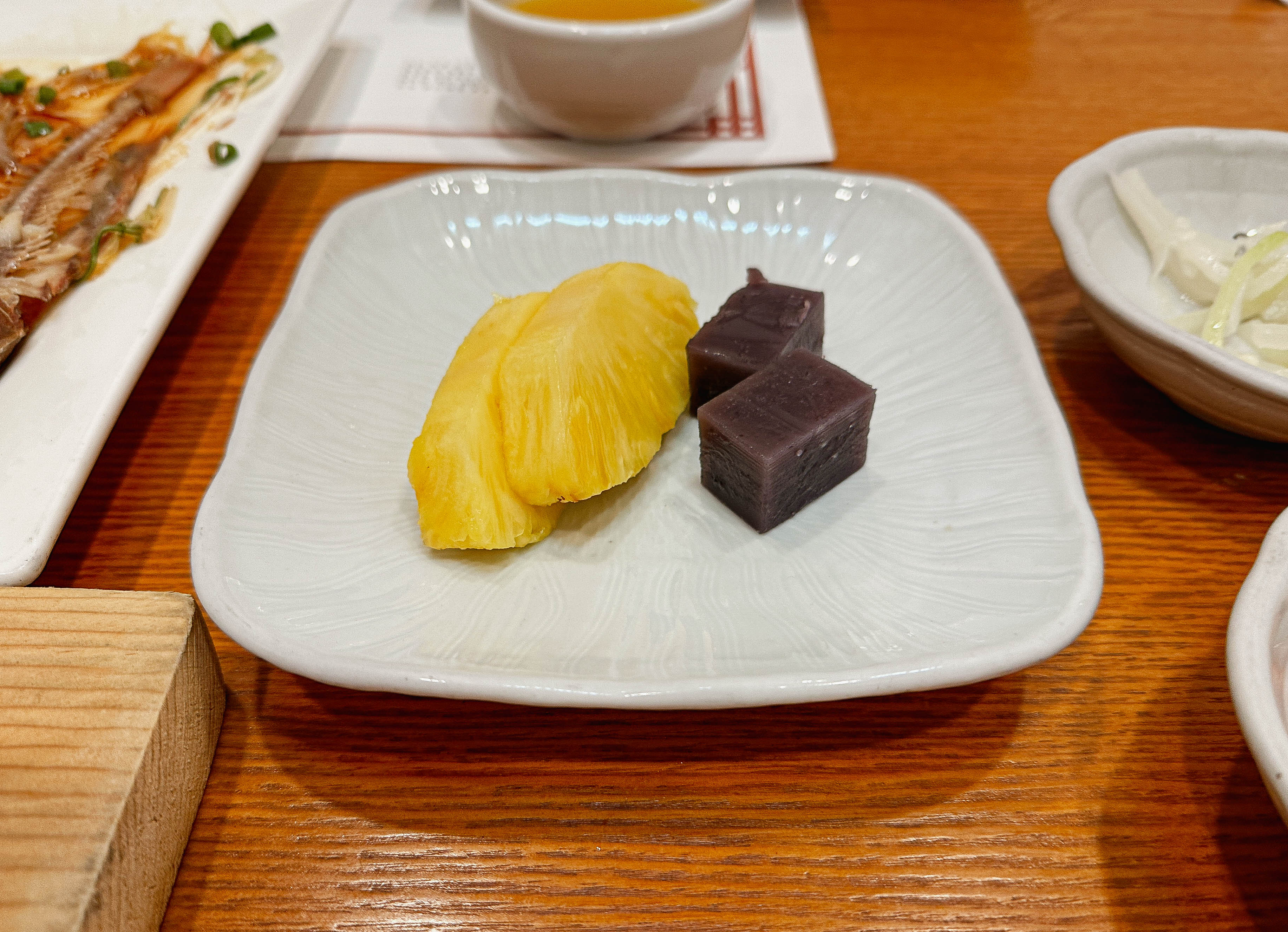 후식은 파인애플과 포도맛(?) 양갱, 단호박식혜가 나왔습니다. 다른 메뉴들과 마찬가지로 후식도 너무 달거나 하지 않아서 먹기에 좋았습니다. 1인 11만원짜리 메뉴인 한채당 궁중주안상은 전체적으로 퀄리티가 좋았고, 직원의 서비스도 가게 분위기에 걸맞게 친절하셨습니다. 친구와의 식사였지만, 가족식사를 위해서도 한 번쯤 다시 방문할 의향이 있는 가게였습니다. 주차공간이 조금 불편해서 그렇지 전체적으로 만족스러운 식사와 서비스의 가게였습니다.
