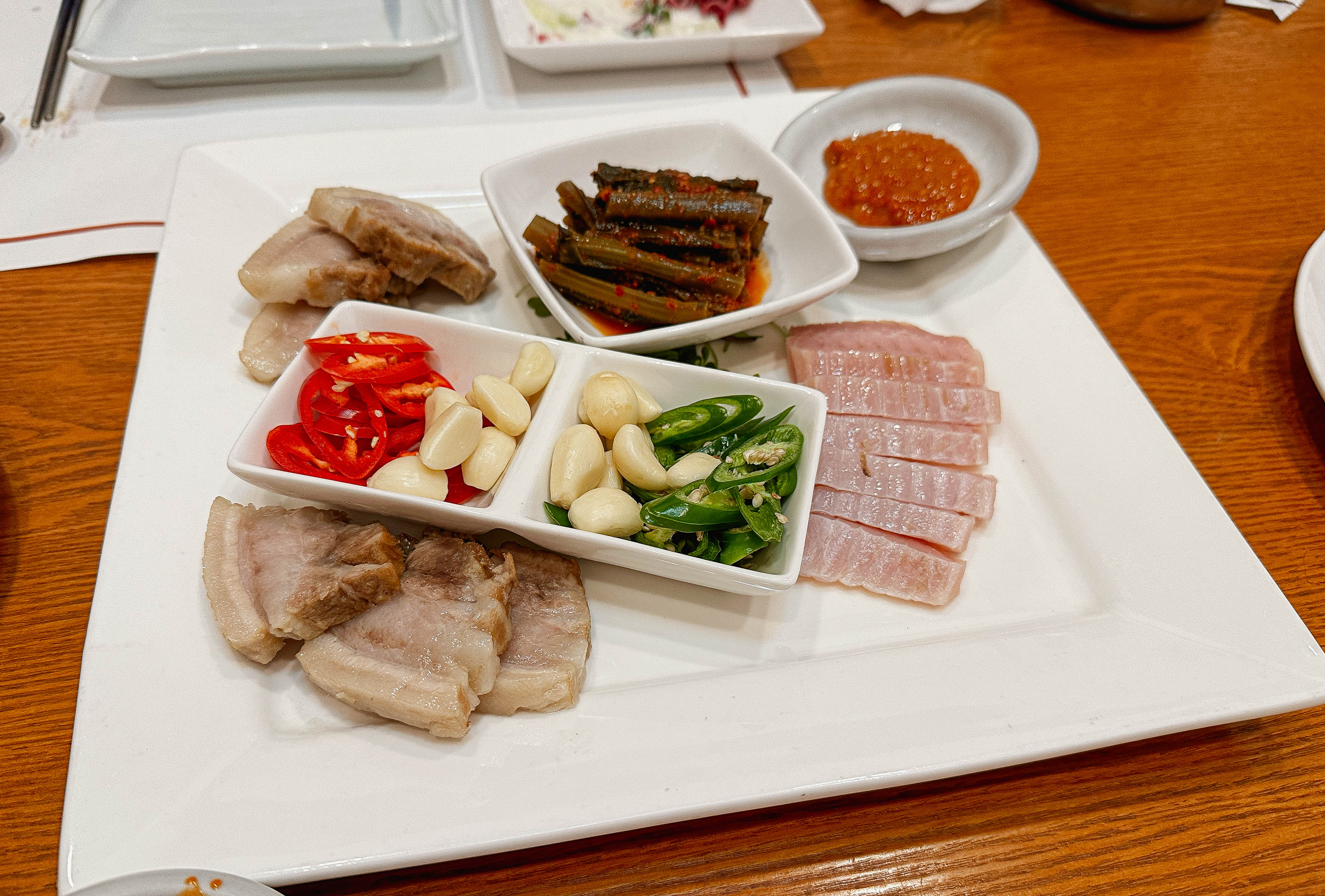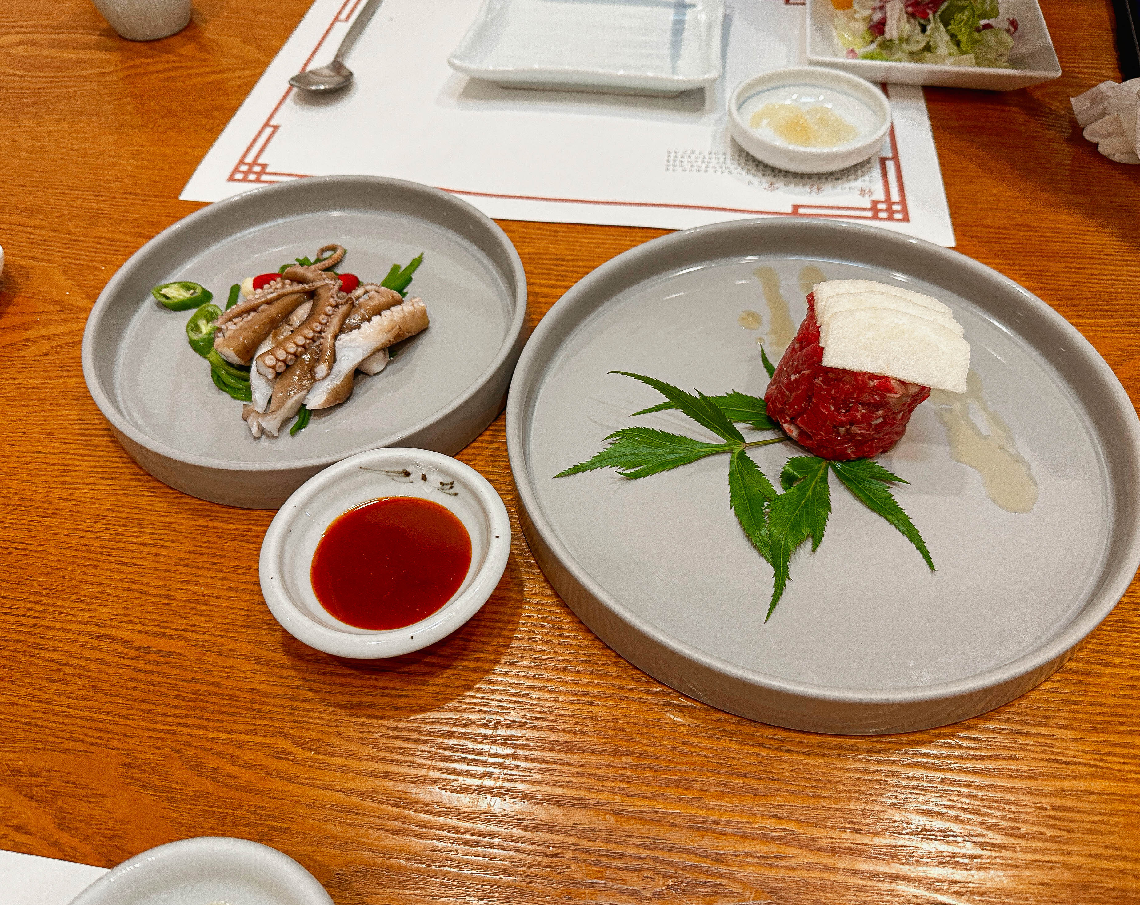 하남 한채당의 메뉴가 차례대로 나오기 시작했습니다. 먼저, 계절샐러드, 건오절, 참치회, 육회, 계절해산물을 소개해드리겠습니다. 양은 조금씩 나왔는데 다양한 메뉴가 등장해서 괜찮았습니다. 메뉴들은 전체적으로 깔끔하고 맛이 좋았습니다. 육회같은 경우에도 뷔페에서 먹으면 너무 달기만 해서 좀 아쉬웠는데, 육회의 양념도 너무 달지않아서 좋았습니다.