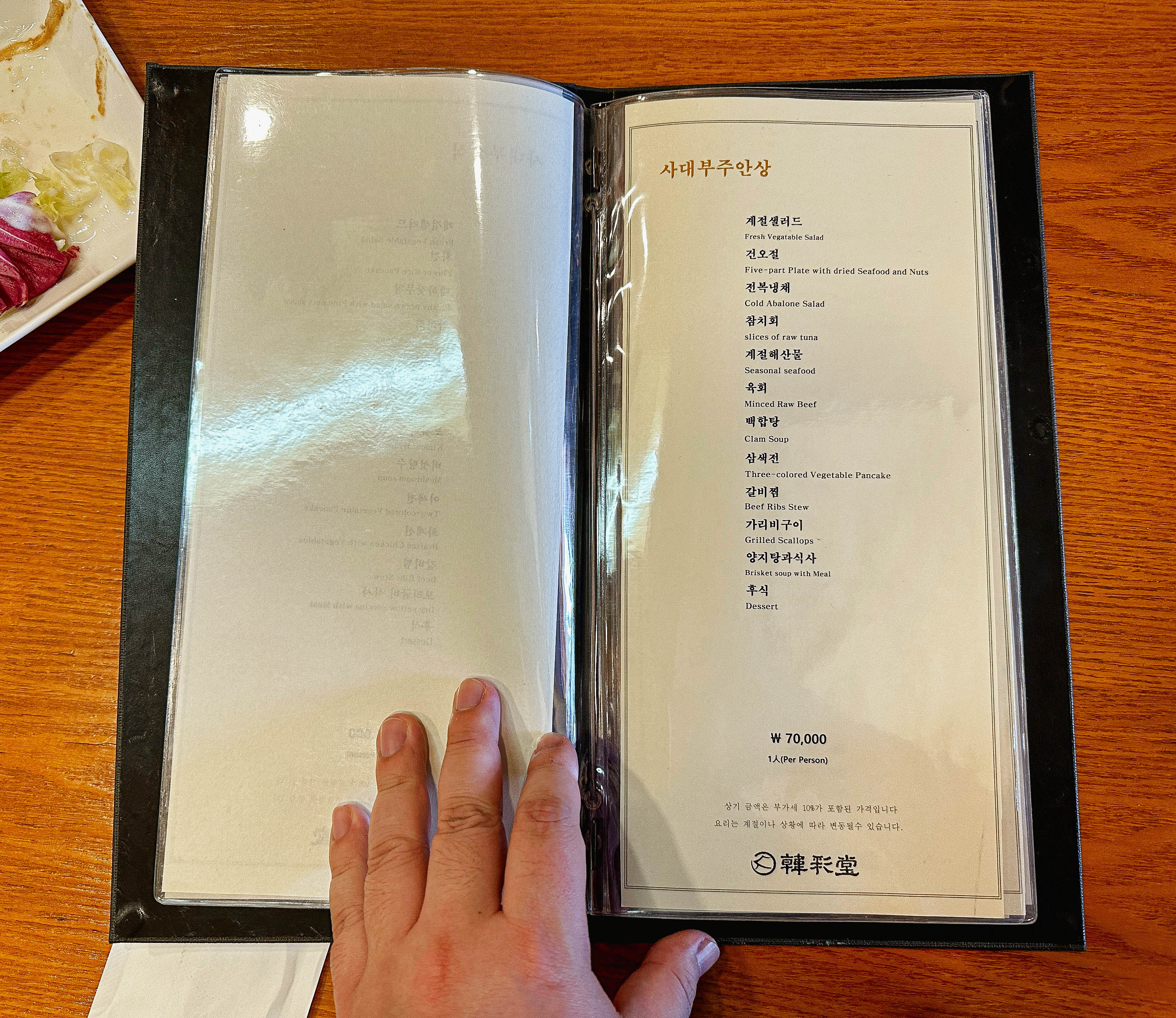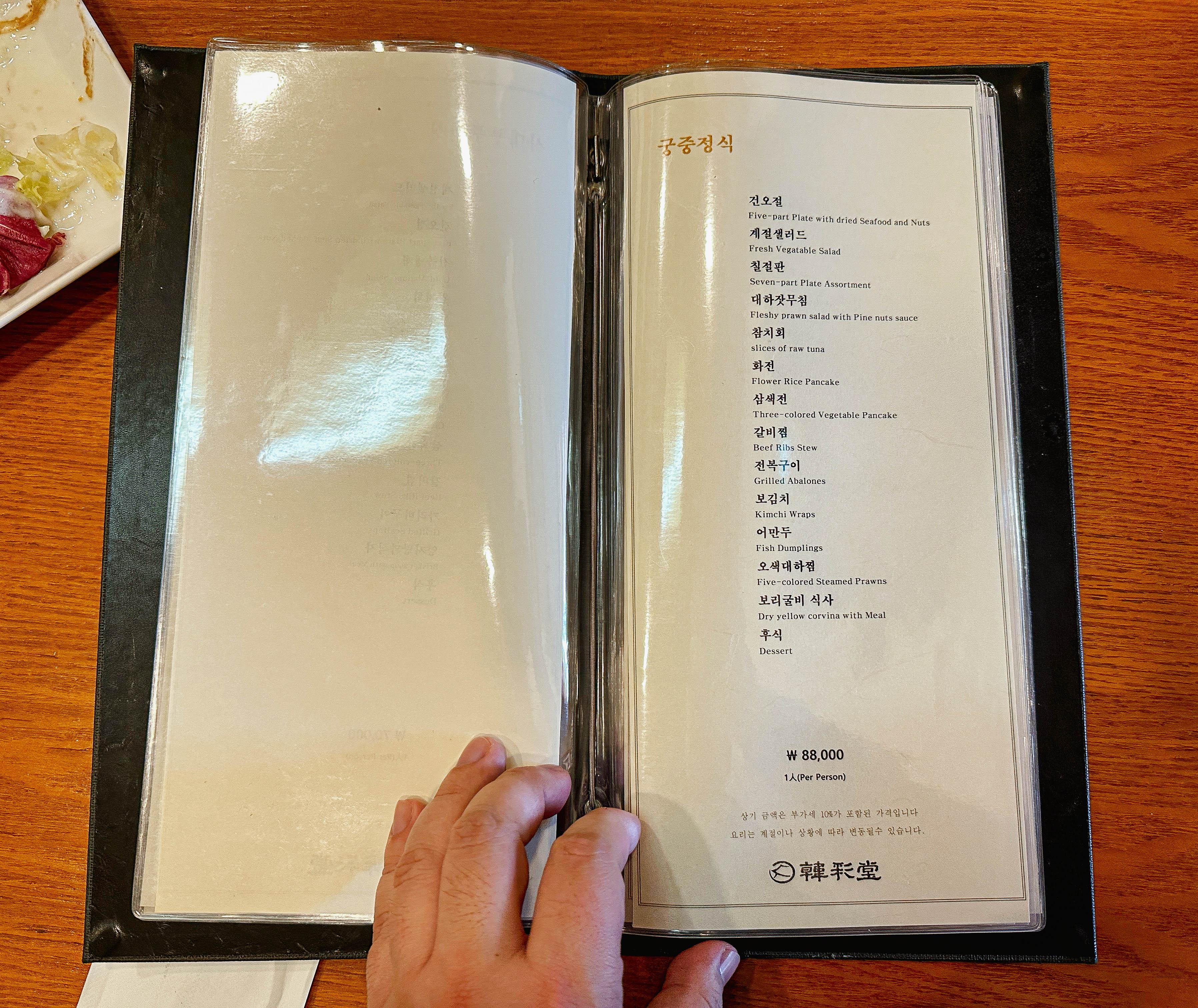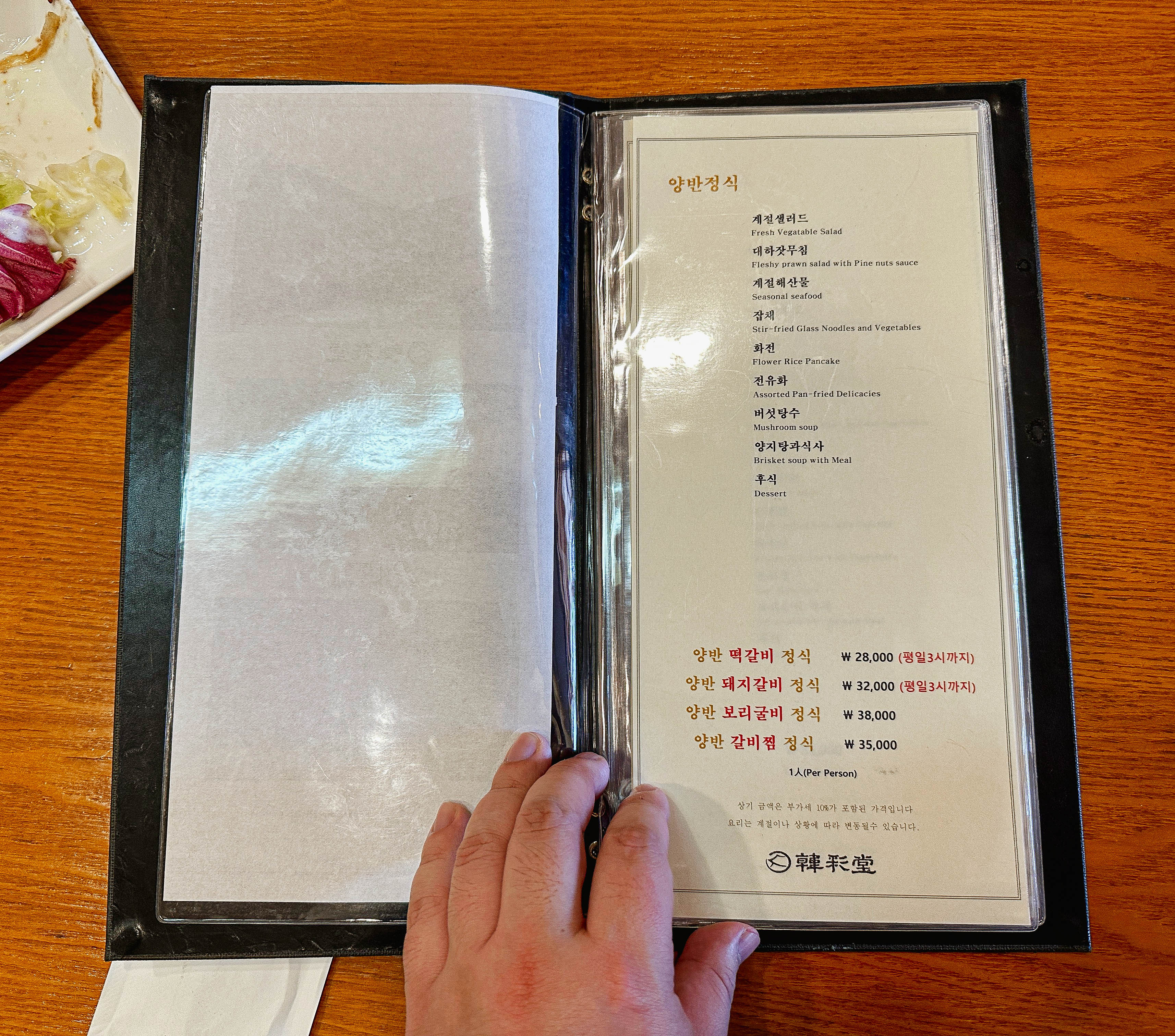 한채당의 메뉴는 양반정식, 사대부정식, 사대부주안상, 궁중정식, 궁중주안상, 수라상, 일품요리가 있었습니다. 저랑 친구는 원래 '수라상(1인 17만 원)'을 주문하려고 했는데, 수라상은 예약을 해야 주문할 수 있다고 해서 한단계 아랫등급인 '궁중주안상(1인 11만 원)'을 선택했습니다.
