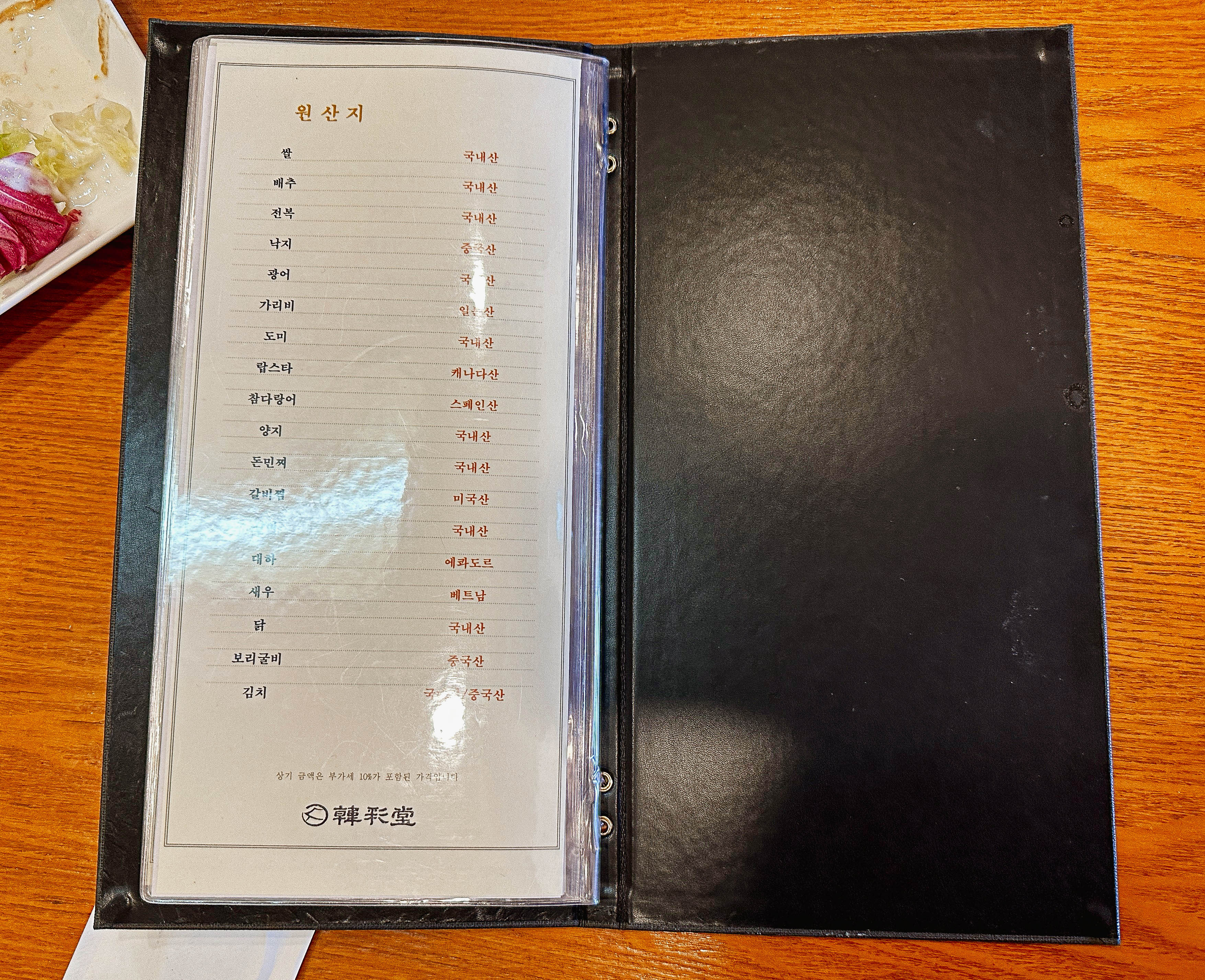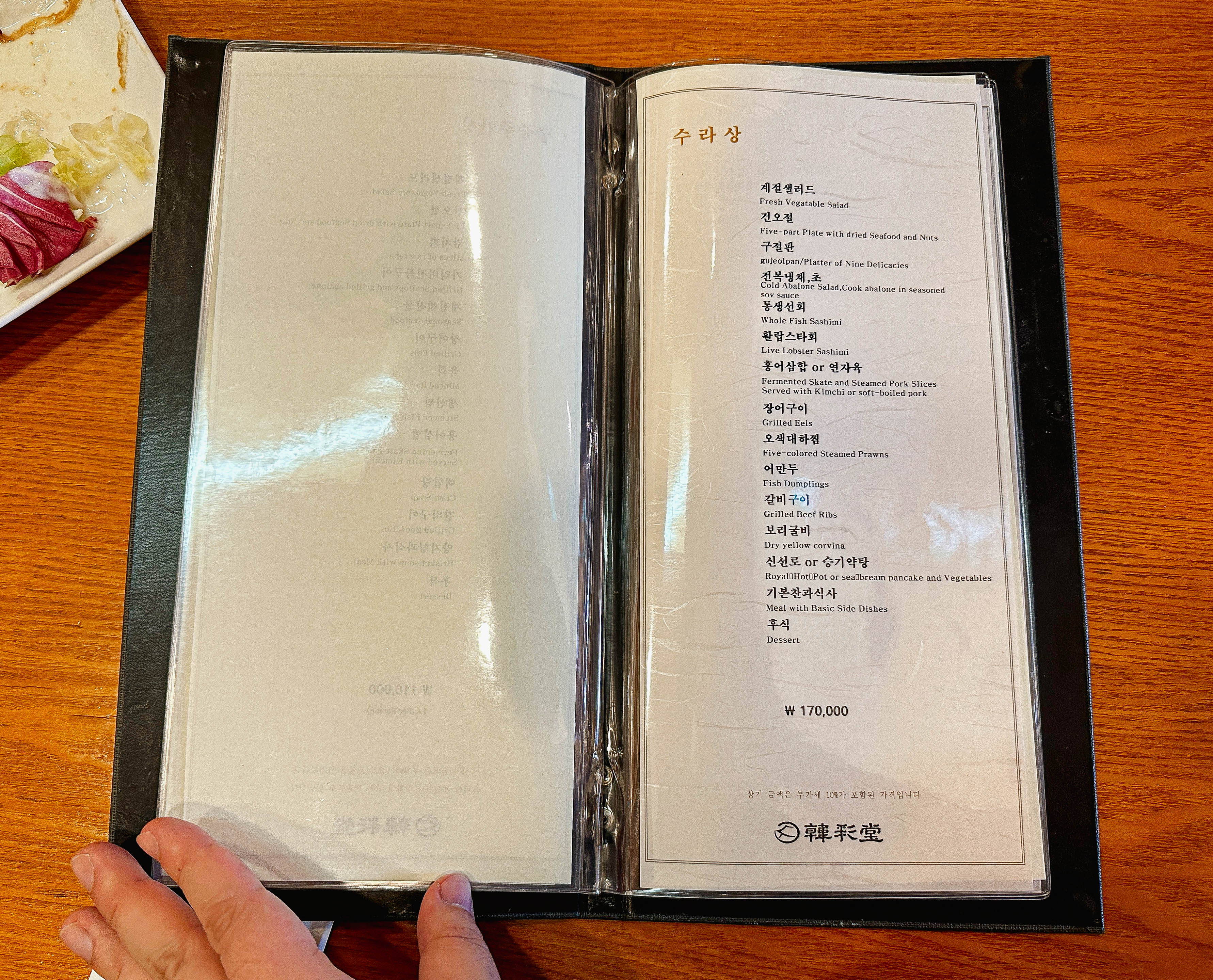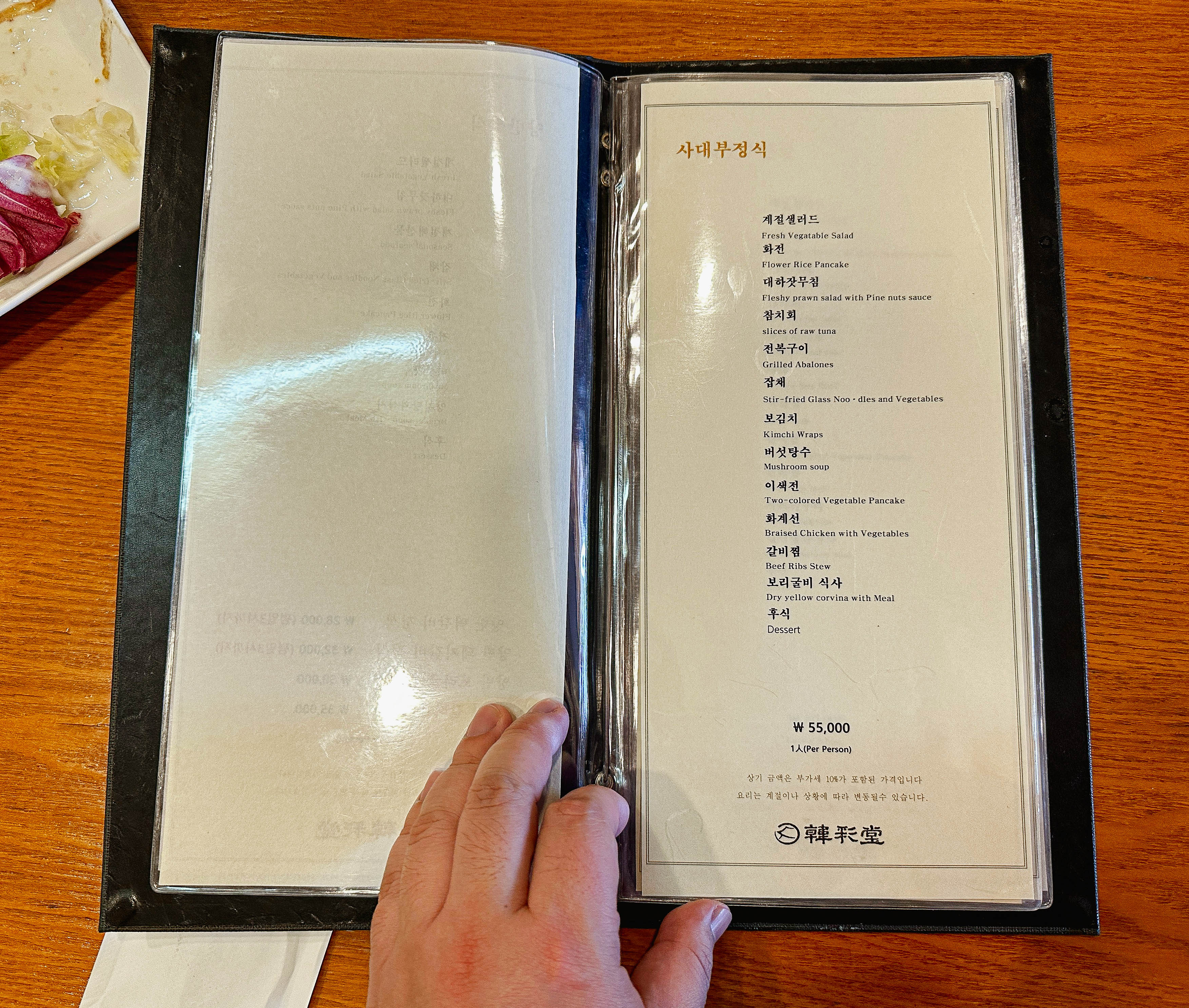 한채당의 메뉴는 양반정식, 사대부정식, 사대부주안상, 궁중정식, 궁중주안상, 수라상, 일품요리가 있었습니다. 저랑 친구는 원래 '수라상(1인 17만 원)'을 주문하려고 했는데, 수라상은 예약을 해야 주문할 수 있다고 해서 한단계 아랫등급인 '궁중주안상(1인 11만 원)'을 선택했습니다.