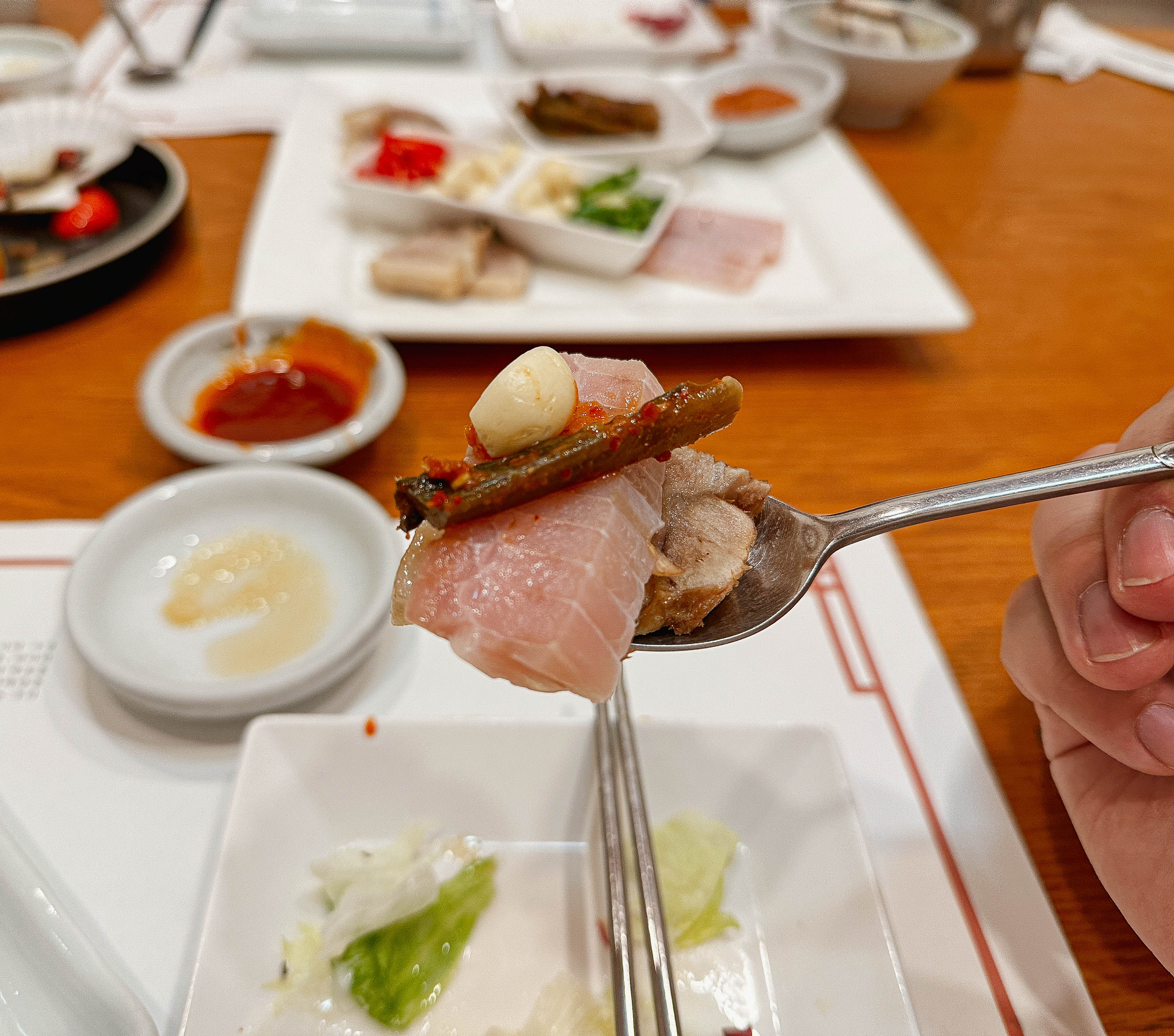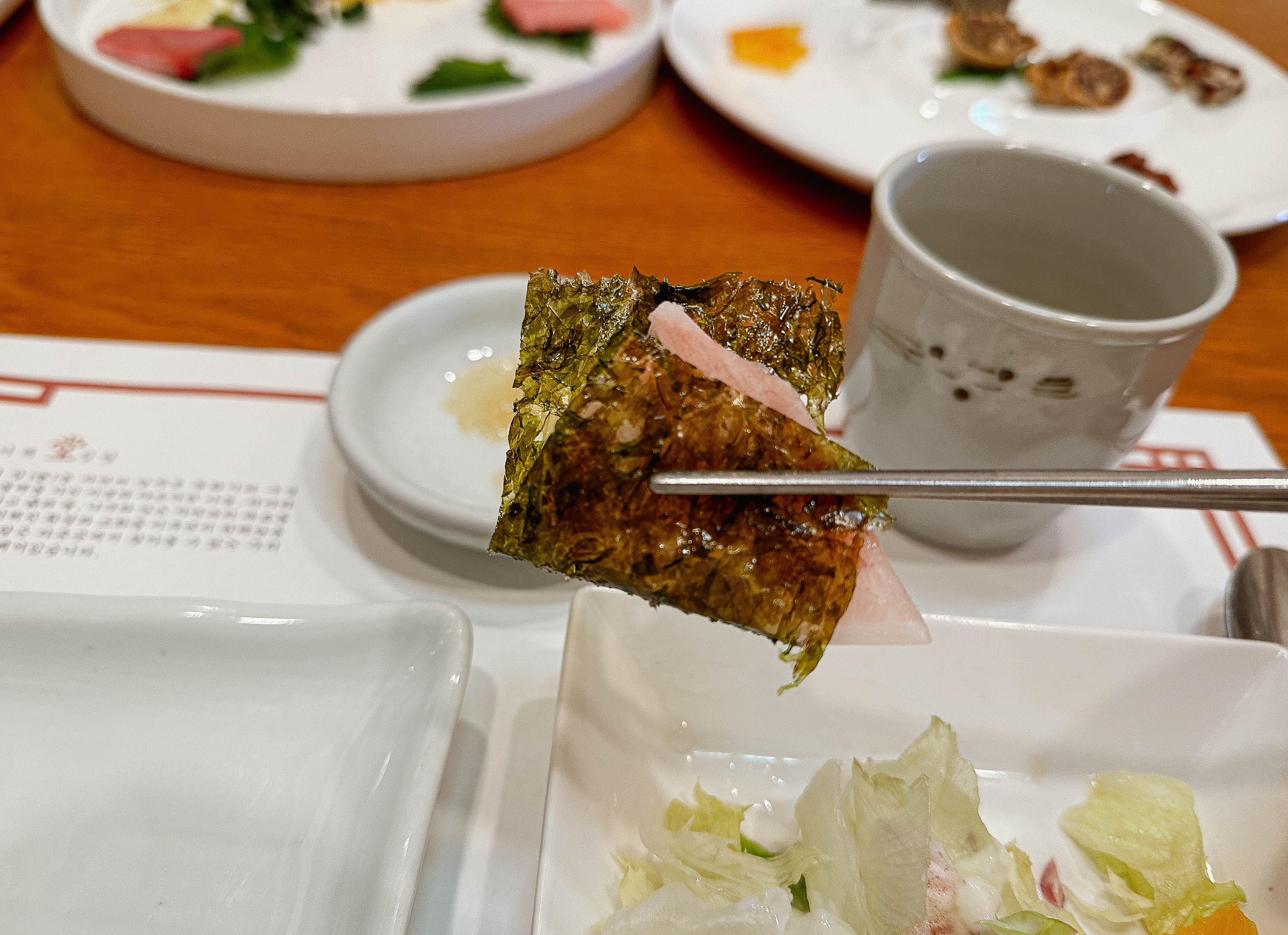 양지탕과 함께 반찬과 밥이 나왔습니다. 앞서나온 갈비구이와 생선찜(홍우럭), 장어구이와 함께 먹으니 좋더라고요. 밥은 별도의 공기에 나왔는데, 보통 한정식집 하면 솥밥으로 누룽지 해먹게 나오던데 한채당의 밥은 밥그릇에 나왔습니다. 전체적으로 그릇들도 묵직하고 반찬들의 간도 너무 자극적이지 않아서 만족스럽게 식사했습니다.