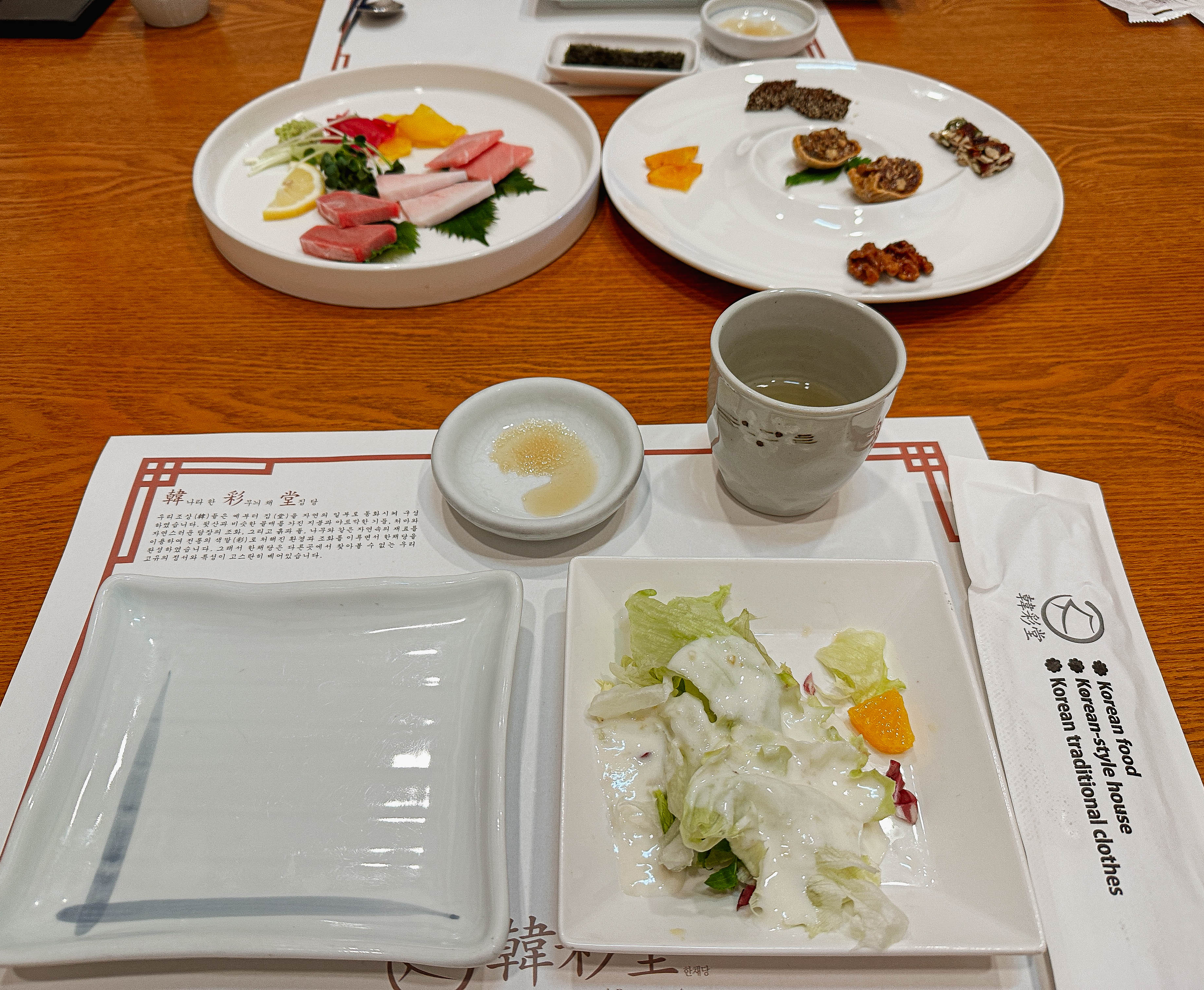 한채당 궁중주안상의 메뉴는 계절샐러드, 건오절, 참치회, 가리비전복구이, 계절해산물, 장어구이, 육회, 생선찜, 홍어삼합, 백합탕, 갈비구이, 양지탕과 식사, 후식으로 제공되고 있었습니다.