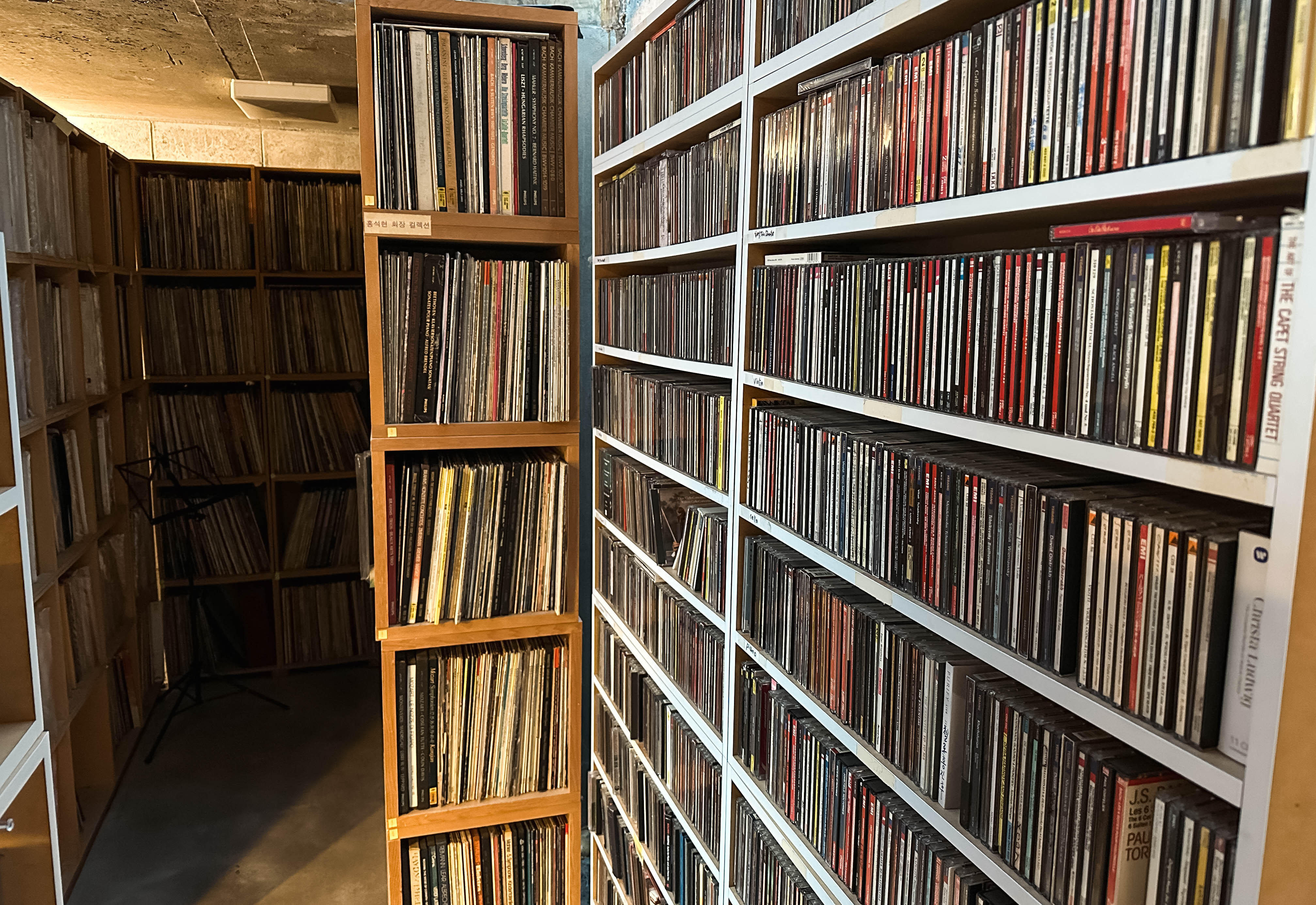 음료를 마시면서 음악감상을 할 수 있는 파주 카메라타 뮤직스페이스는 건물 2층 높이의 스피커를 통해 오페라, 클래식 등 사장님이 직접 선곡을 해서 그때그때 칠판에 음악에 대한 정보를 표기하고 있었습니다. 출입이 제한되어 들어가 보진 못했지만, 장식장을 가득 채운 LP판과 CD는 사장님이 음악을 얼마나 사랑하는지 느껴지는 부분이었습니다.