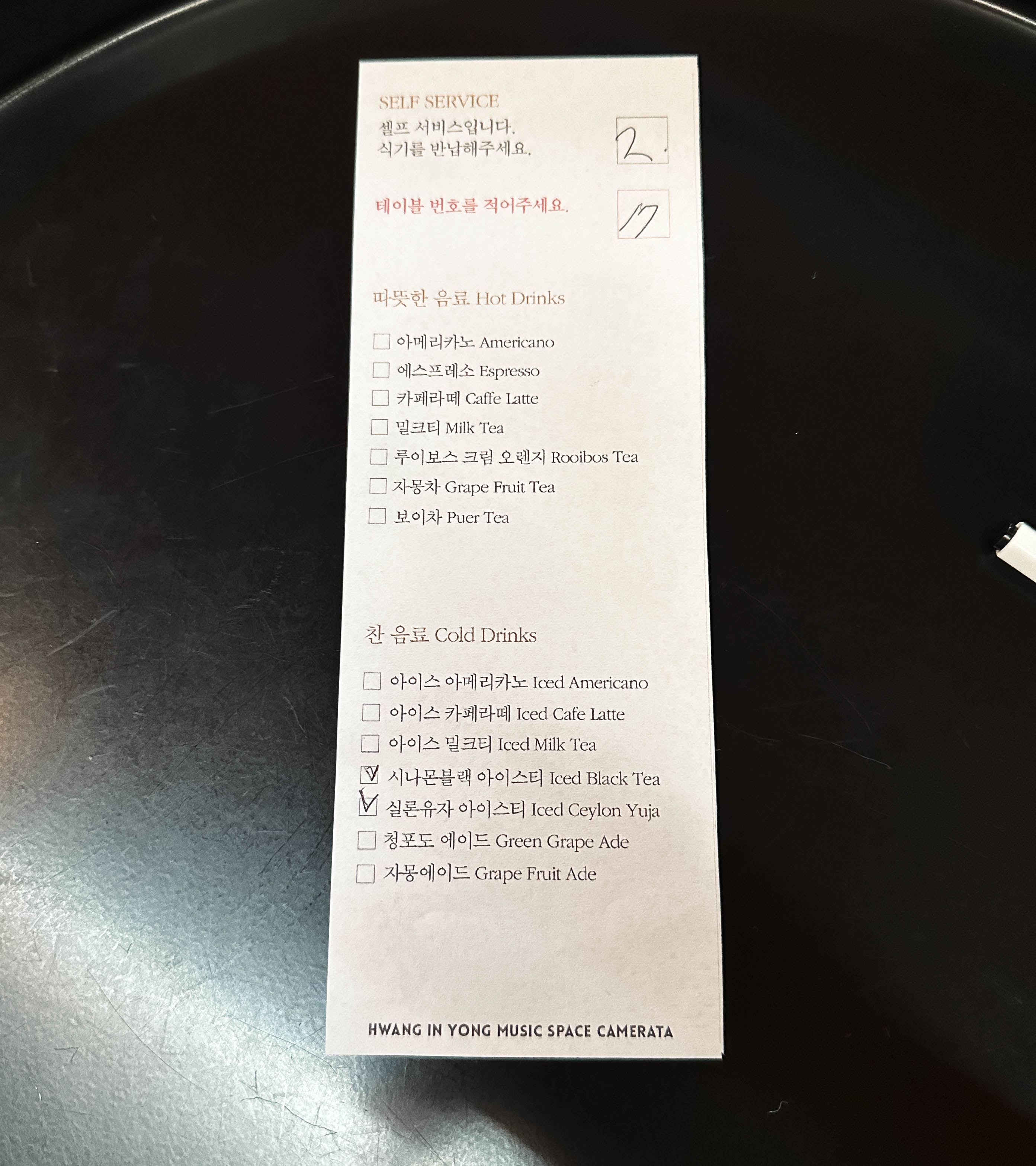 카메라타 뮤직스페이스에 들어가면 대형 스피커로부터 음악이 공간을 꽉 채우고 있었고, 입장료는 성인 12,000원, 학생 10,000원을 받고 있었으며, 입장료에 음료의 가격이 포함되어 있어서 자리에 있는 메뉴판을 통해 메뉴를 선택한 다음 주문하면 되었습니다. 음료 메뉴는 일반적인 카페와 비슷하였습니다.