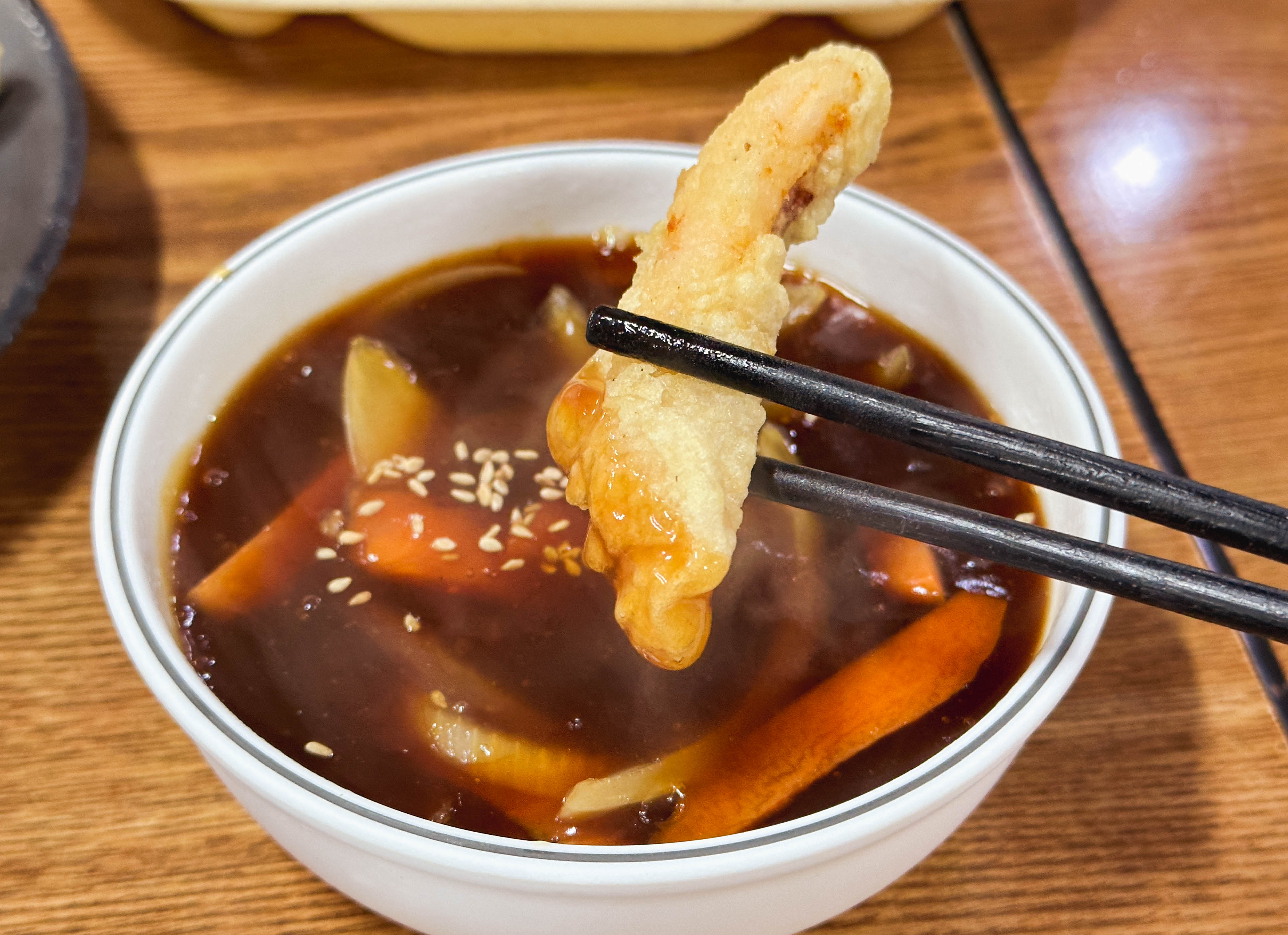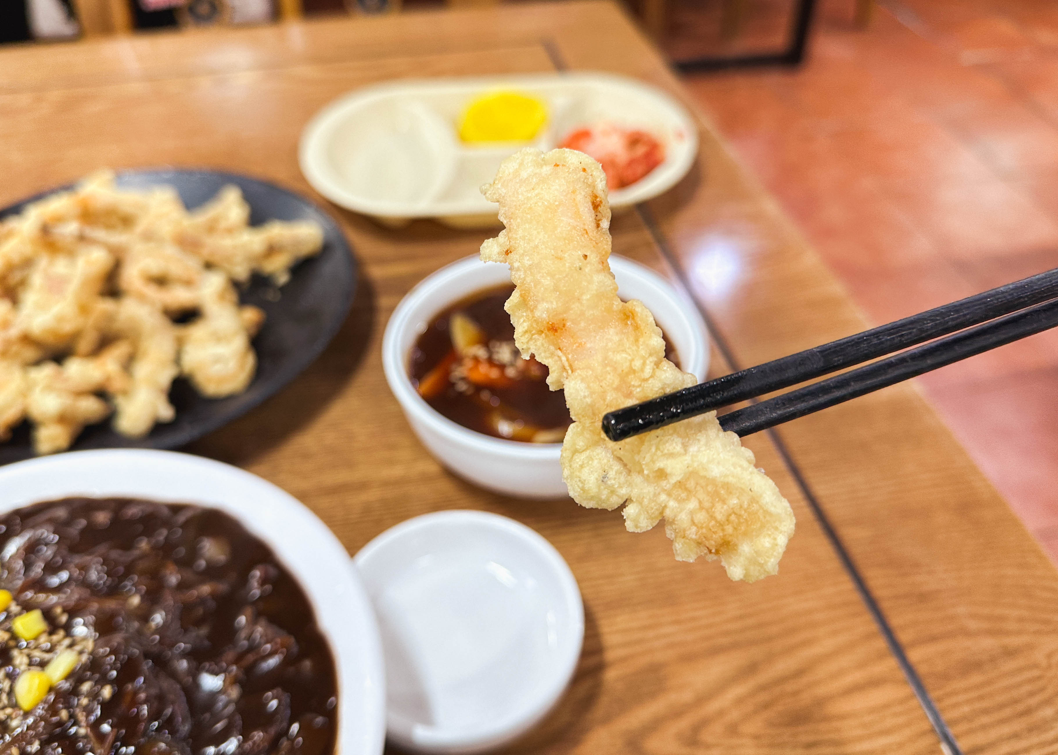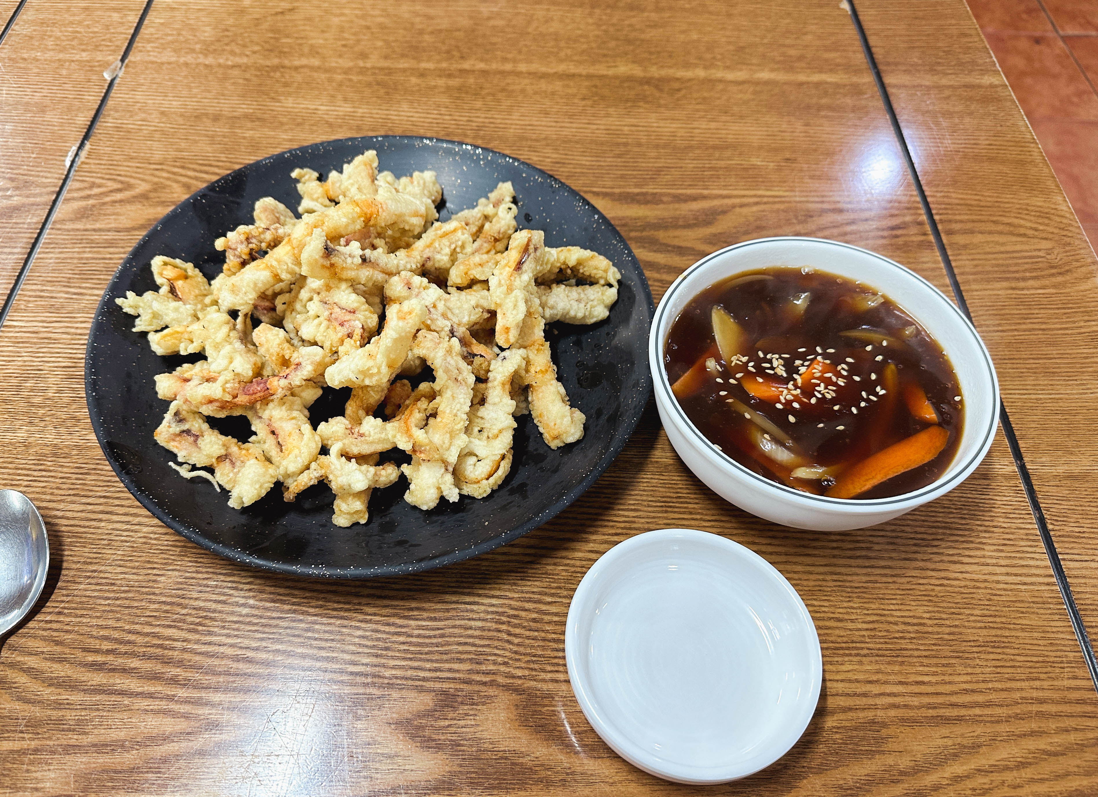 짜장면과 함께 오징어탕수육이 나왔습니다. 오징어탕수육은 일반적인 탕수육과 비슷하게 생겼고, 소스도 일반적인 중식당에서 먹던 새콤달콤한 소스와 동일했습니다.