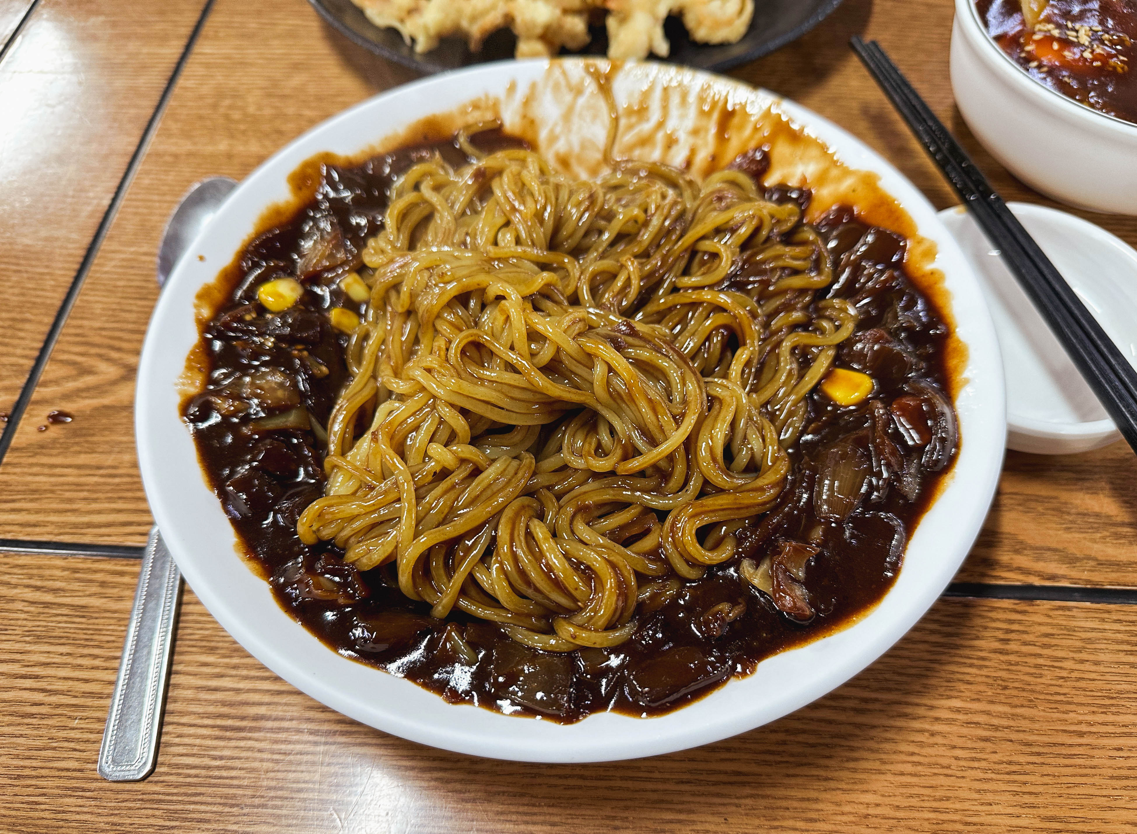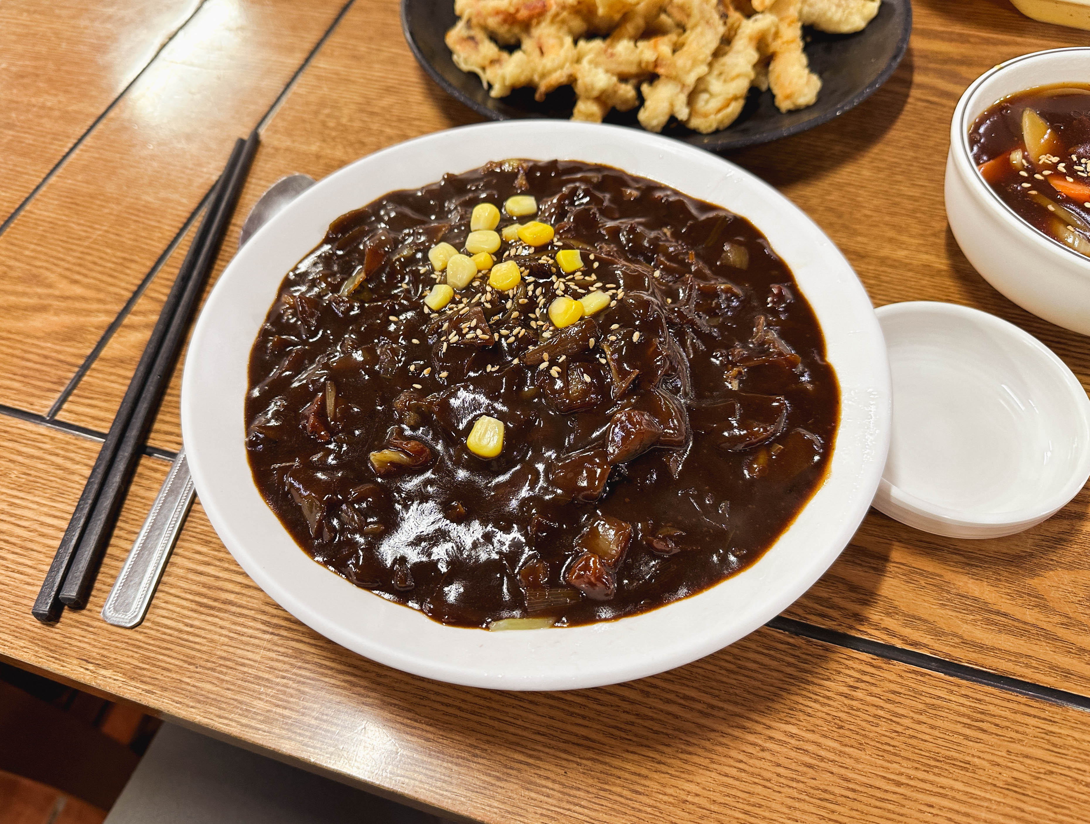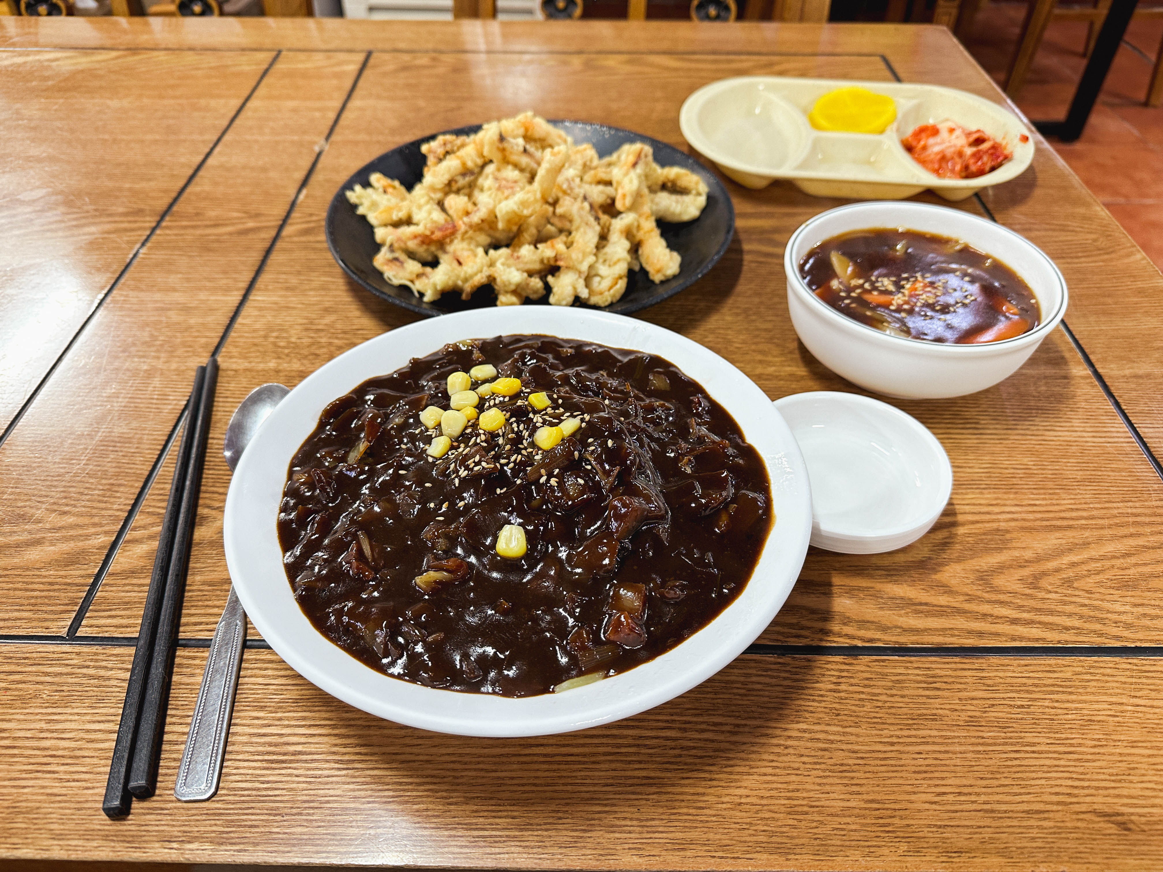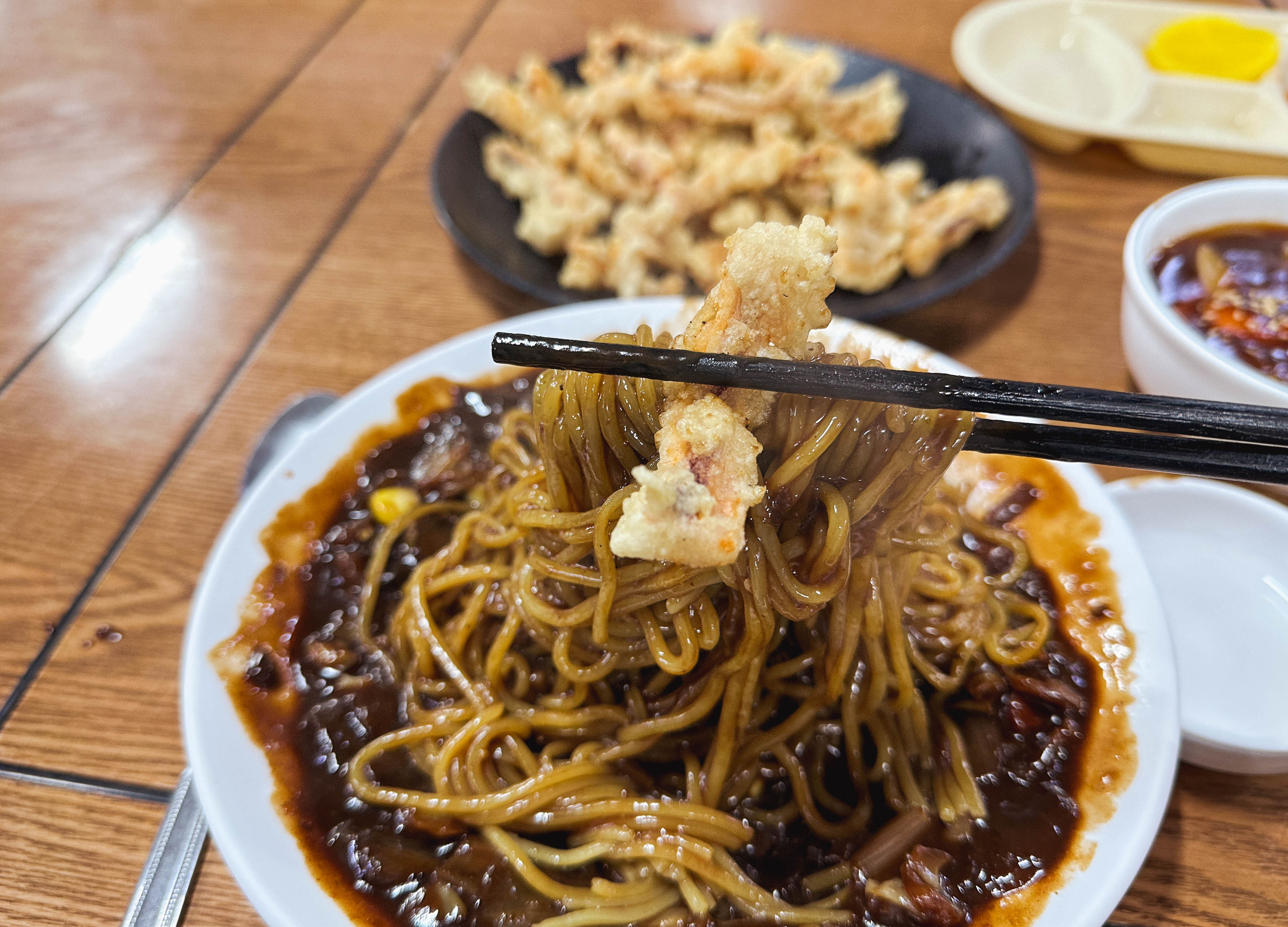 짜장면과 탕수육을 함께 먹었는데, 짜장면은 평범한 짜장면 맛이었고, 오징어탕수육은 오징어튀김을 좀 더 바싹 튀겨낸 맛이었습니다. 평소 오징어튀김을 좋아하기에 이 메뉴를 맛있게 먹을 수 있었는데, 예상을 벗어난 차별화가 있을 줄 알았는데 예상을 1도 벗어나지 않아서 조금 아쉬웠습니다.