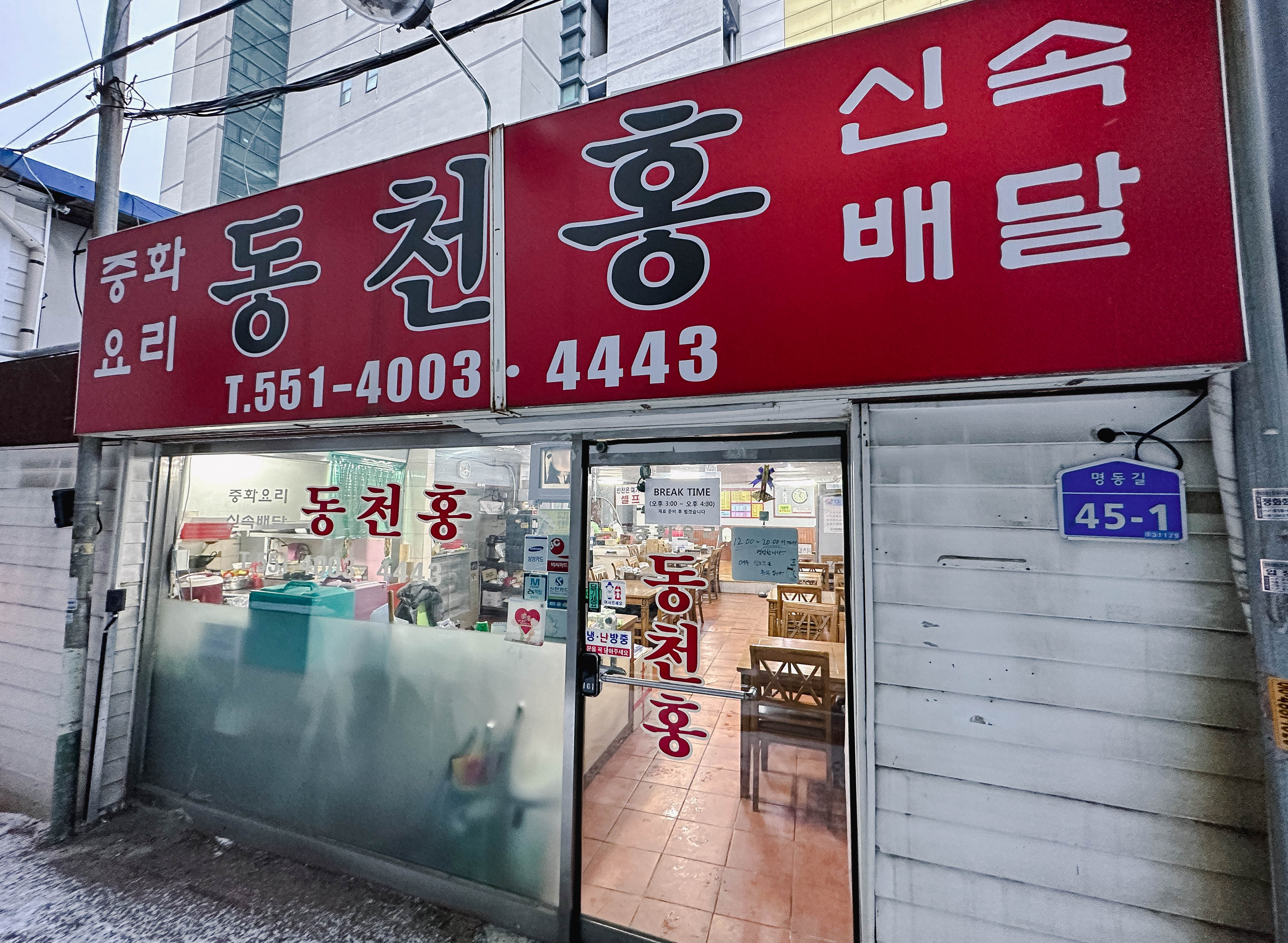 동천홍의 위치는 충남 천안시 동남구 대흥동 105-23 에 위치한 가게입니다. 천안역 인근에 위치한 이 중식당은 좁은 골목에 위치해 있어서, 일부러 찾아가지 않으면 방문하기 쉽지 않은 가게였습니다. 가게 영업시간은 12:00~20:00 까지였으며, 휴게시간은 15:00~16:30 까지였습니다.