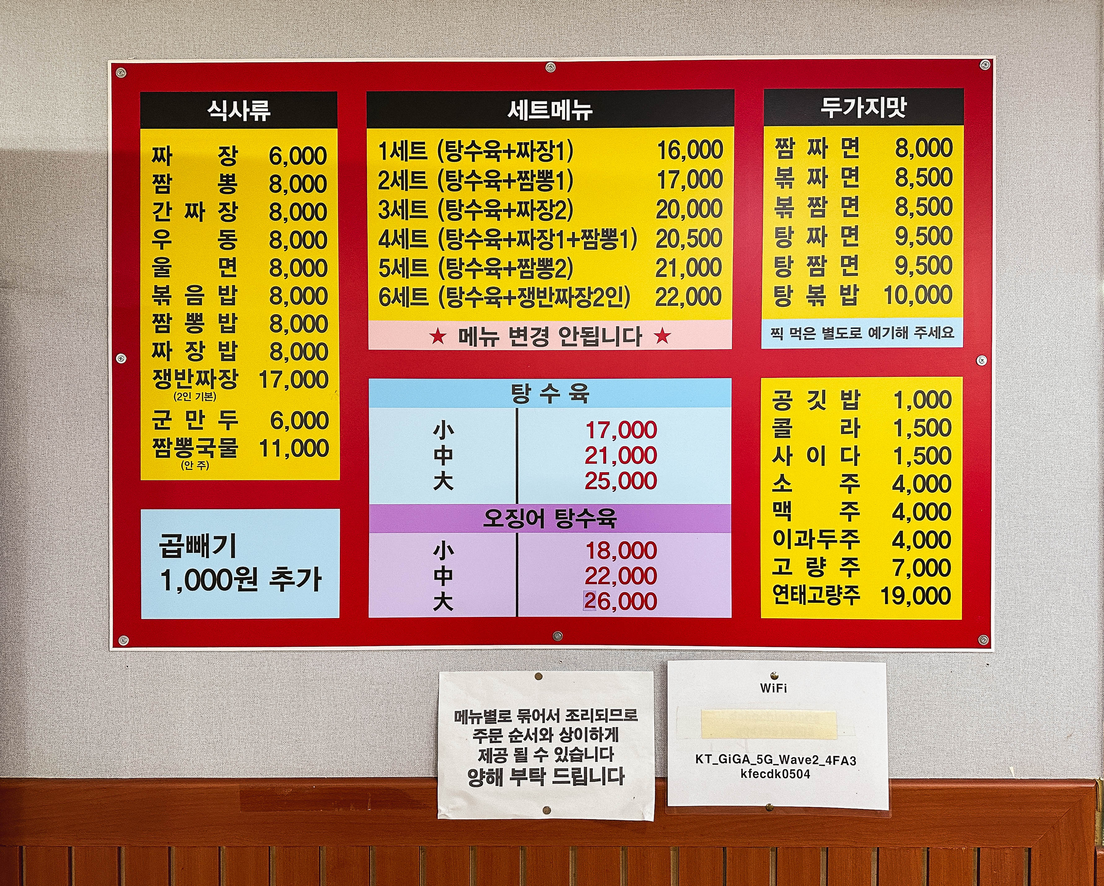 가게에 들어가 실제로 오징어탕수육을 판매하고 있는지 메뉴를 살펴보았습니다. 동천홍의 메뉴는 짜장, 짬뽕, 간짜장, 우동, 울면, 볶음밥, 짬뽕밥, 짜장밥, 쟁반짜장, 군만두, 짬뽕국물, 탕수육, 오징어탕수육 등이 있었습니다. 다행히 제가 방문했을 때 오징어탕수육 메뉴도 주문할 수 있었습니다.
