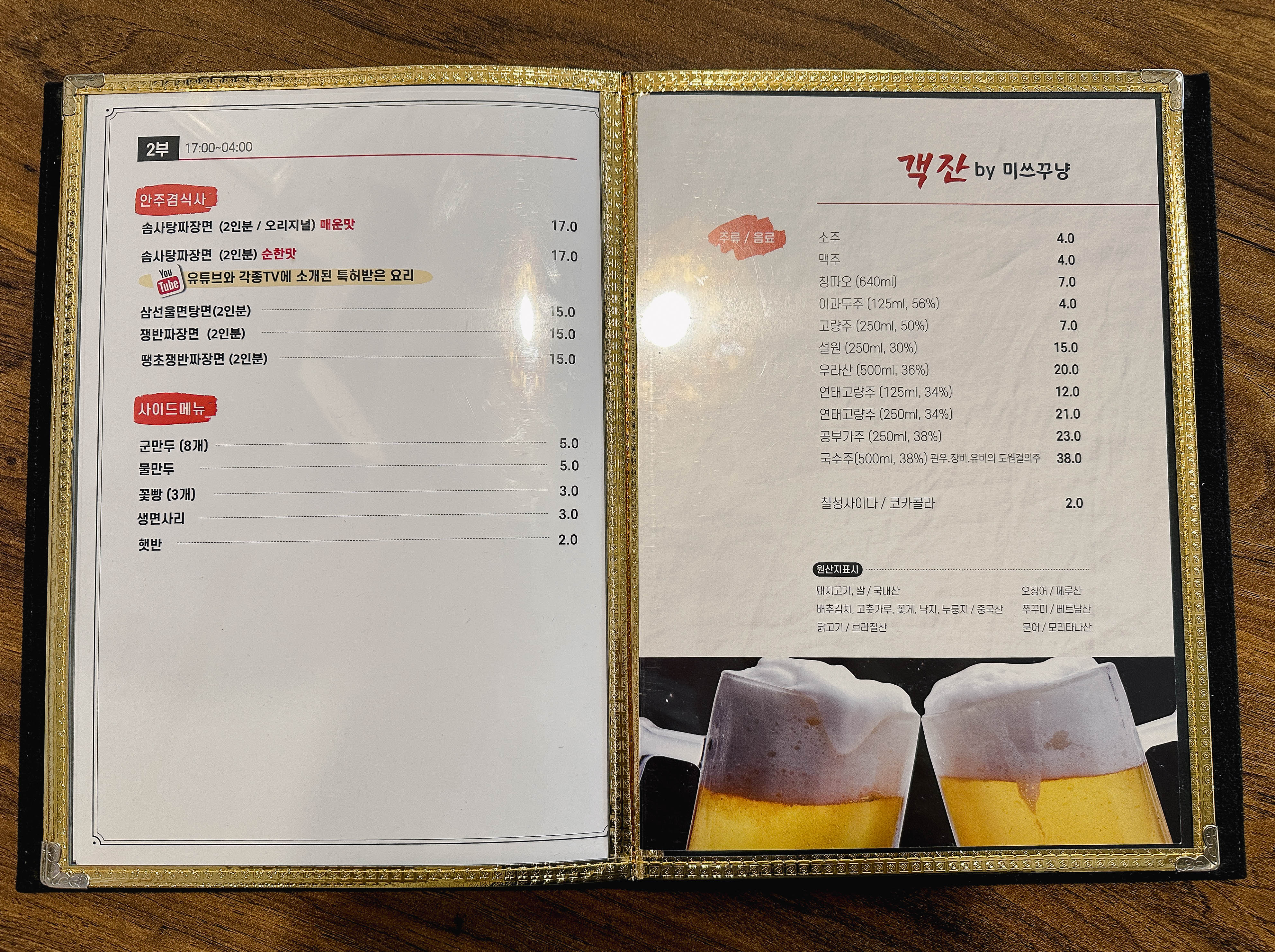 미쓰꾸냥의 메뉴는 위와 같습니다. 수타손짜장면, 수타손짬뽕, 볶음밥, 해물쟁반짜장면, 탕수육, 깐풍기, 라조육, 팔보채, 소고기유산슬, 소고기고추잡채, 칠리왕새우, 양장피, 해물누룽지탕, 해물짬뽕탕, 원기삼정, 유린기, 솜사탕짜장면, 삼선울면탕면, 쟁반짜장면, 땡초쟁반짜장면, 군만두, 물만두, 꽃빵, 생면사리 등이 있었습니다.