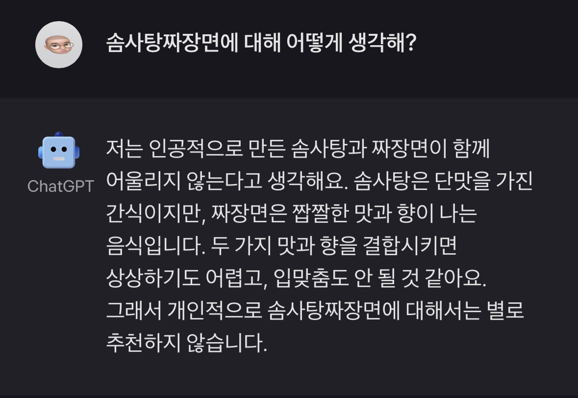 먼저, 솜사탕짜장면에 대해 요즘 화제의 인공지능 챗 GPT 는 어떻게 반응할지 궁금했습니다. 그래서 솜사탕짜장면에 대한 의견을 물어봤더니, "솜사탕과 짜장면은 어울리지 않을 것 같다고 생각한다" 는 답변을 들을 수 있었습니다. 물론, 저도 비슷한 생각을 하고 방문하였는데, 실제로 먹어보면 또 다를 수도 있으니 객잔by미쓰꾸냥으로 같이 들어가 보시죠.
