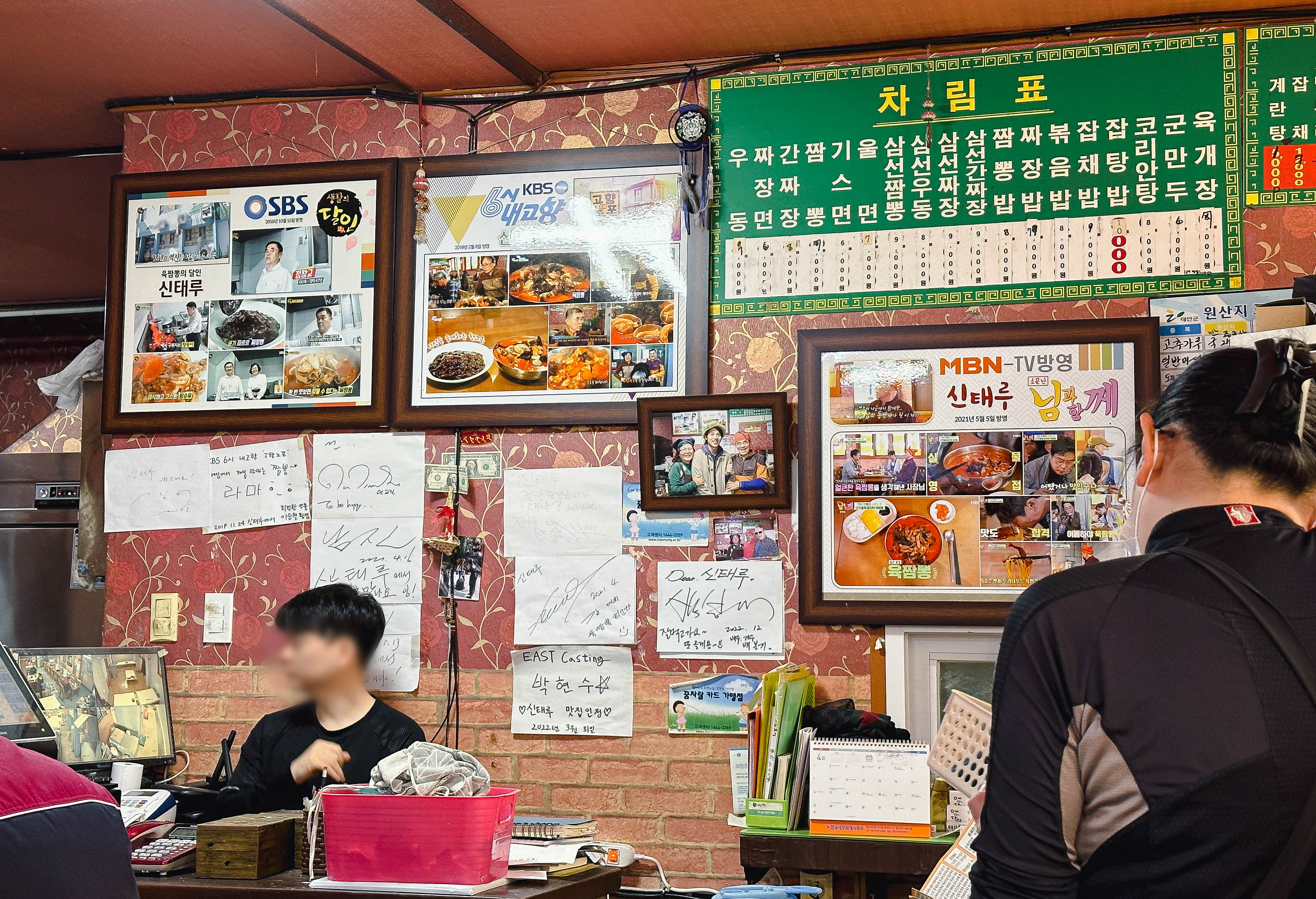 신태루의 위치는 충남 태안군 태안읍 동문리 287-4, 1층에 위치한 중식당입니다. 가게 외관과 간판에서부터 노포의 느낌이 많이 느껴지는데요. 자세히 알아보니 70년 전통의 중식당으로 SBS⎡생활의달인⎦말고도, KBS 1TV⎡6시내고향⎦, MBC⎡생방송오늘저녁⎦등 에도 출연한 적이 있는 가게였습니다. 가게 안에는 유명인들이 다녀갔다는 사인도 볼 수 있었습니다.