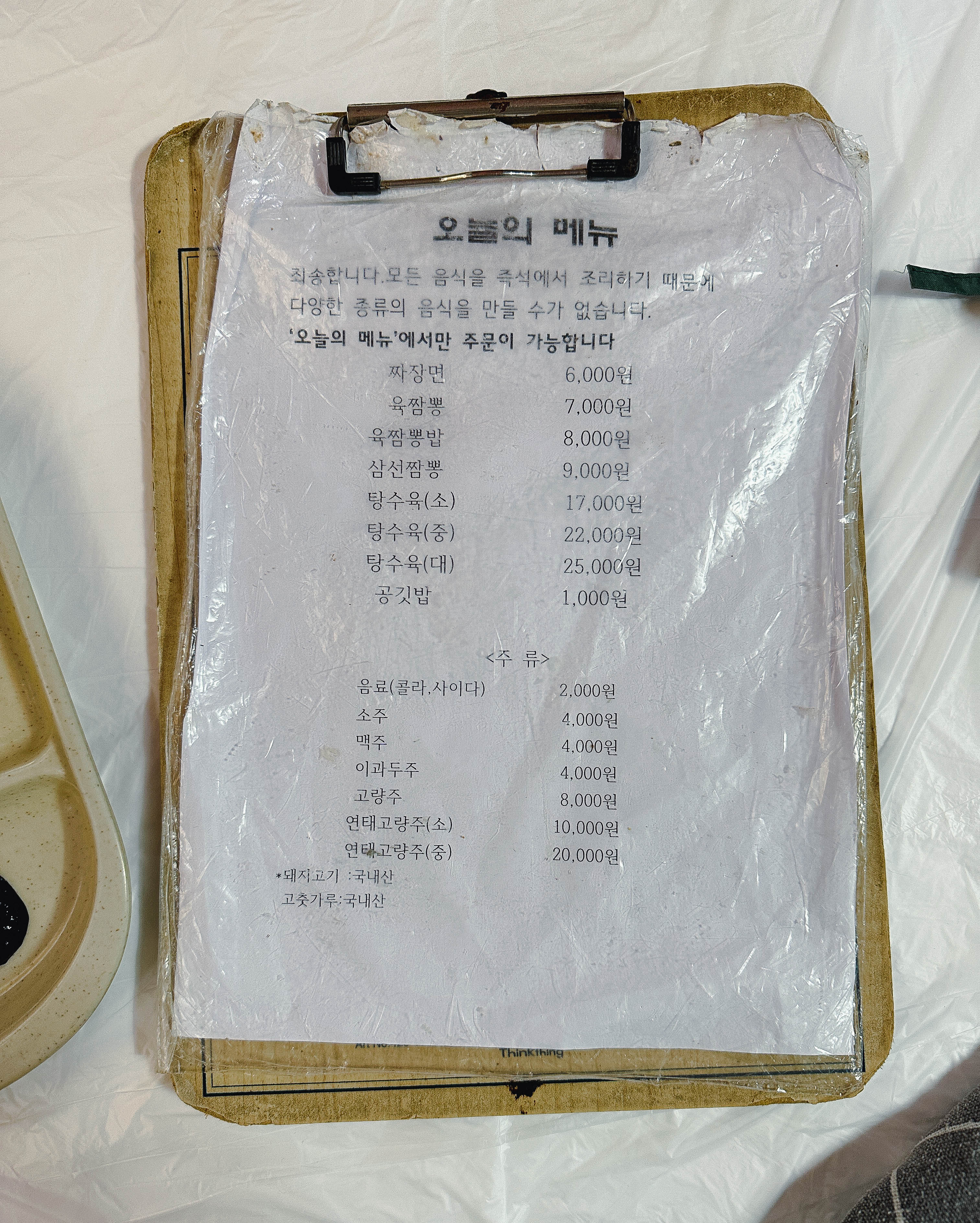 신태루의 메뉴는 다음과 같습니다. 짜장면, 육짬뽕, 육짬뽕밥, 삼선짬뽕, 탕수육이 있었고, 그밖에 메뉴들도 가게에 걸려있었지만 현재는 종이 메뉴판에 적혀있는 메뉴들 위주로 판매하는 것 같았습니다.