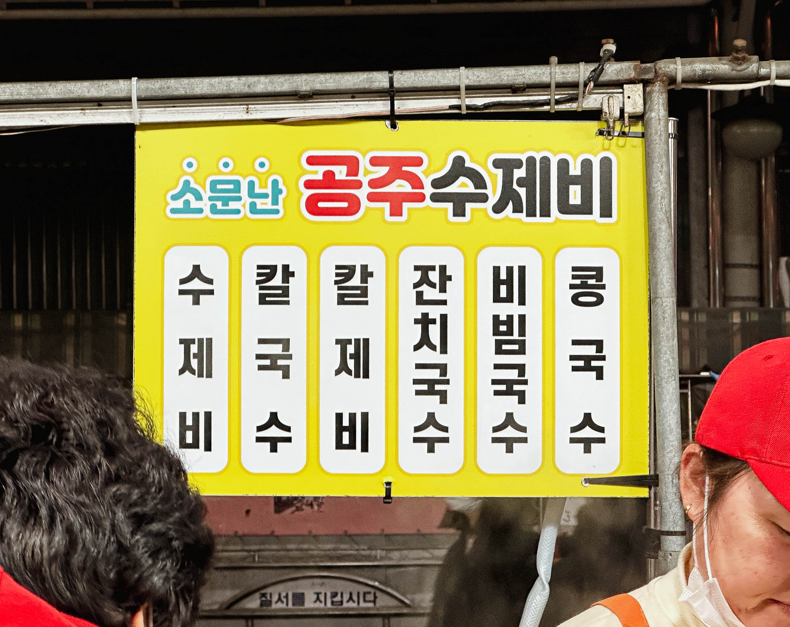 소문난공주수제비의 메뉴는 수제비, 칼제비, 칼국수, 잔치국수, 비빔국수, 콩국수가 있었습니다. 가격은 5,000~6,000원 사이로 부담스럽지 않았고, 즉석에서 국수를 삶고 육수에 채소 등을 넣어 내어 줘서 맛있었습니다. 이 날 저희가 마지막 손님이었는데 서문시장 소문난공주수제비는 손님이 마감 이후에도 몰려들 정도로 많이 있더라고요.