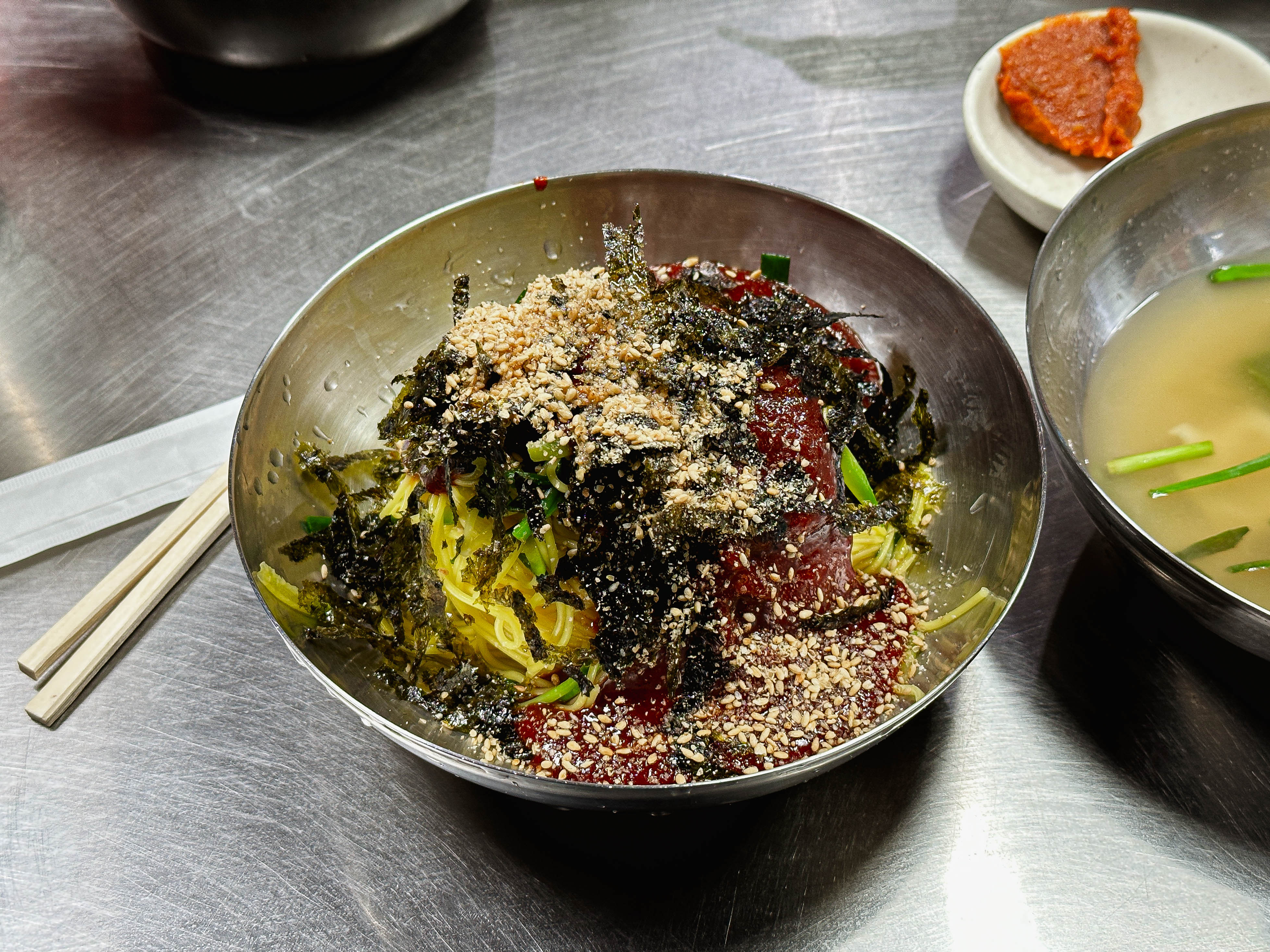 먼저 수제비부터 살펴보겠습니다. 채소들을 숭덩숭덩 썰어 넣은 육수에 약간 풀어진듯한 수제비 그 위에 부추와 고소한 깨가루가 올라가 있어 투박하면서도 고소한 맛이 특징이었고, 제가 주문한 비빔국수는 살짝 데쳐 식감 좋은 면과 그 위에 양념, 호박, 김가루 등이 올라가 매콤 새콤 맛이 좋았습니다. 비빔국수에는 같이 먹으라고 수제비 국물도 좀 내어주시더라고요.