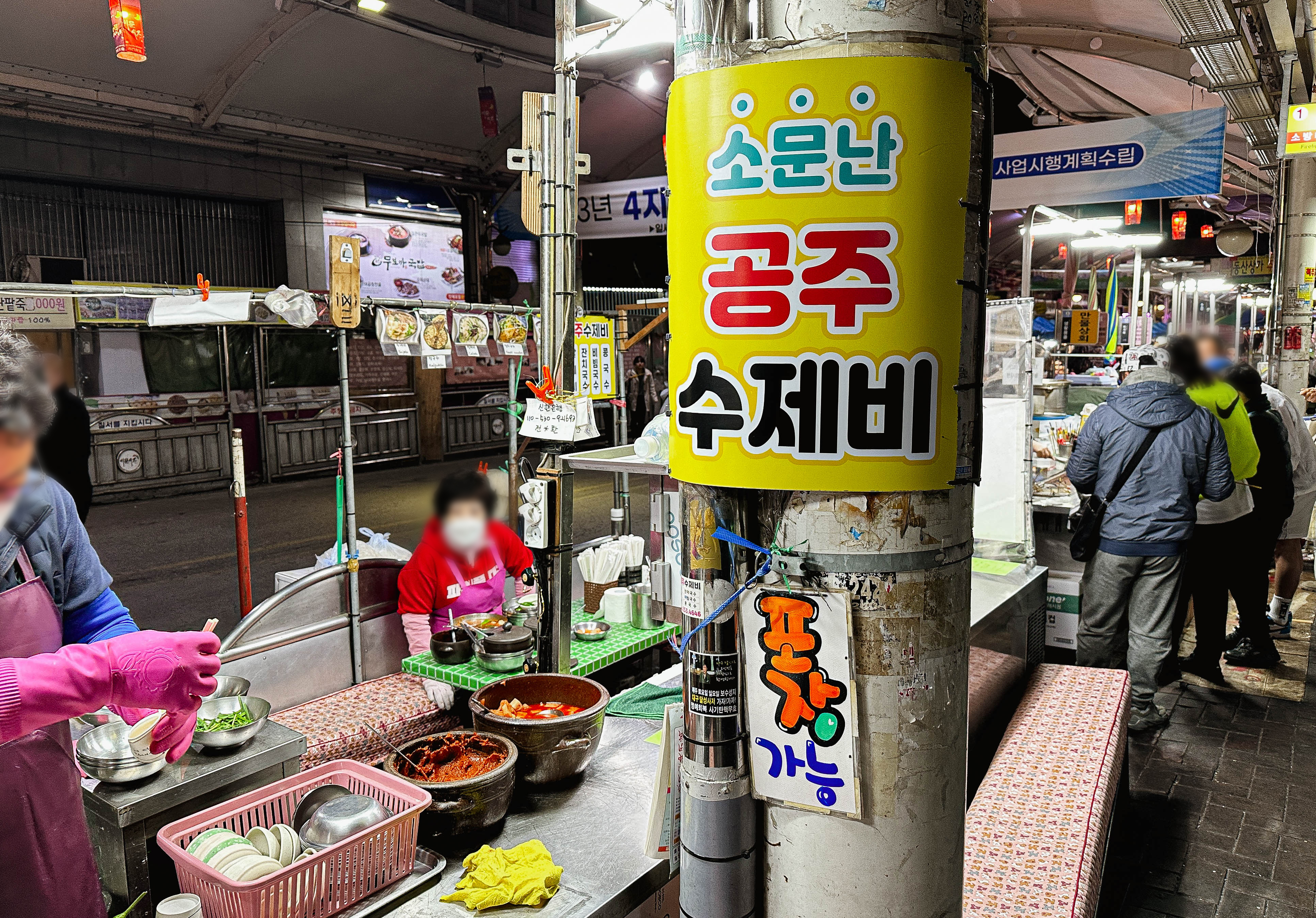 서문시장 야시장은 소문답게 불야성이었고, 곱창, 철판요리, 김밥, 닭강정 등 먹거리를 사려는 손님들로 줄이 길게 늘어선 모습을 볼 수 있었습니다. 저는 간단하게 카베츠야끼라는 부침요리를 사서 먹고 나서 간단하게 국수를 먹고 나가려고 서문시장에서 유명한 수제비 맛집인 <소문난공주수제비> 가게를 찾아갔습니다.