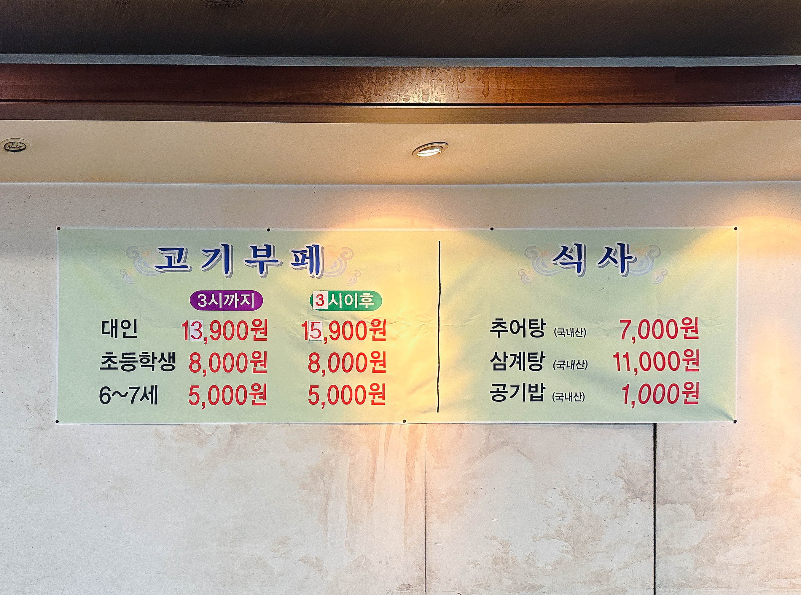 개봉동 손가네생오리부페의 메뉴는 고기뷔페, 추어탕, 삼계탕이 있었습니다. 고기뷔페 이용 시 성인기준 15시 이전 13,900원, 15시 이후에는 15,900원 에 이용할 수 있었습니다. 이 가게는 생오리가 무한리필인데도 합리적인 가격에 먹을 수 있다는 것이 좋았습니다. 이 날은 형들과 함께 방문하여 고기뷔페 3인분을 주문했습니다.