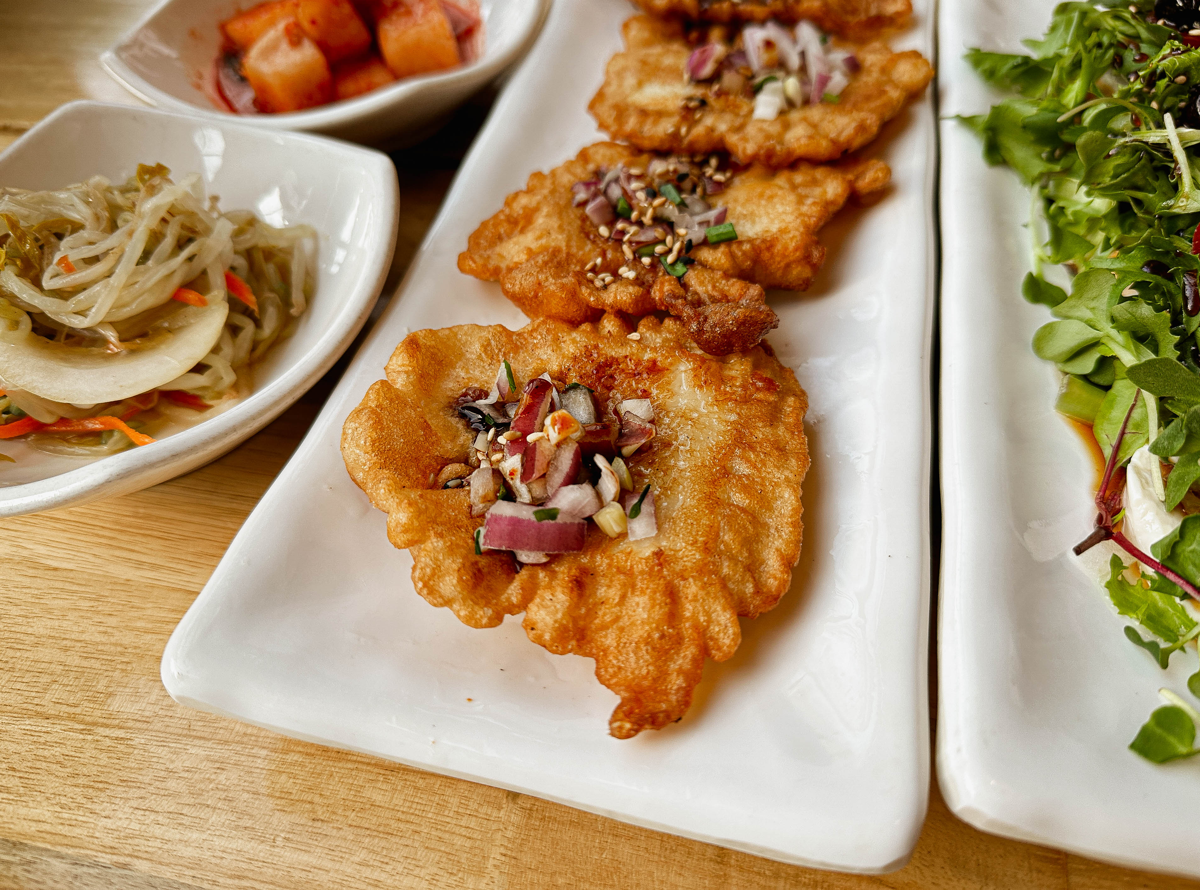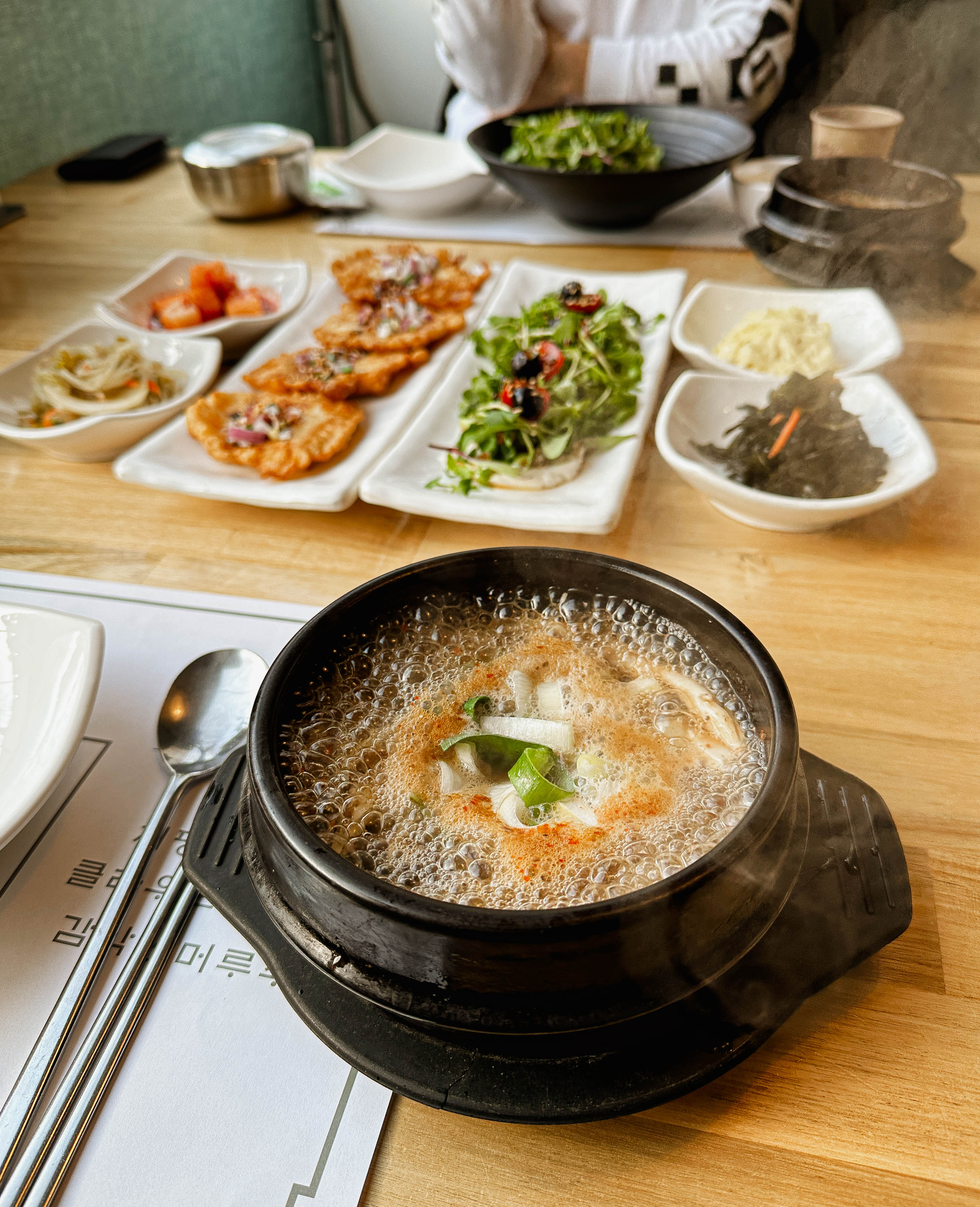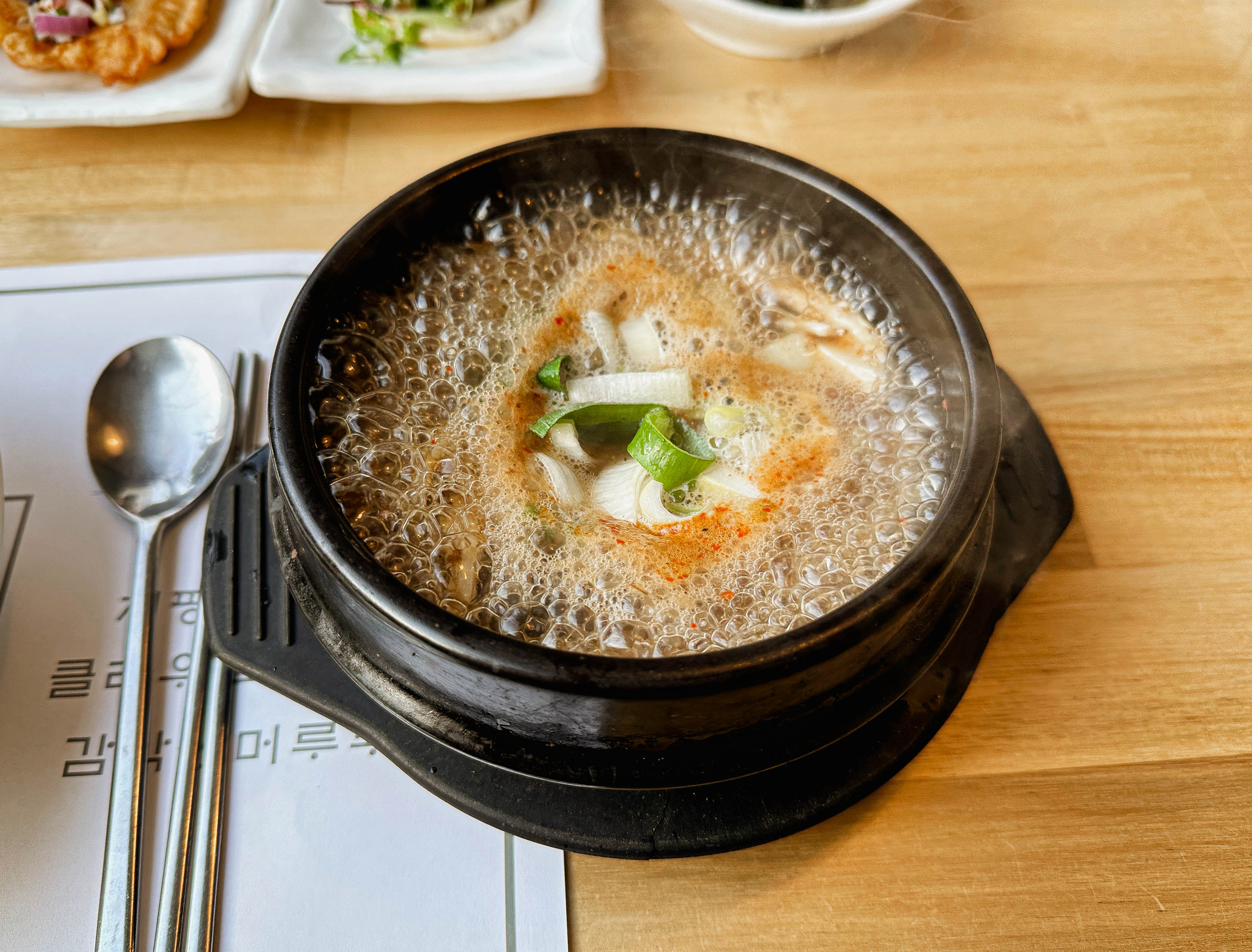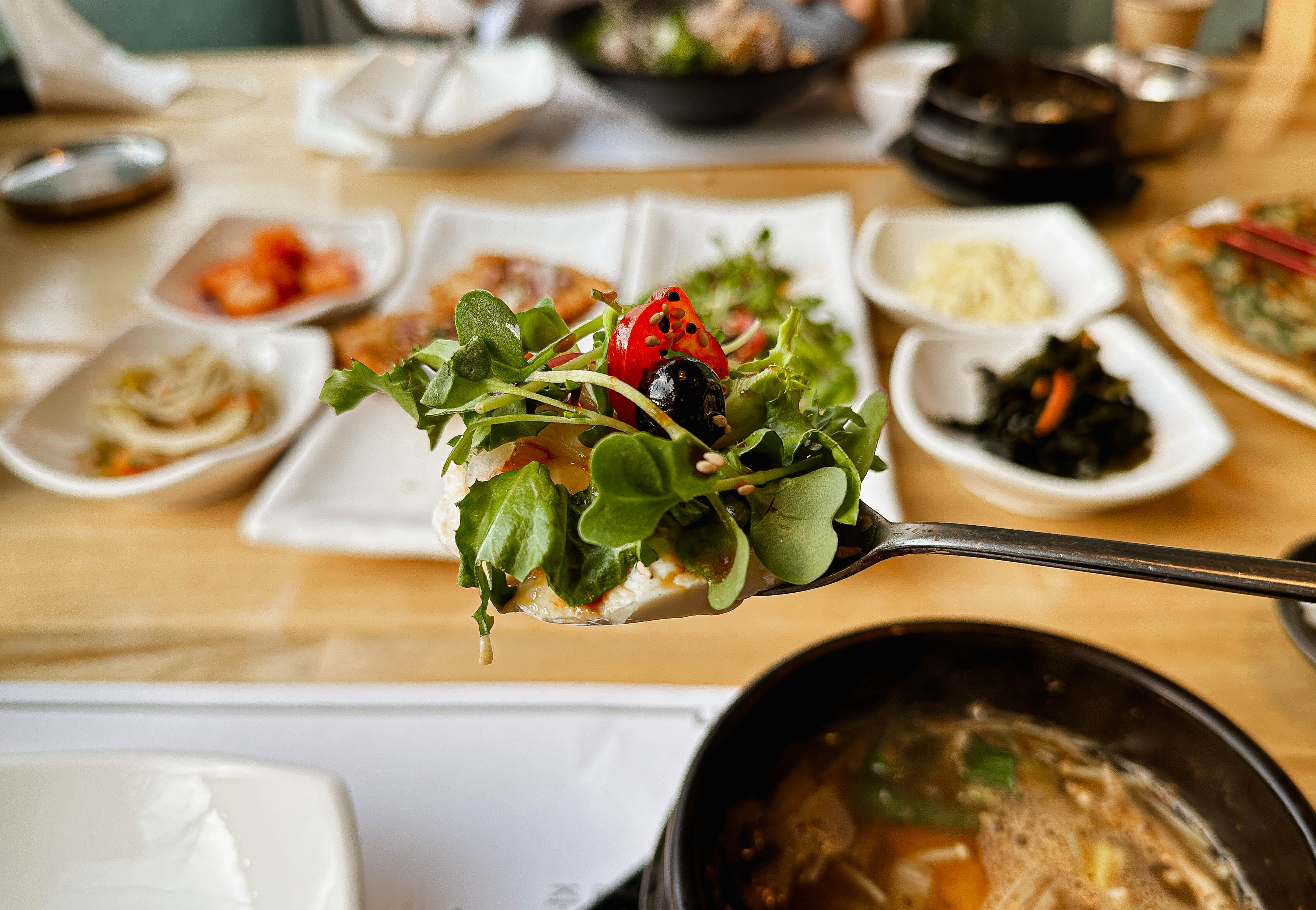 저는 개인적으로 강된장정식보다는 된장정식이 더 맛있는 것 같더라고요. 샐러드도 연두부로 만들어 부드러웠고, 두부부침도 입맛에 맞았습니다. 된장찌개도 우렁된장으로 구수하면서도 시원한 맛이 있었습니다. 부추전을 별도로 주문했는데, 솔직히 부추전은 더 바삭하면 좋았을 텐데, 약간 쫀득한 느낌이었습니다.
