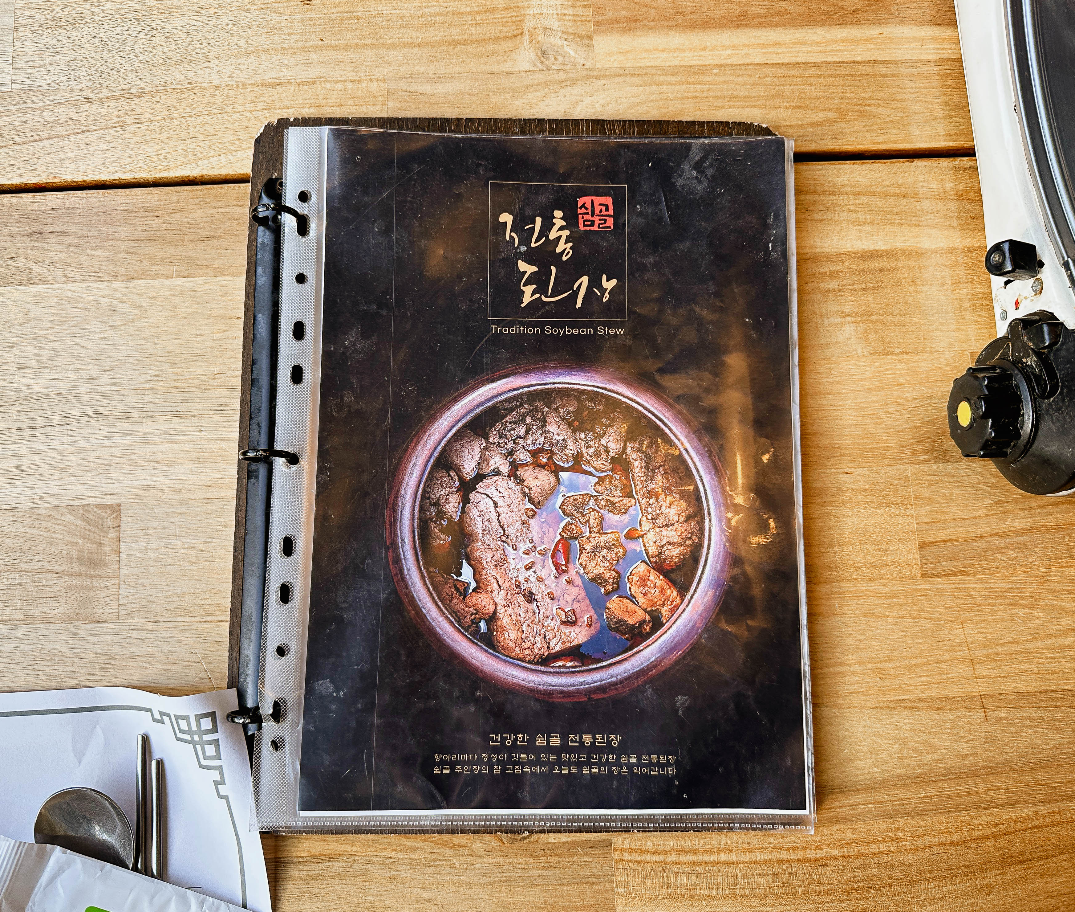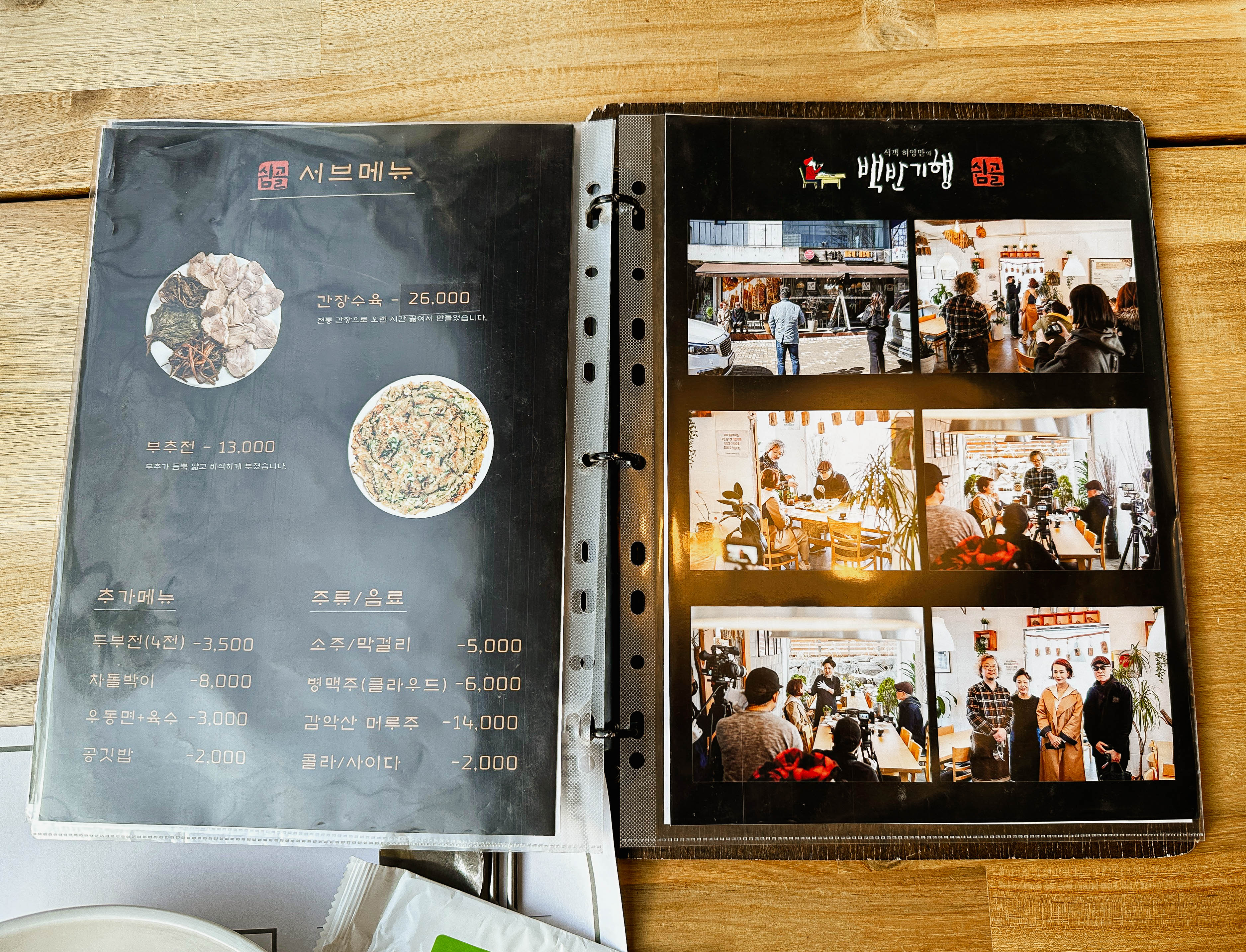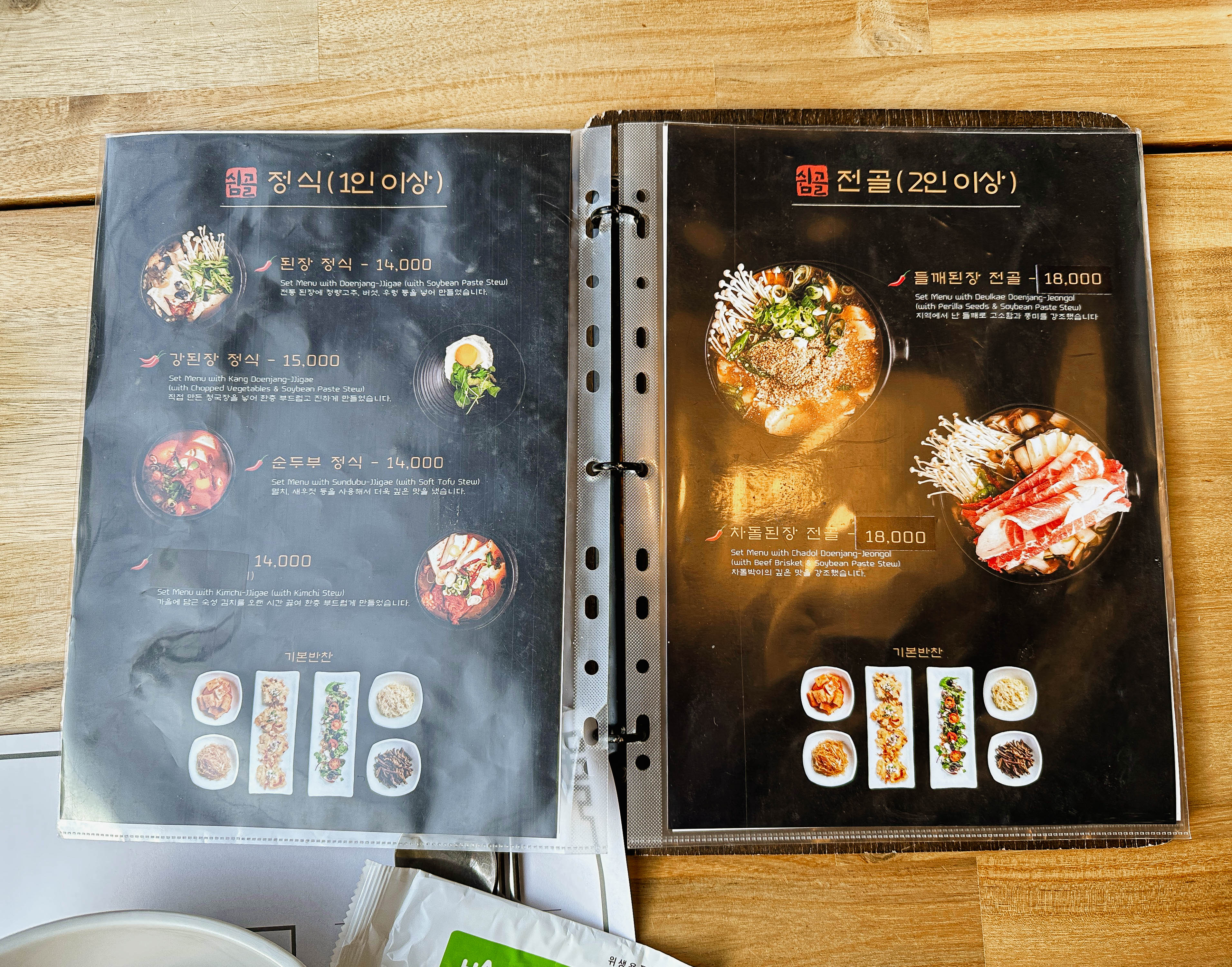 헤이리마을 쉼골전통된장의 메뉴는 된장정식, 강된장정식, 순두부정식, 들깨된장전골, 차돌된장전골, 간장수육, 부추전, 두부전, 차돌박이, 우동면+육수 등이 있었습니다. 마지막 표지를 보니 TV조선⎡식객 허영만의 백반기행⎦에 나왔던 내용을 담고 있더라고요.