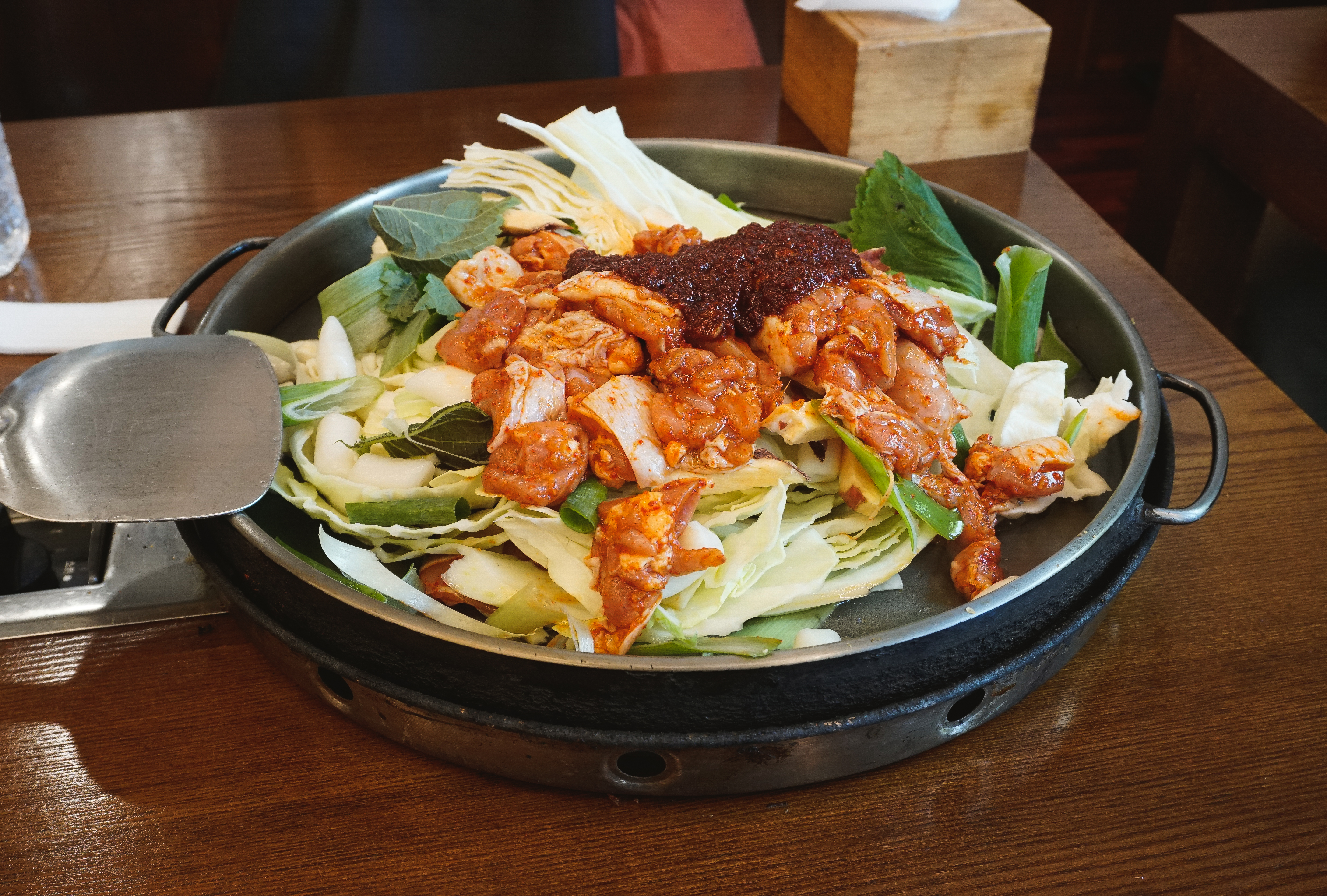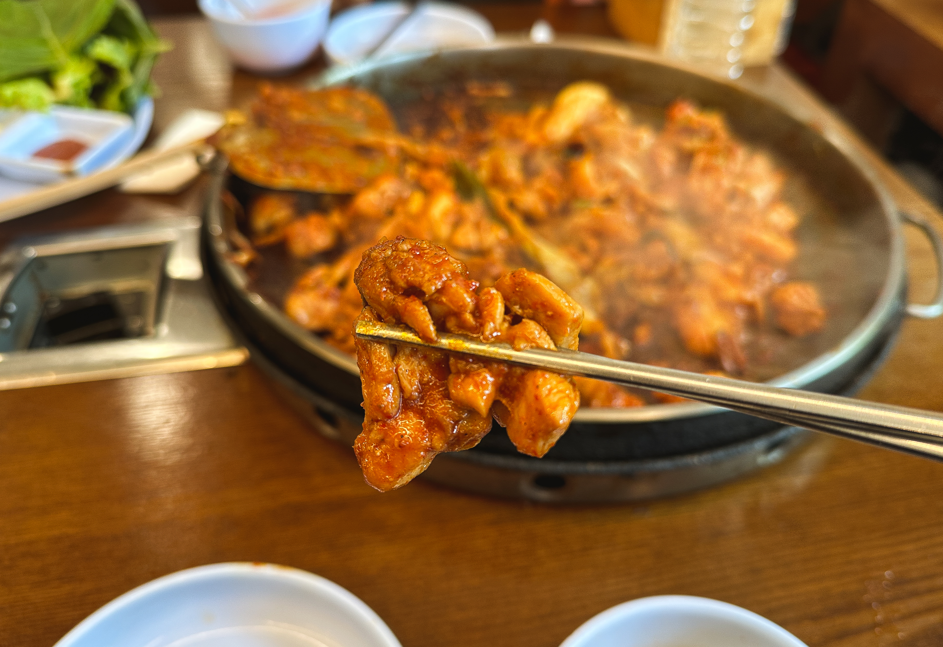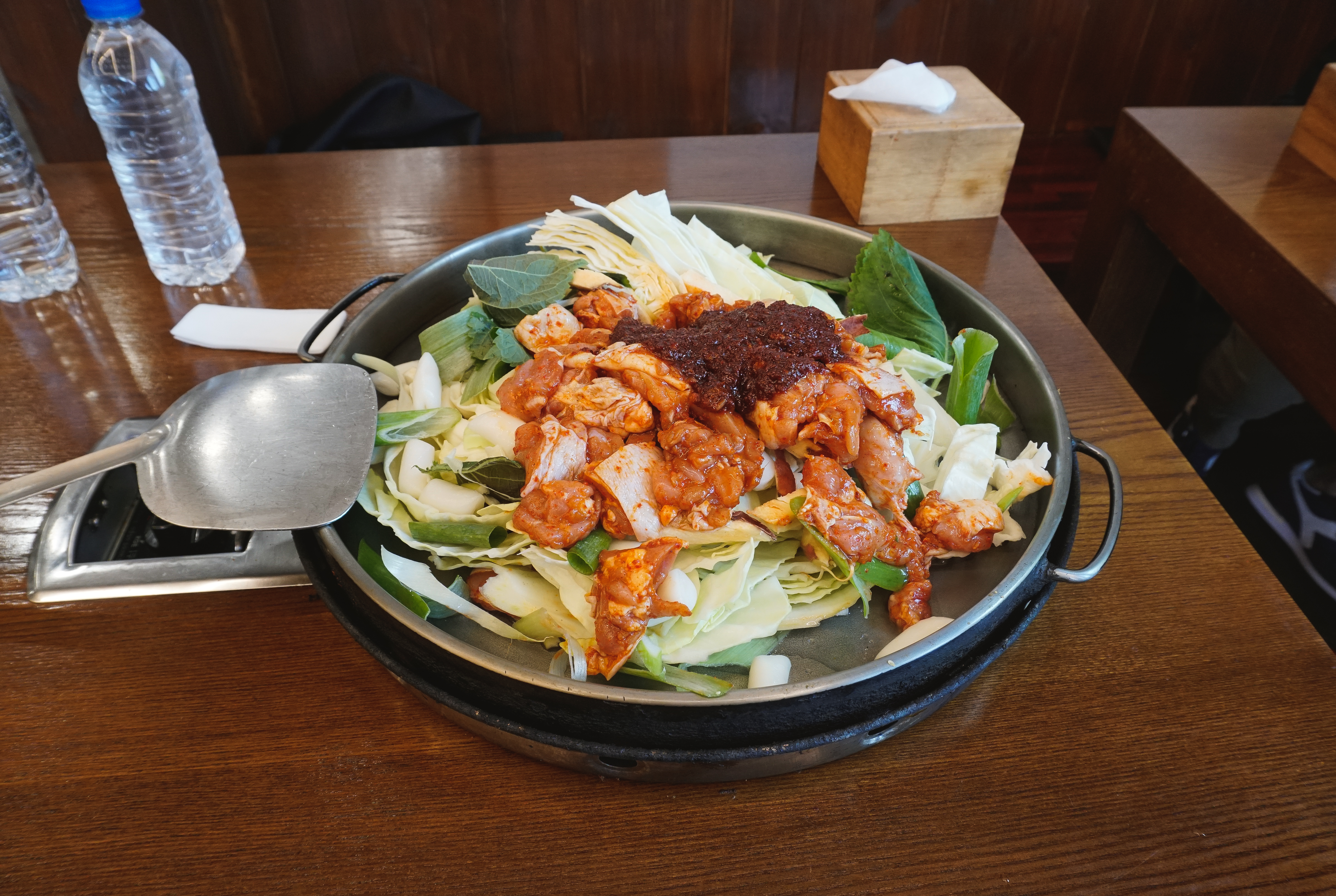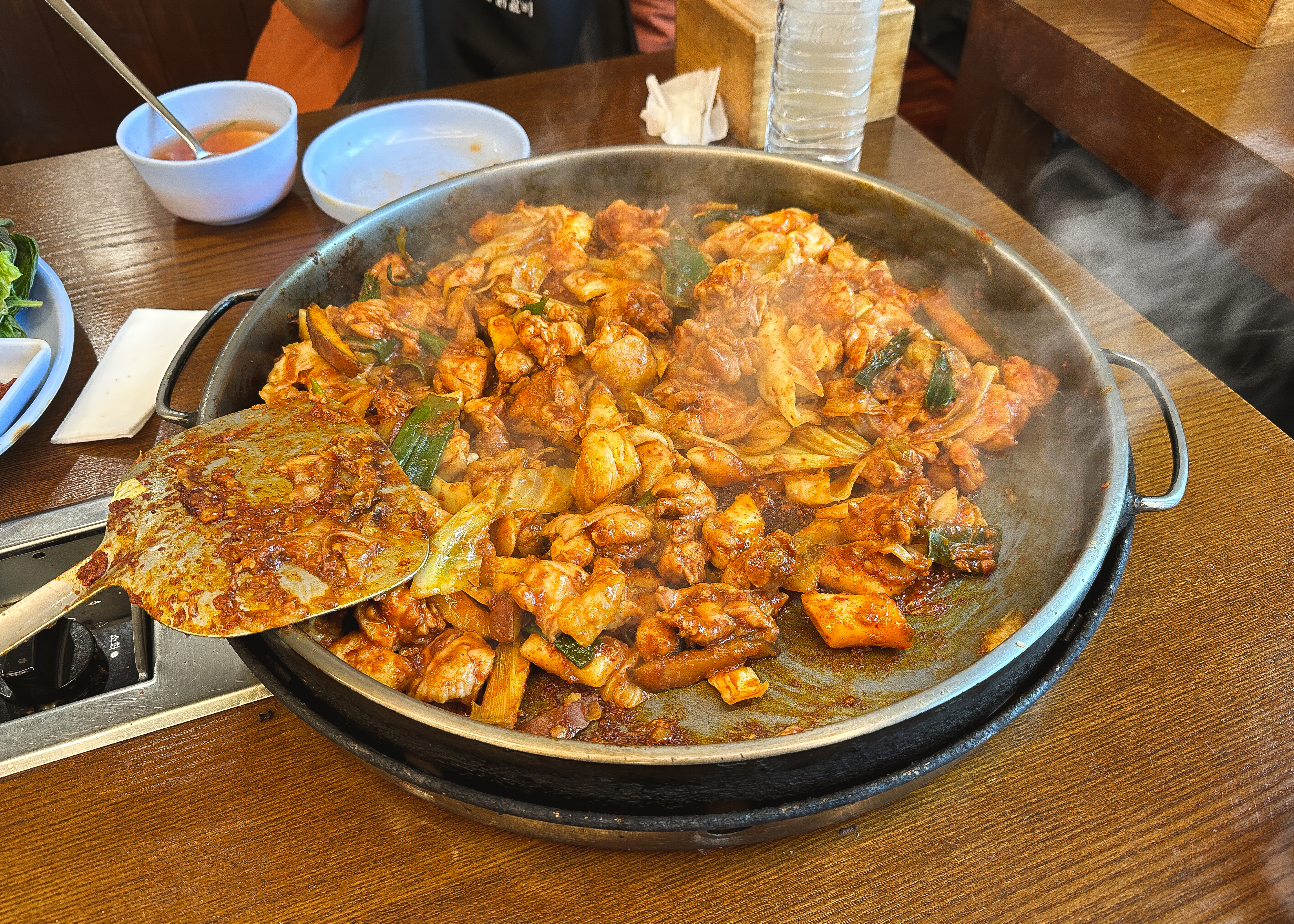 곧이어 주문한 닭갈비가 나왔습니다. 춘천의 대부분 닭갈비 가게가 그렇듯이 직원분들이 직접 볶아주셔서 직접 볶을 필요가 없었습니다. 제가 자주 다니는 우성닭갈비는 양념을 두 번에 걸쳐하는 반면 이곳은 한 번에 양념을 진하게 해서 볶아주고 있었습니다.