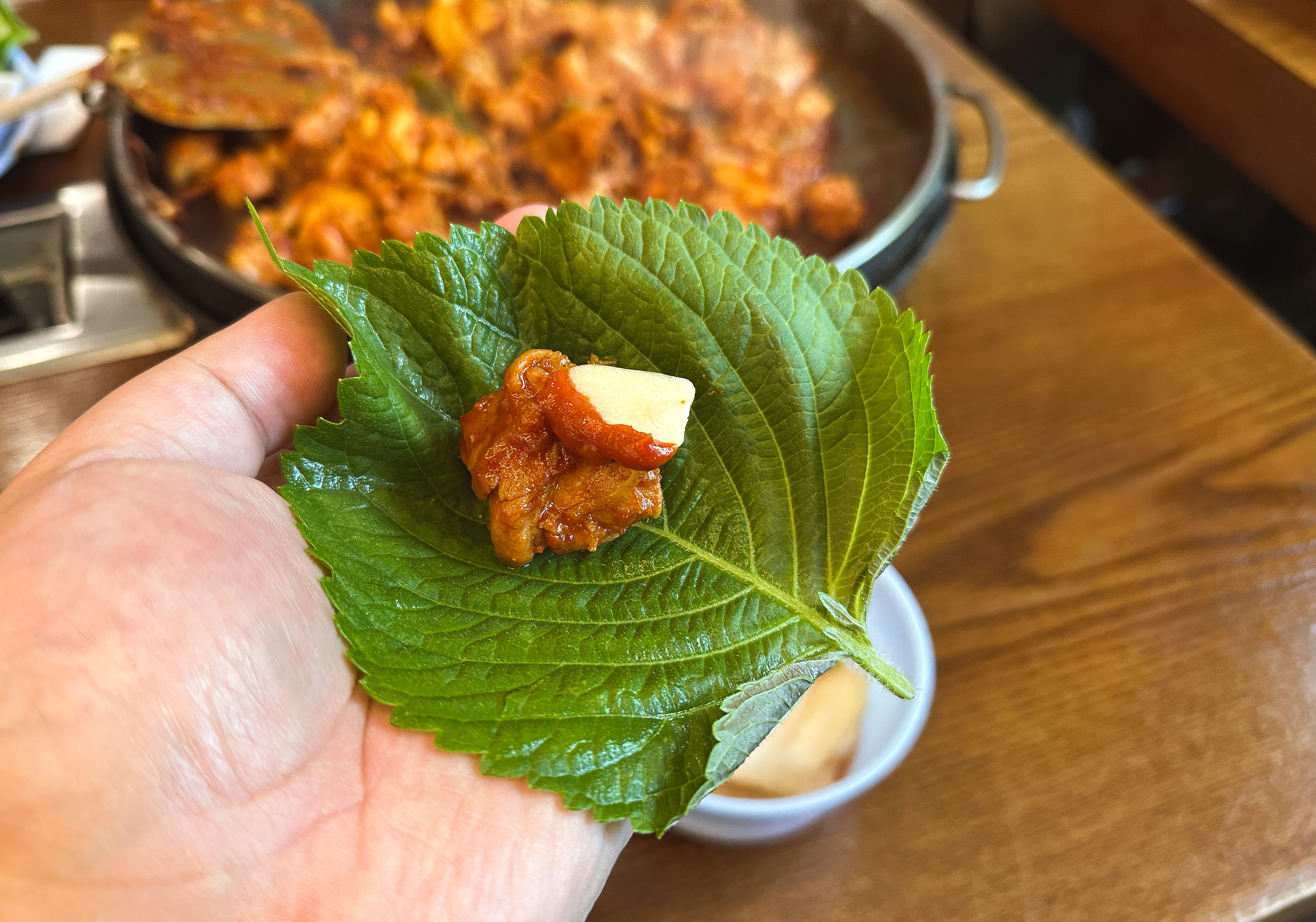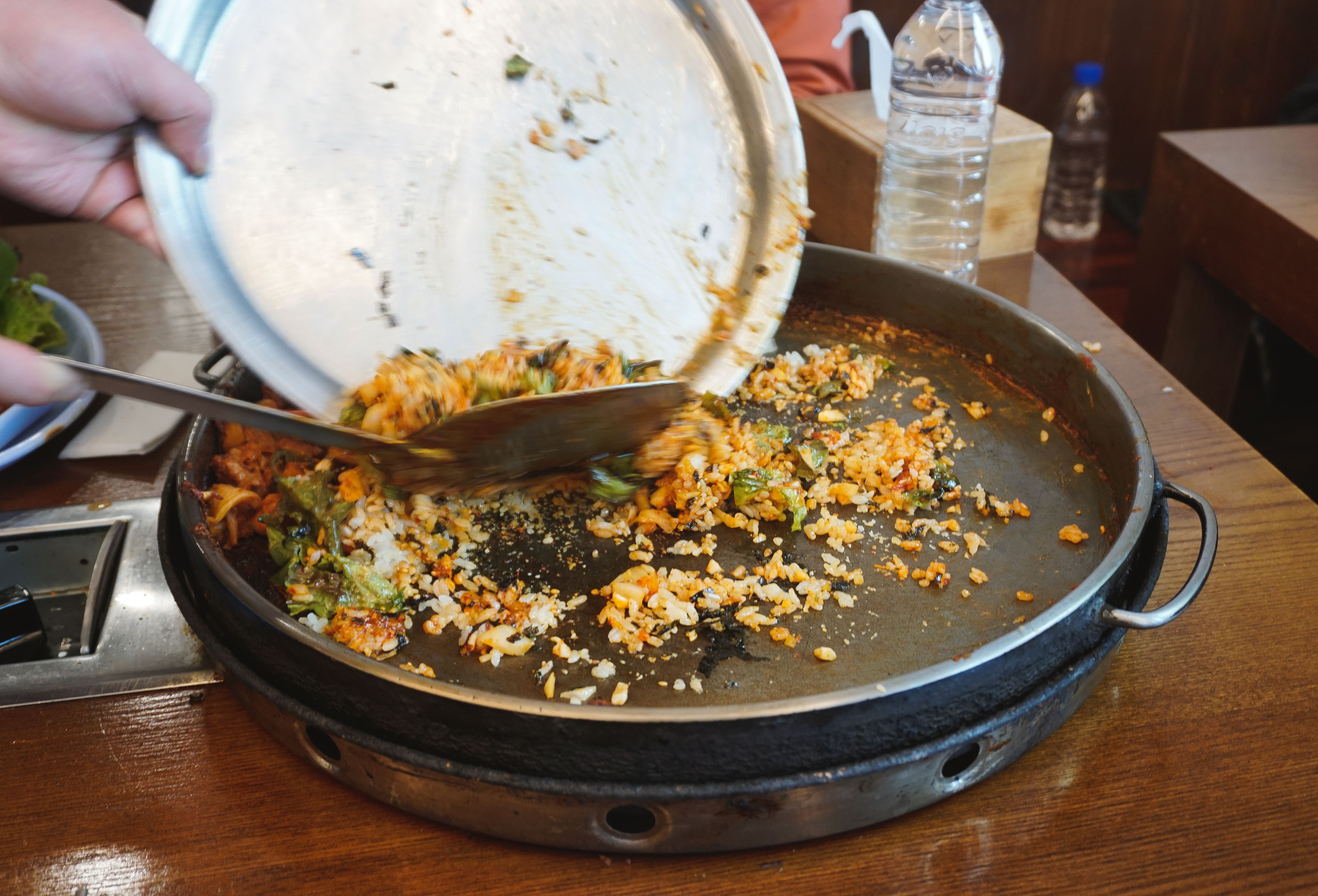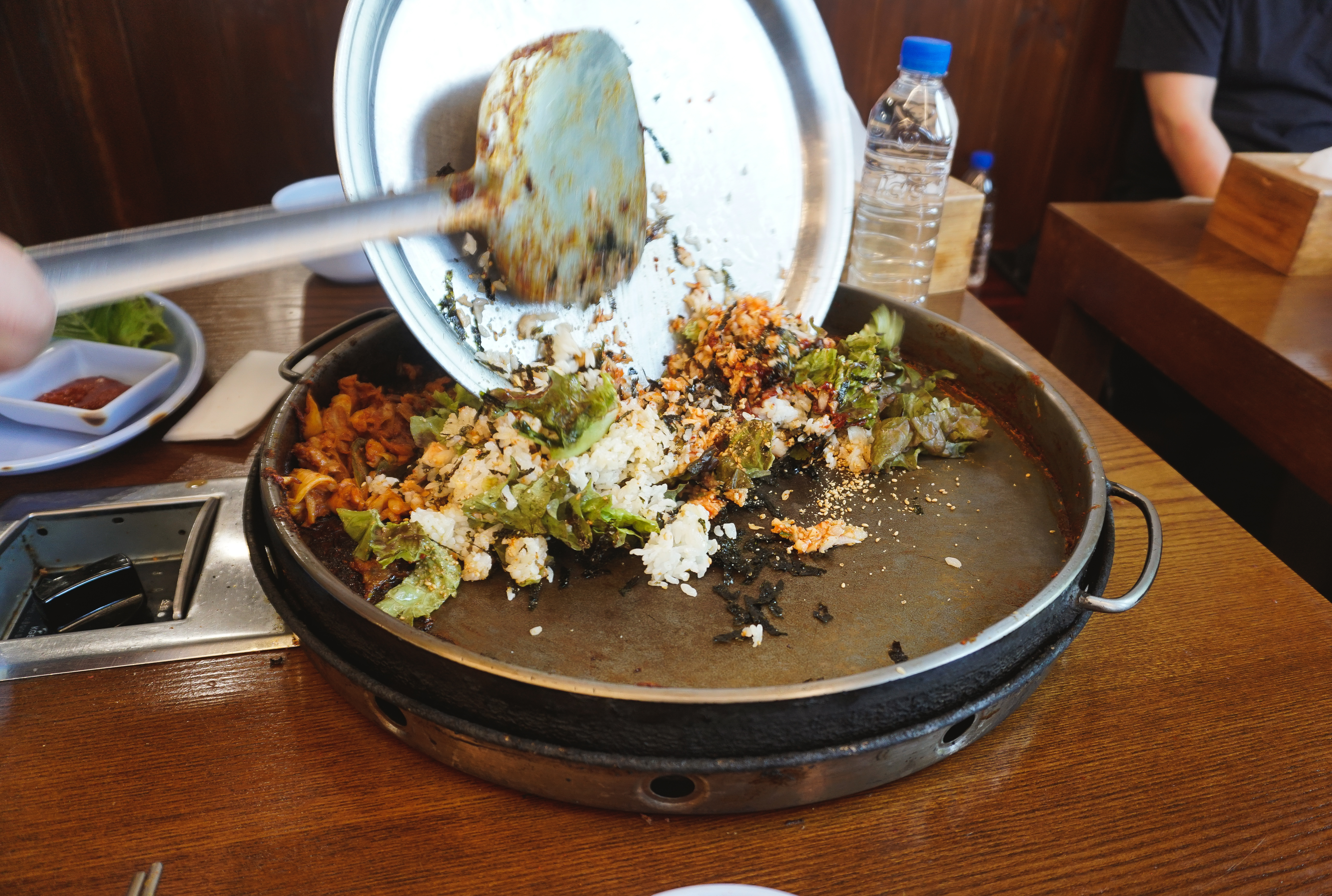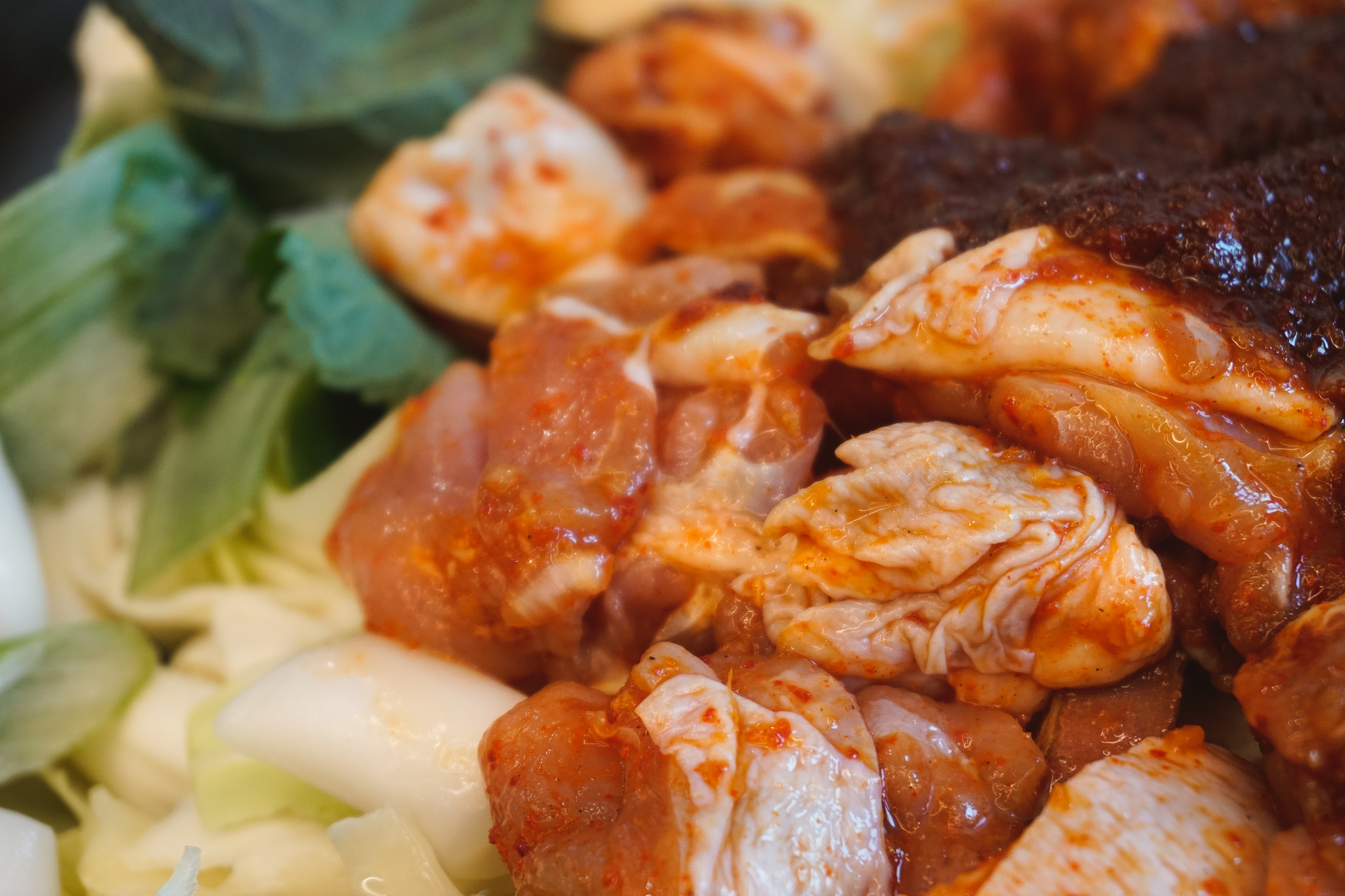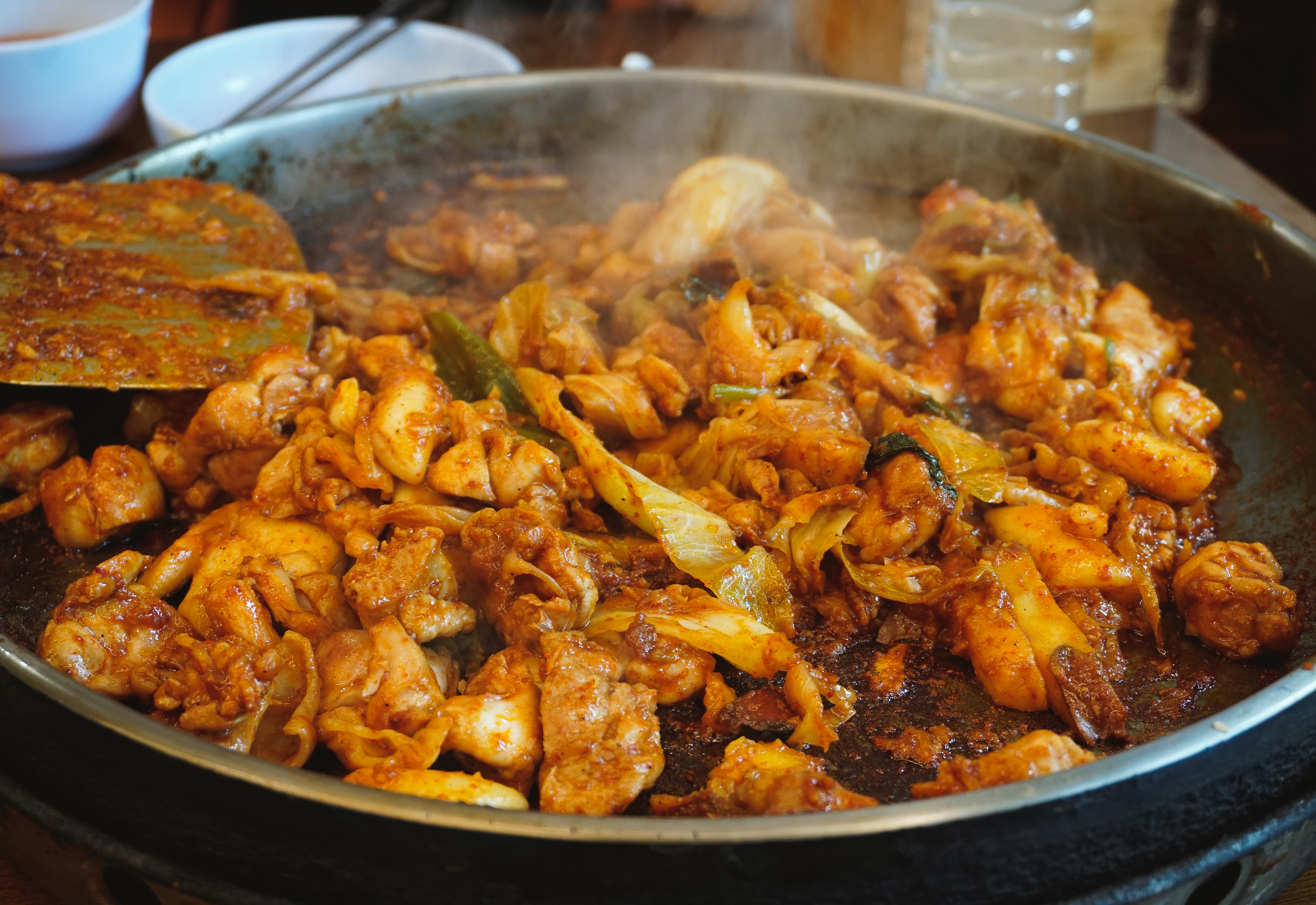 곧이어 주문한 닭갈비가 나왔습니다. 춘천의 대부분 닭갈비 가게가 그렇듯이 직원분들이 직접 볶아주셔서 직접 볶을 필요가 없었습니다. 제가 자주 다니는 우성닭갈비는 양념을 두 번에 걸쳐하는 반면 이곳은 한 번에 양념을 진하게 해서 볶아주고 있었습니다.