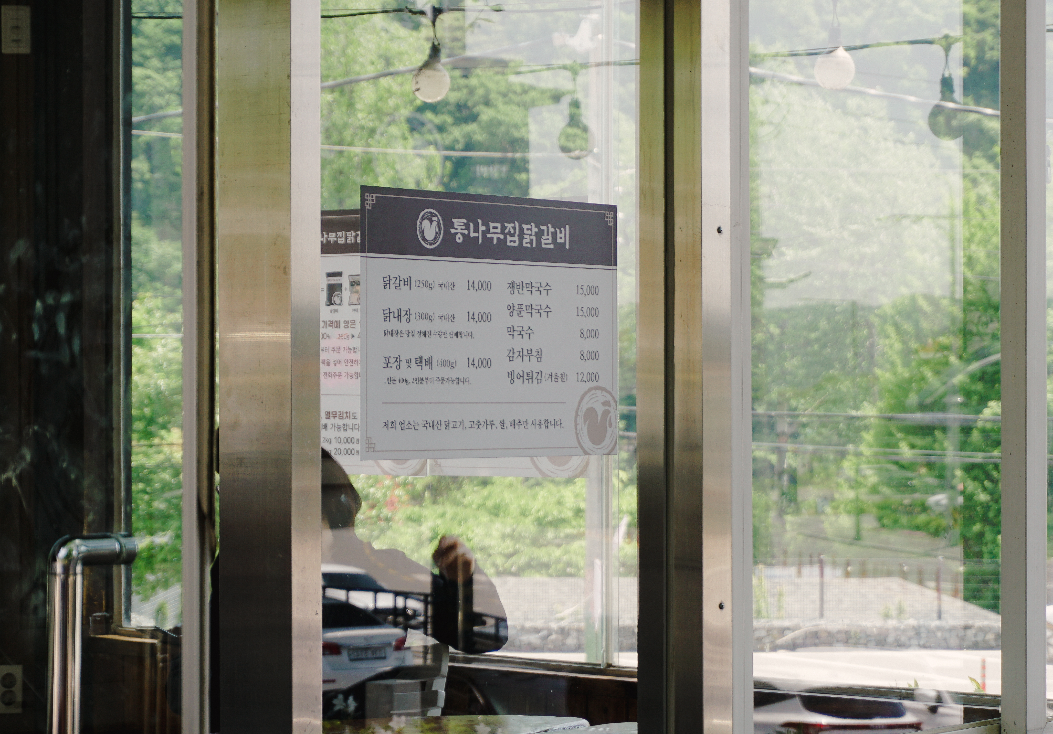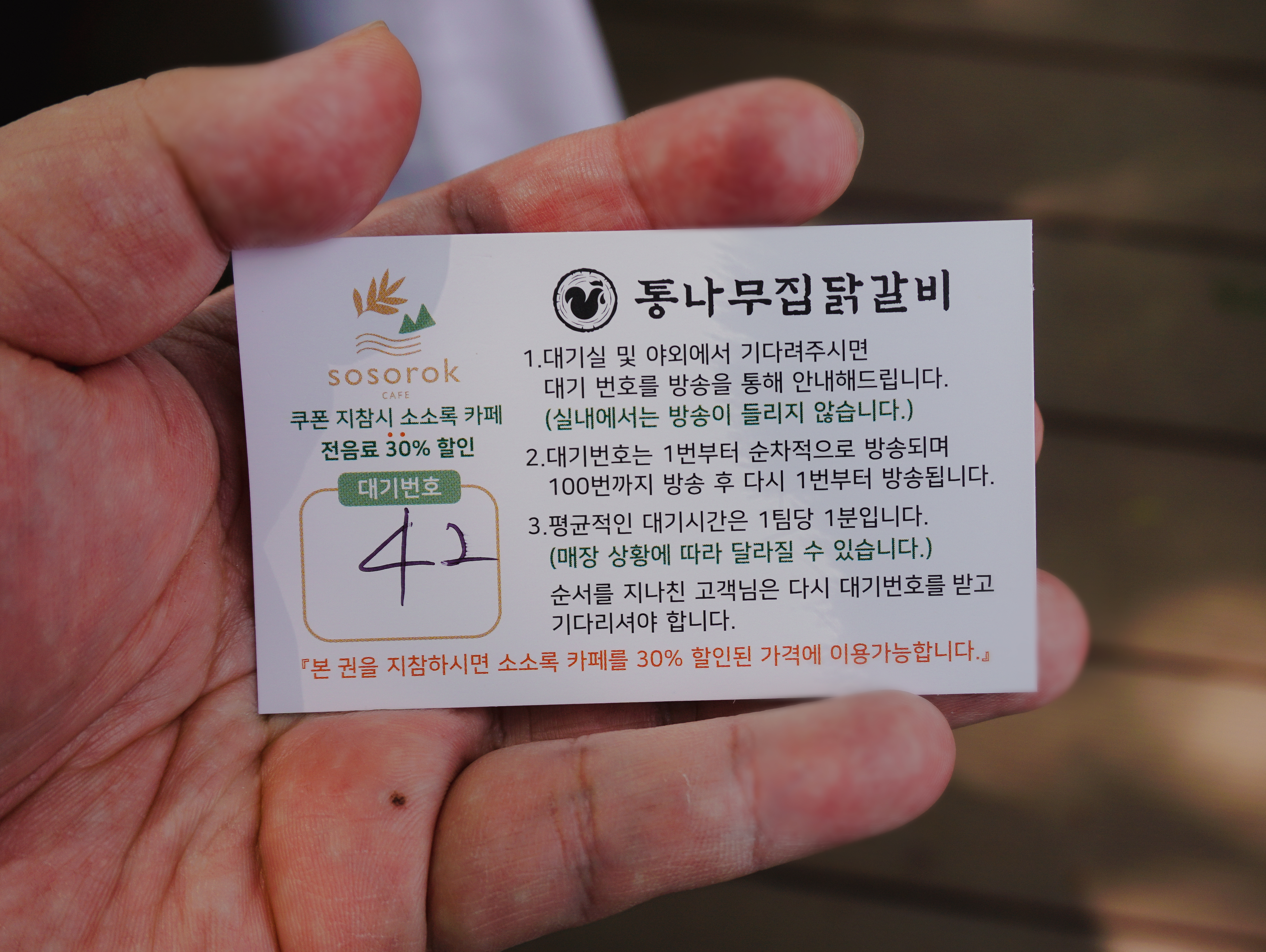 춘천 통나무집닭갈비는 강원 춘천시 신북읍 천천리 38-26 에 위치한 닭갈비 전문점입니다. 이곳은 손님도 많고 가게 규모도 커서 대기가 많이 필요한 가게입니다. 대기번호를 받고 가게 앞에서 기다리면 순서대로 번호를 불러주는데, 가게 밖에도 메뉴와 가격이 적혀있어서 메뉴를 미리 고민해 볼 수 있었습니다.
