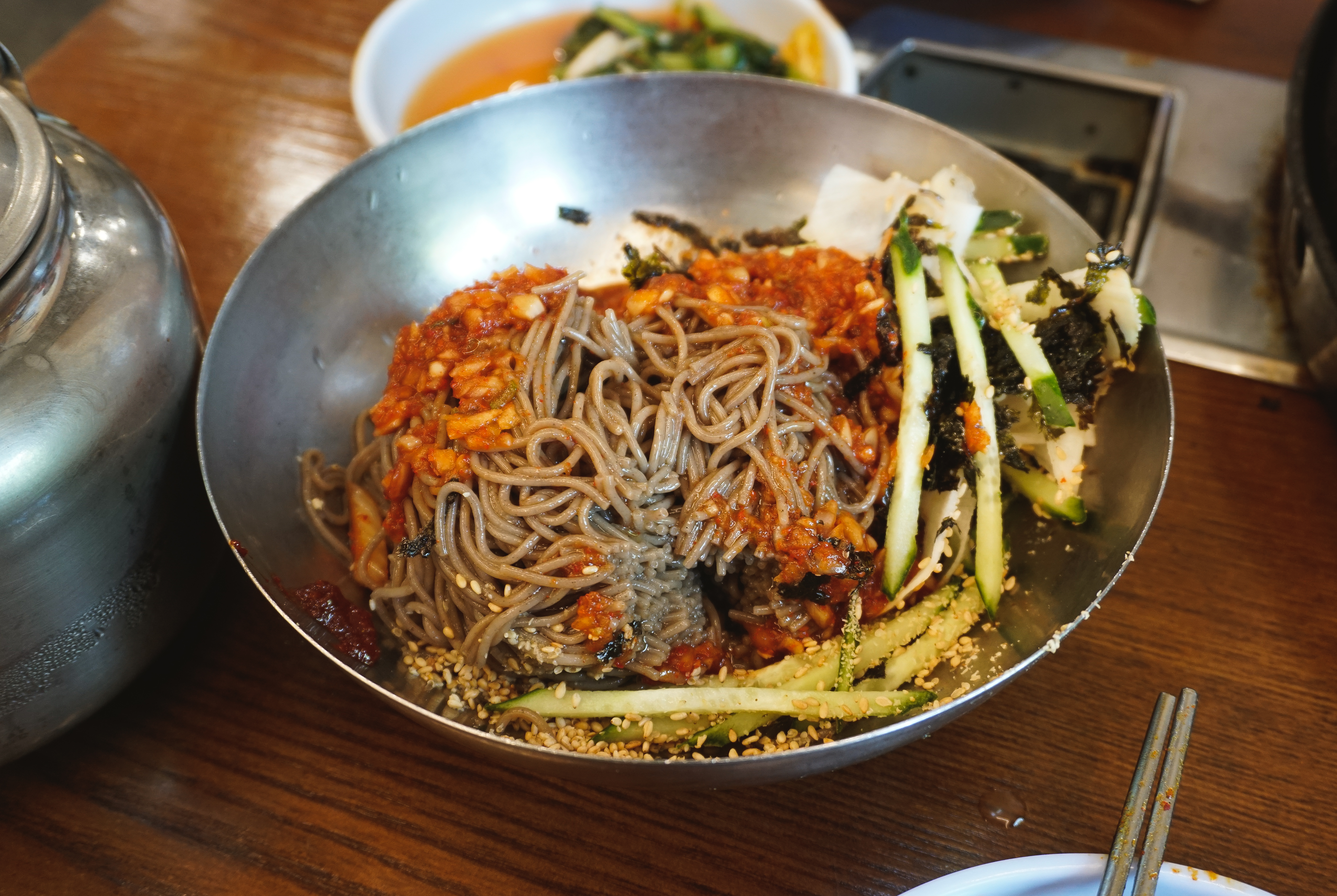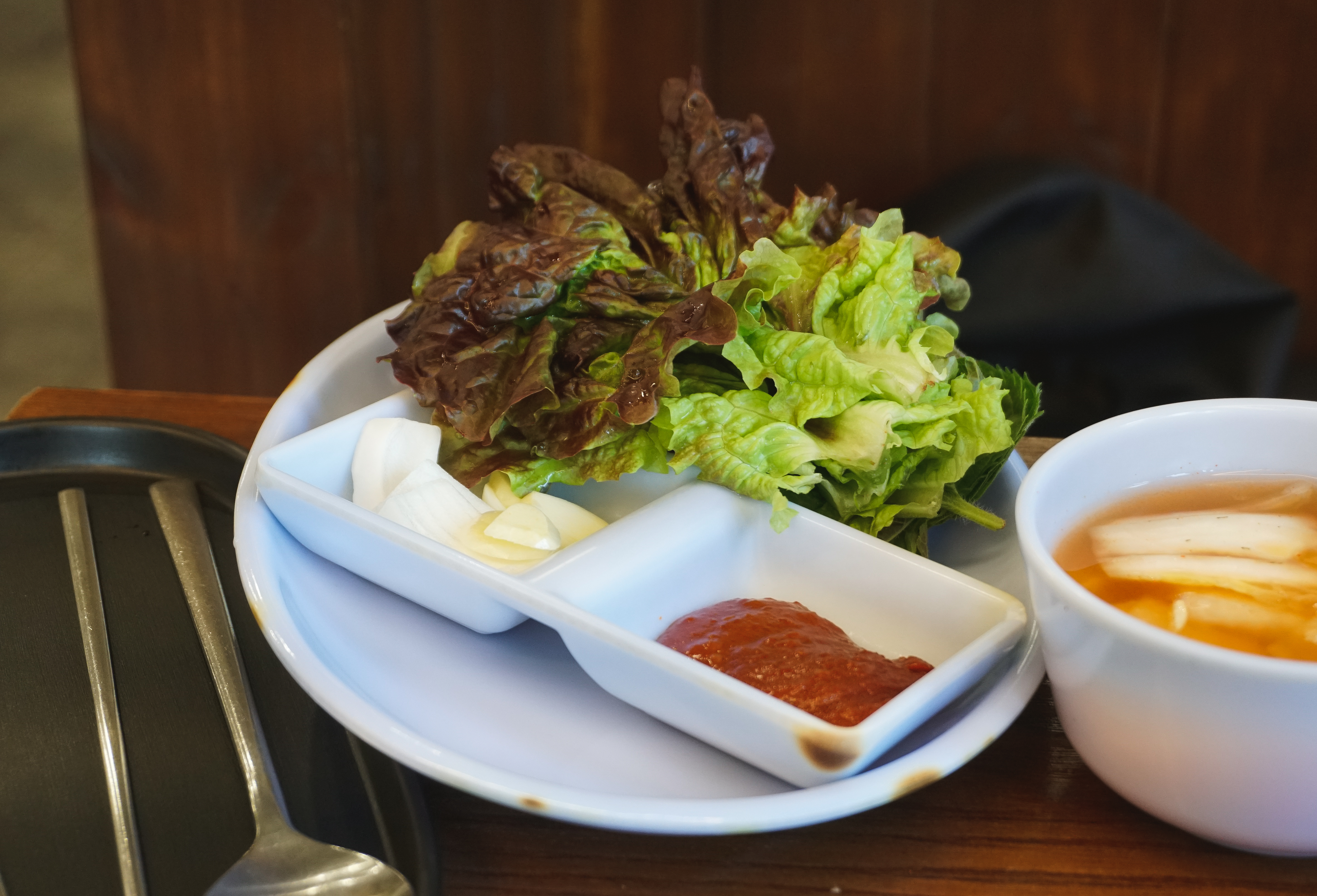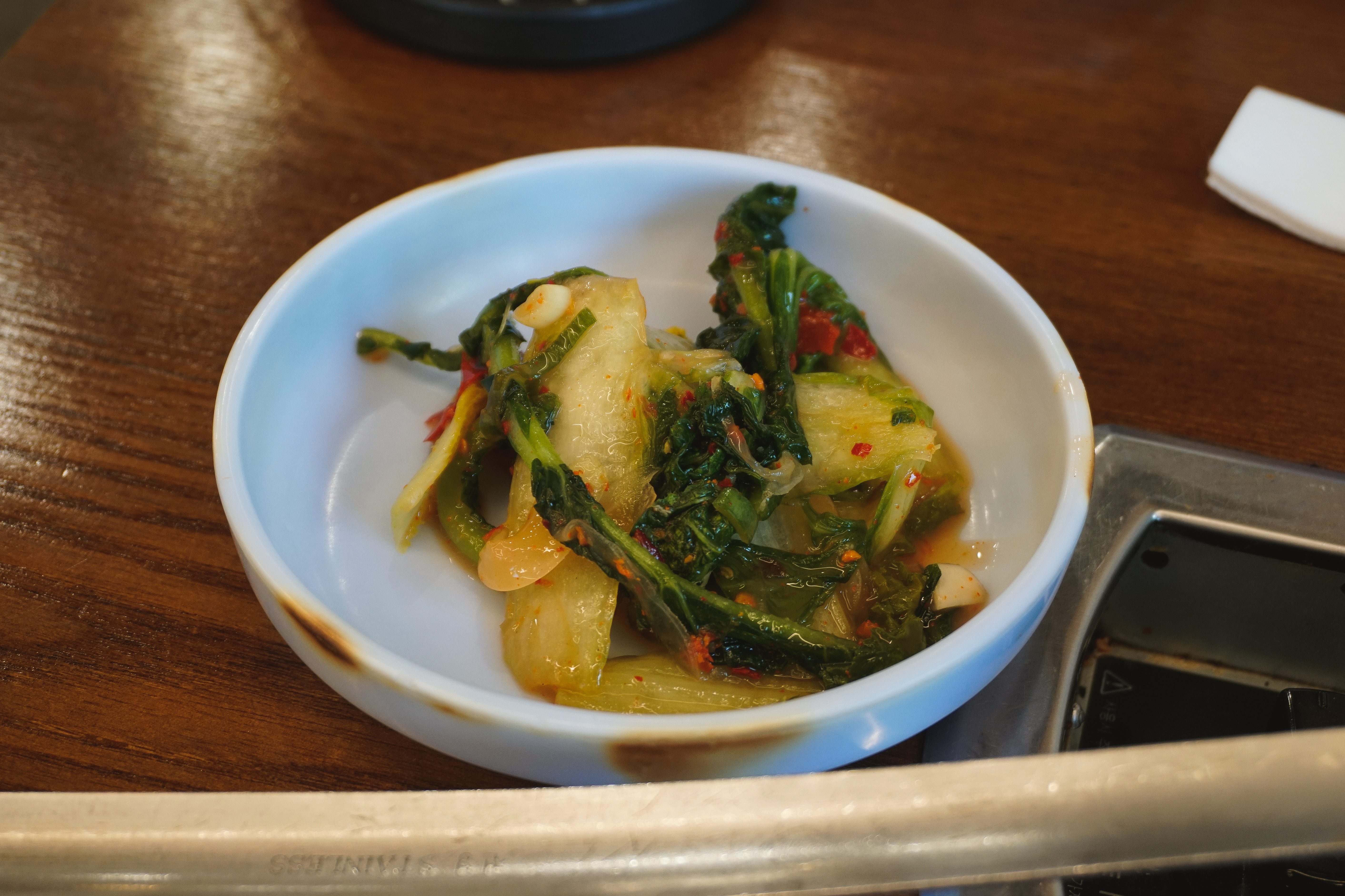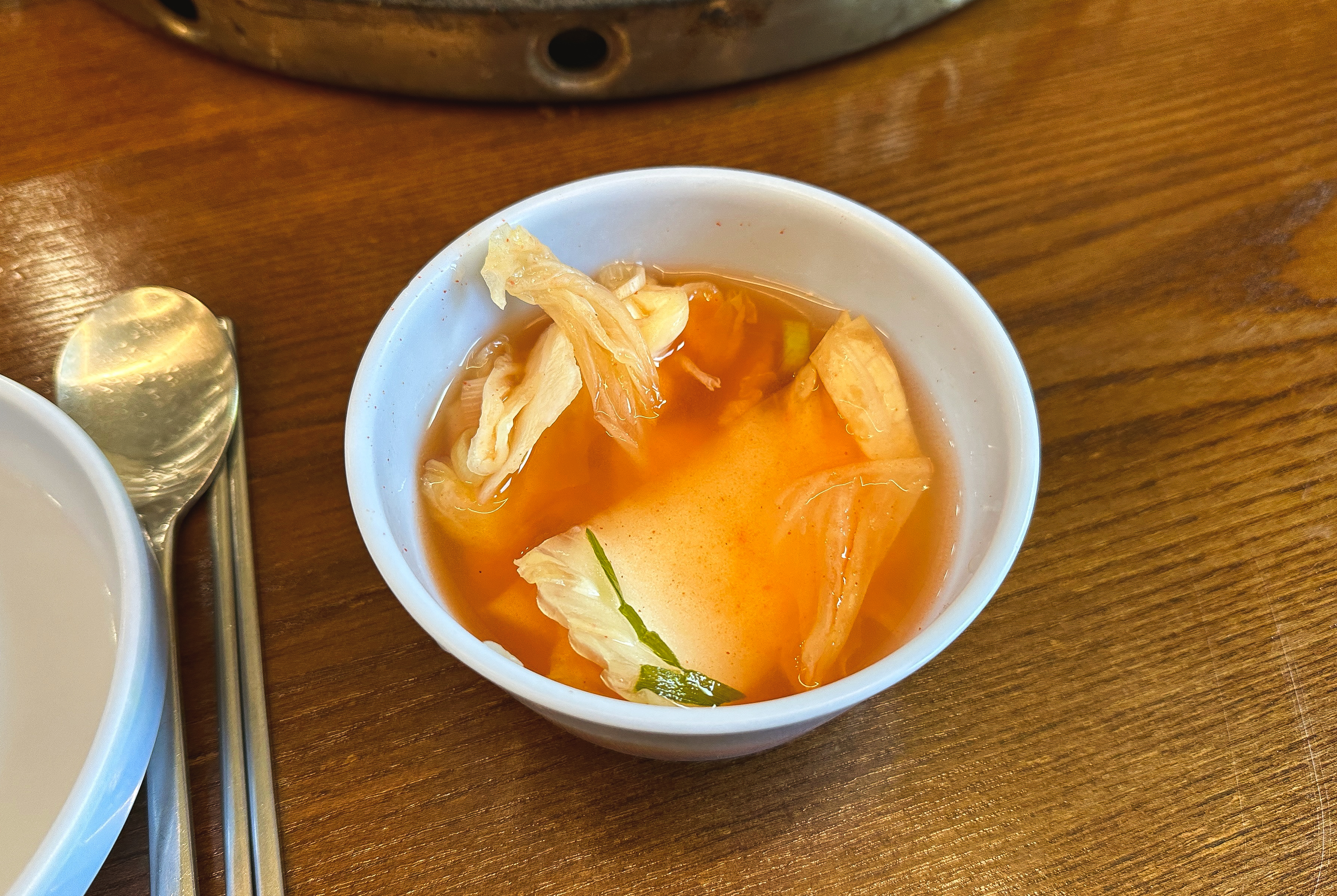 통나무집닭갈비에는 반찬으로 열무김치, 물김치, 쌈채소 등이 나왔는데, 열무김치와 물김치 둘 다 정말 맛있더라고요. 열무김치는 아삭이면서 겉절이처럼 담가서 그런지 풀내가 조금 났고요, 물김치도 너무 짜거나 자극적이지 않아서 편하게 곁들이기 좋았습니다.
