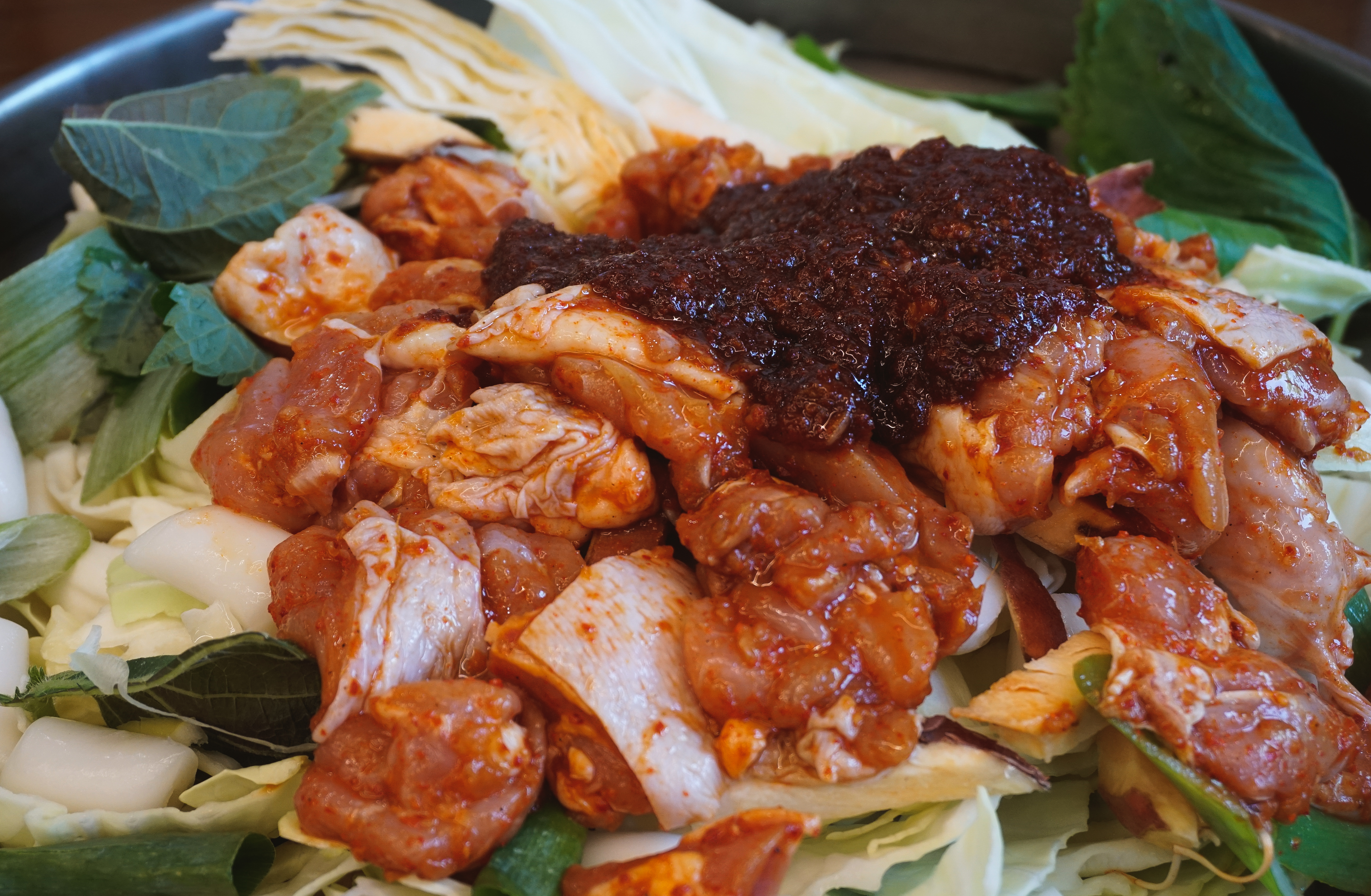 곧이어 주문한 닭갈비가 나왔습니다. 춘천의 대부분 닭갈비 가게가 그렇듯이 직원분들이 직접 볶아주셔서 직접 볶을 필요가 없었습니다. 제가 자주 다니는 우성닭갈비는 양념을 두 번에 걸쳐하는 반면 이곳은 한 번에 양념을 진하게 해서 볶아주고 있었습니다.