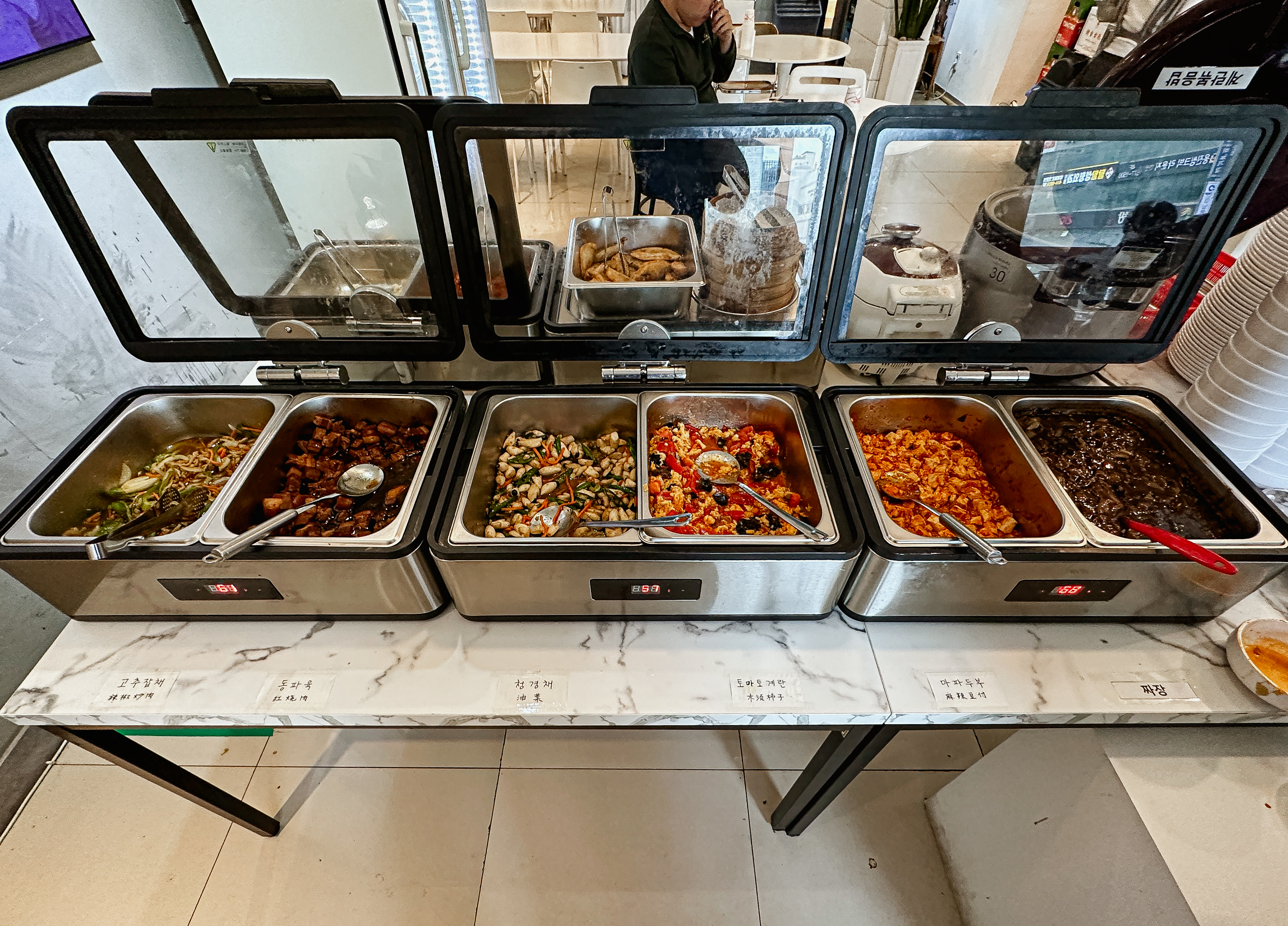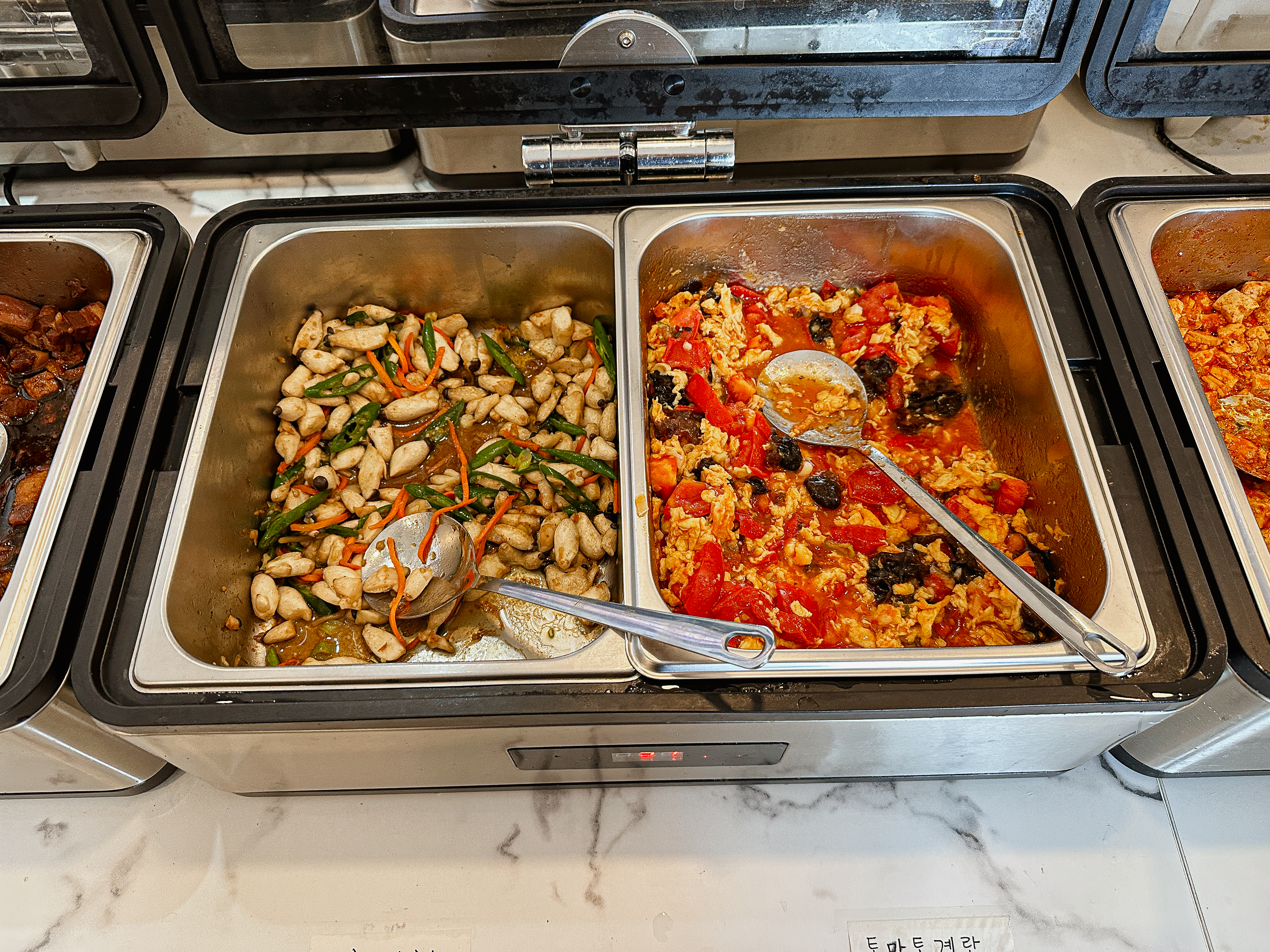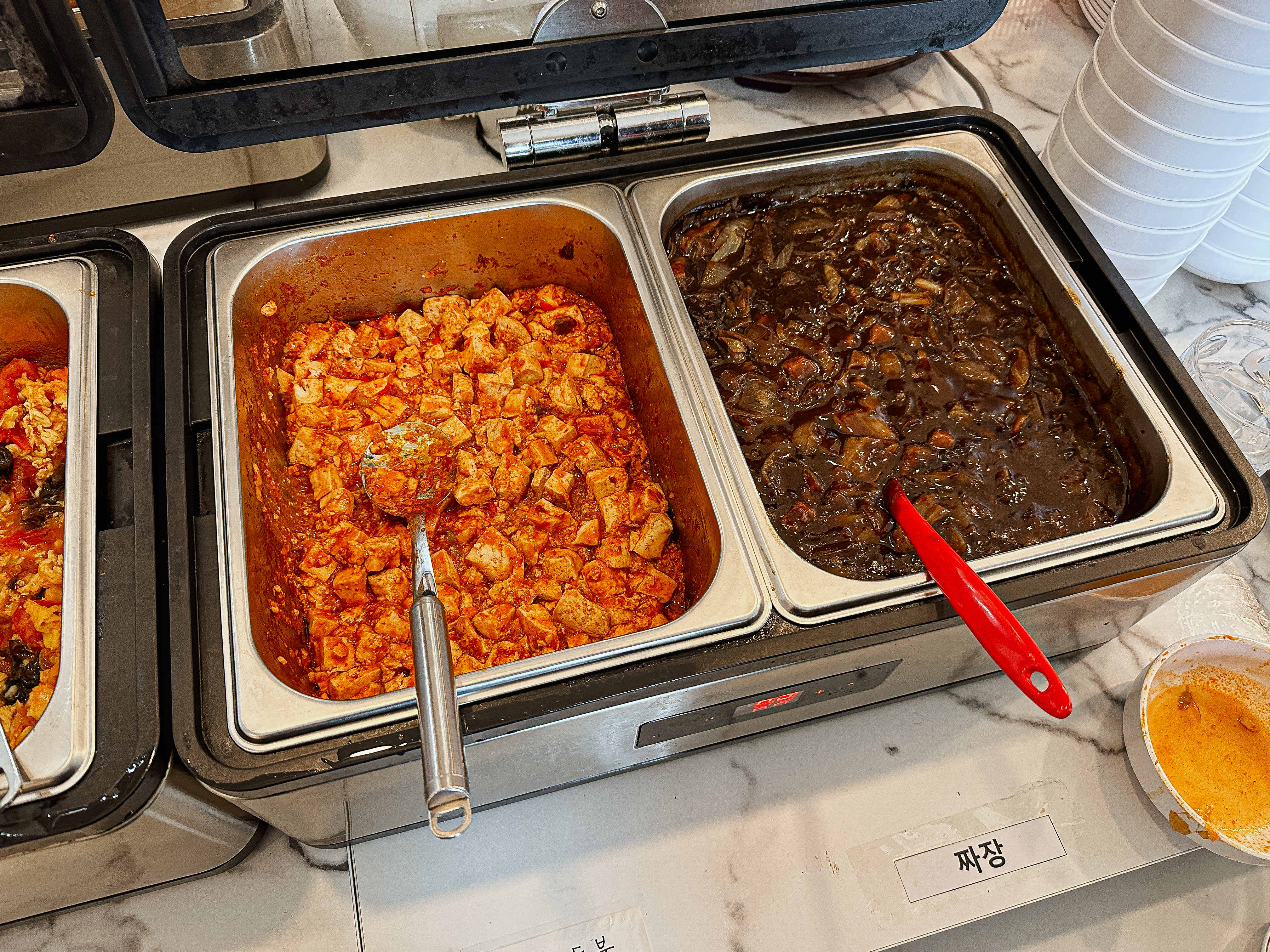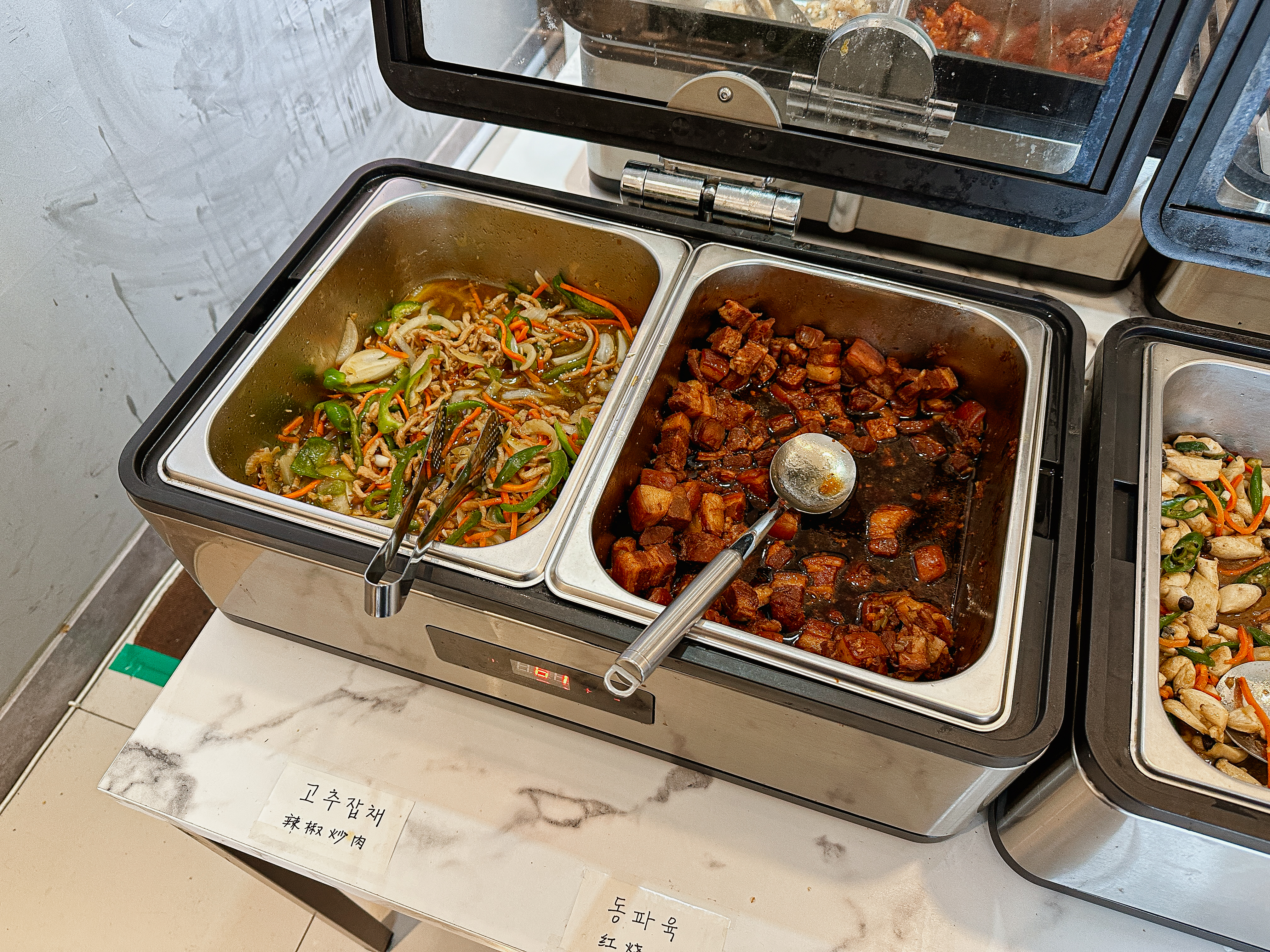 접시에 원하는 반찬을 덜어다 먹으면 되었는데, 맛이 좋았던 메뉴들을 나열해 보자면 깐풍기, 꿔바로우, 동파육, 토마토계란볶음, 마파두부 정도 있을 것 같았고, 짜장이나 짬뽕 같은 중식당의 대표 메뉴들은 학교 급식 같은 느낌이었습니다.