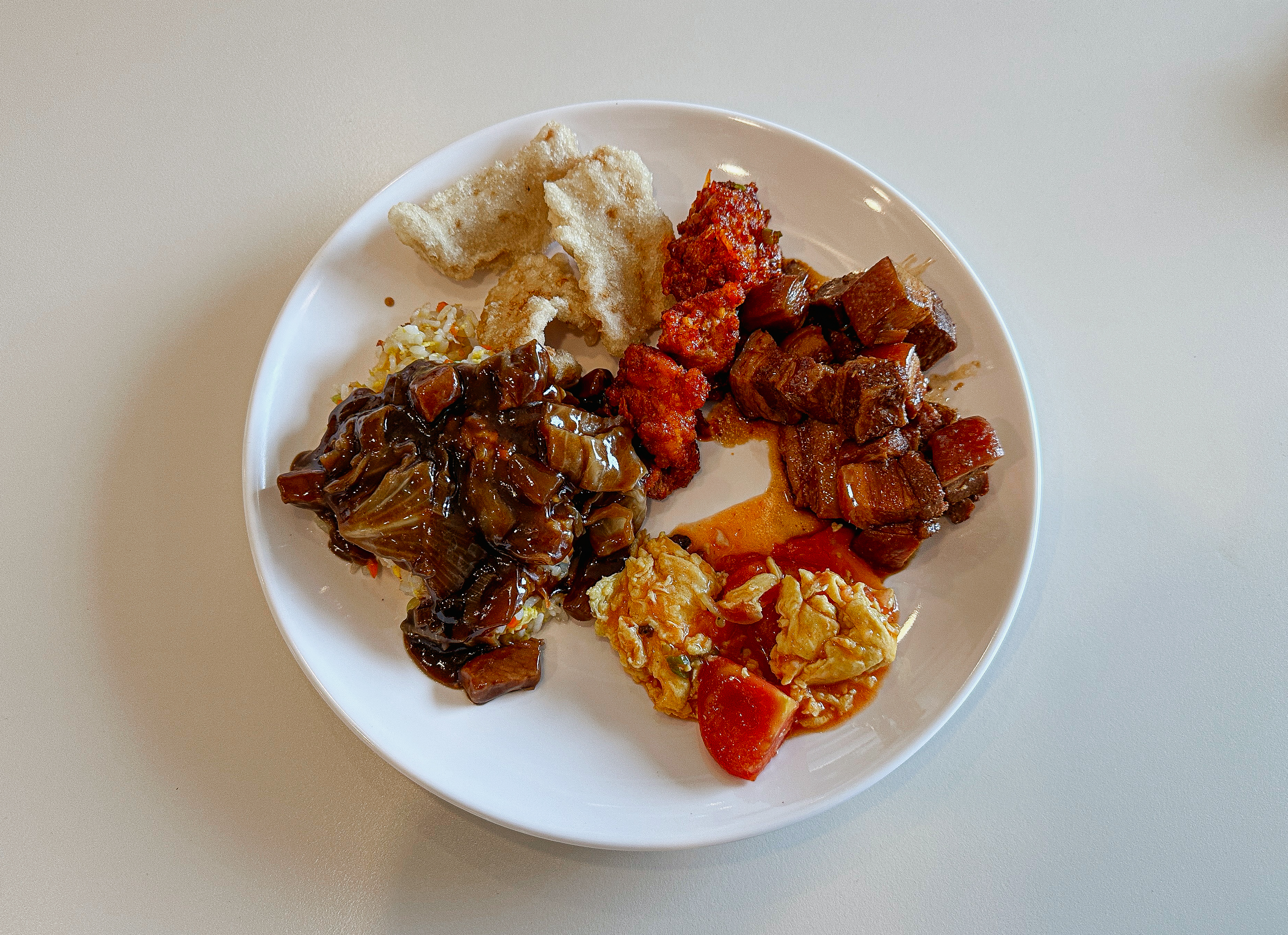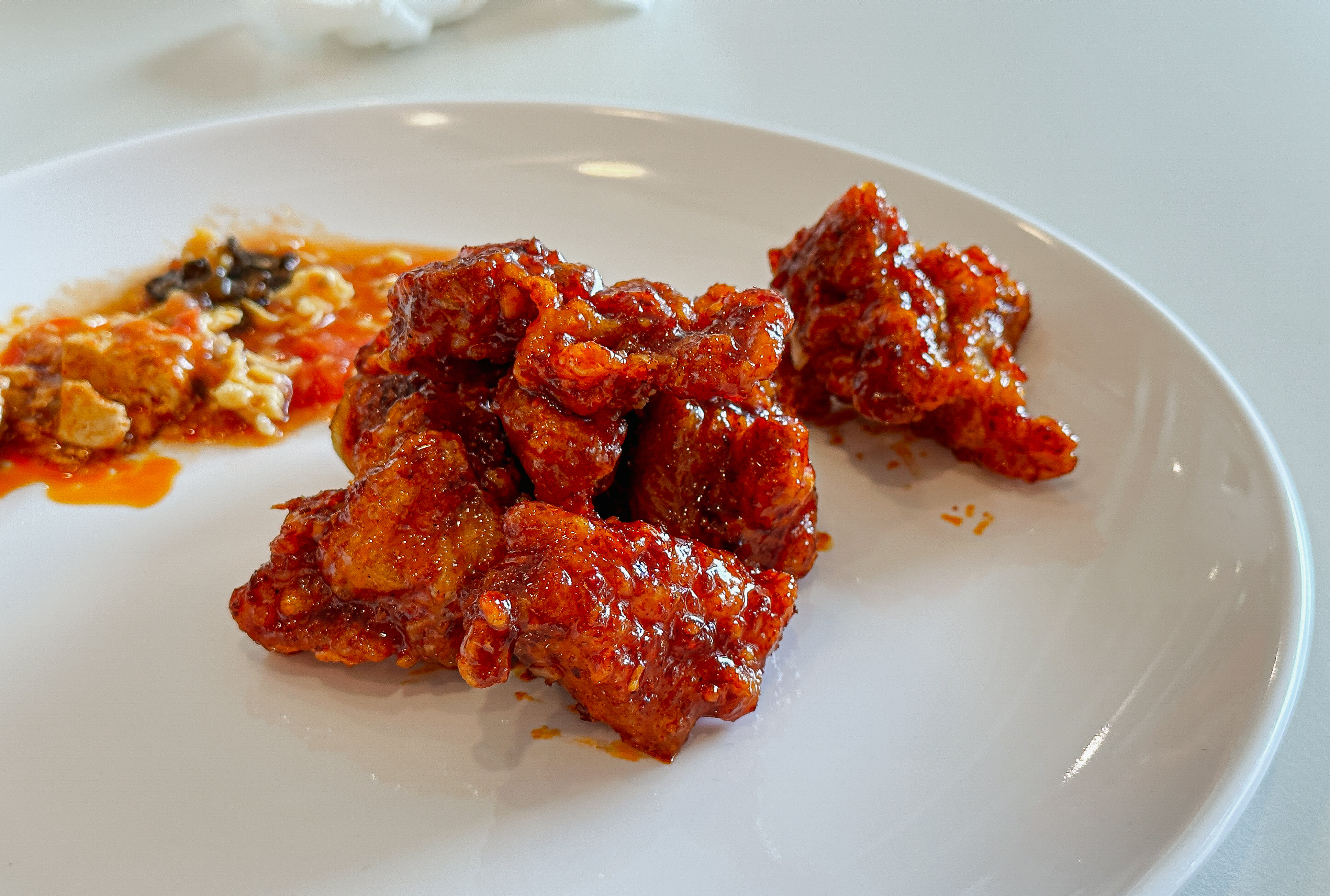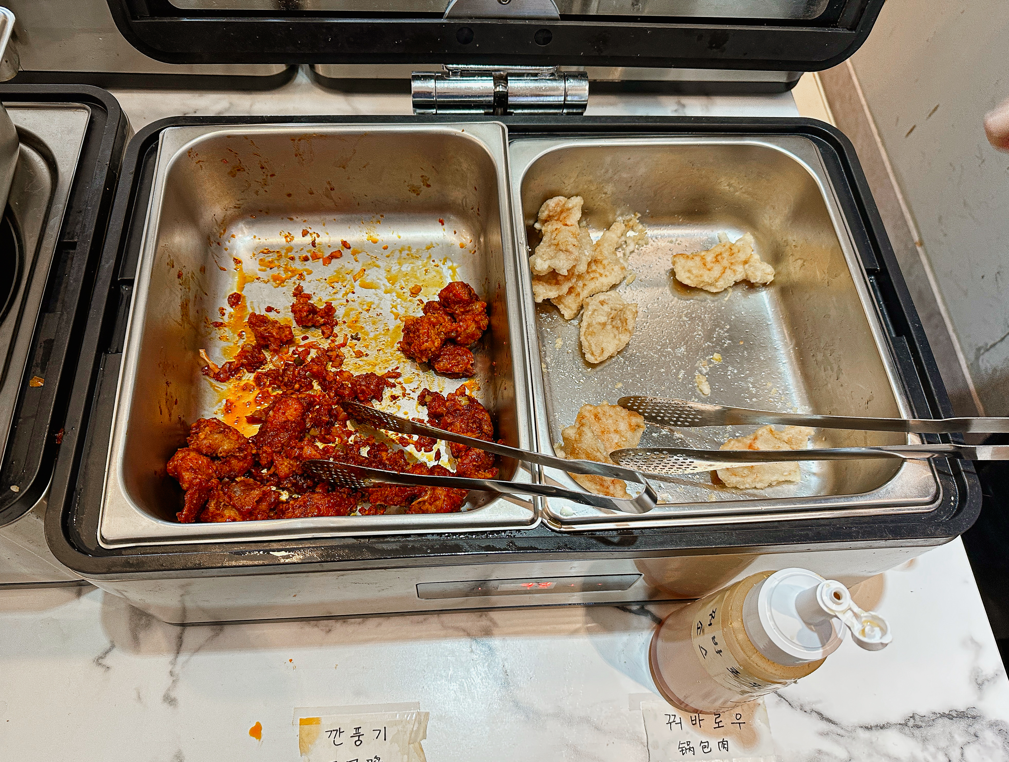 접시에 원하는 반찬을 덜어다 먹으면 되었는데, 맛이 좋았던 메뉴들을 나열해 보자면 깐풍기, 꿔바로우, 동파육, 토마토계란볶음, 마파두부 정도 있을 것 같았고, 짜장이나 짬뽕 같은 중식당의 대표 메뉴들은 학교 급식 같은 느낌이었습니다.