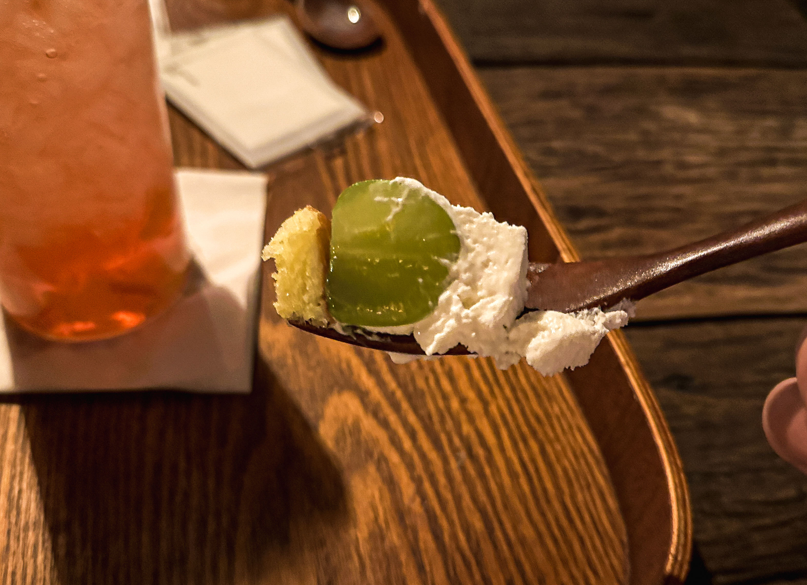 음료와 함께 주문한 디저트가 나왔습니다. 도토리 모양의 마들렌과 샤인머스캣이 들어간 케이크 등 모양은 참 이뻤는데, 실제로 먹어보면 기대와는 달리 맛은 좀 퍽퍽하고 맛이 별로였습니다. 마들렌 같은 경우에는 편의점에서 파는 에그볼이라는 빵이랑 비슷한 느낌이었습니다.