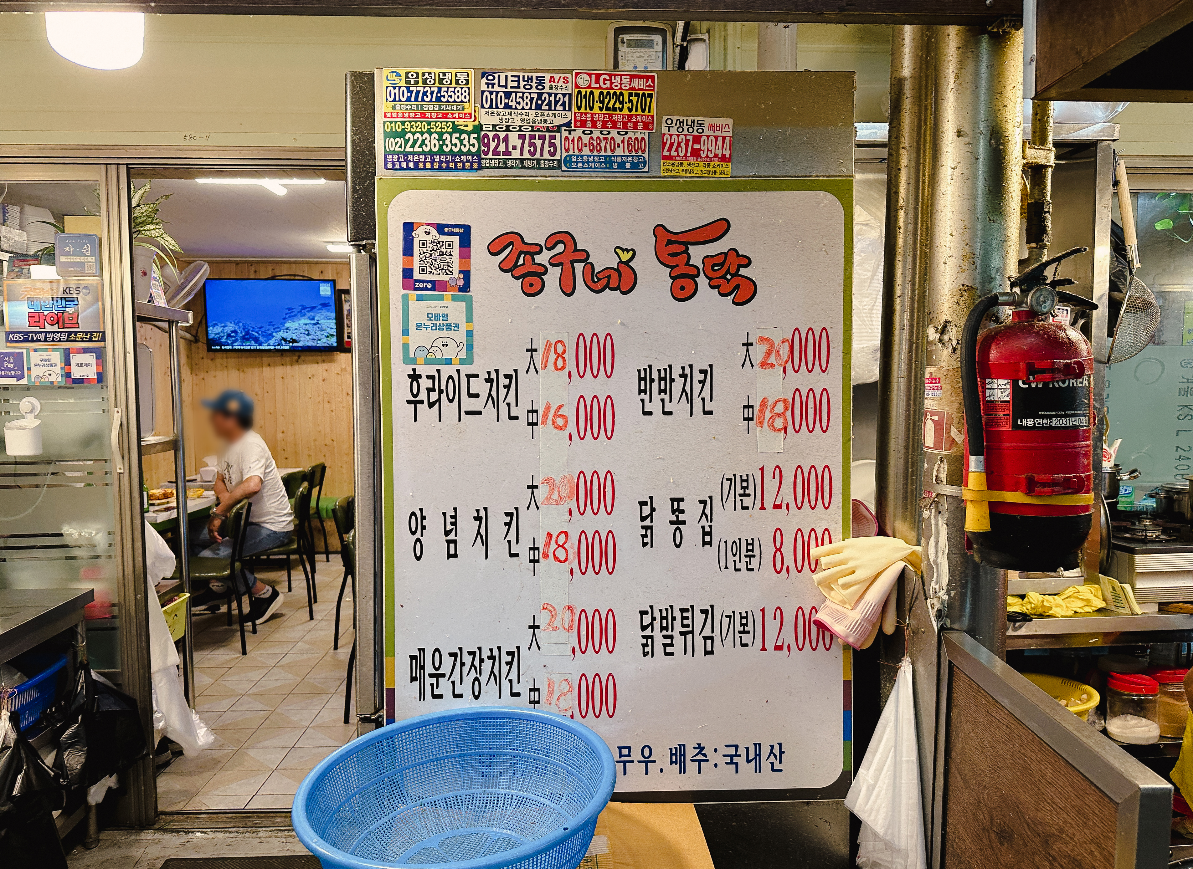 청량리 종구네통닭의 메뉴는 후라이드치킨, 양념치킨, 매운간장치킨, 반반치킨, 닭똥집, 닭발튀김이 있었습니다. 저희는 반반치킨과 닭똥집 그리고 음료를 주문해서 먹었습니다. 참고로 이 가게는 방송에도 종종 나왔는지 방송 내용을 담고 있는 액자를 전시하고 있었습니다.