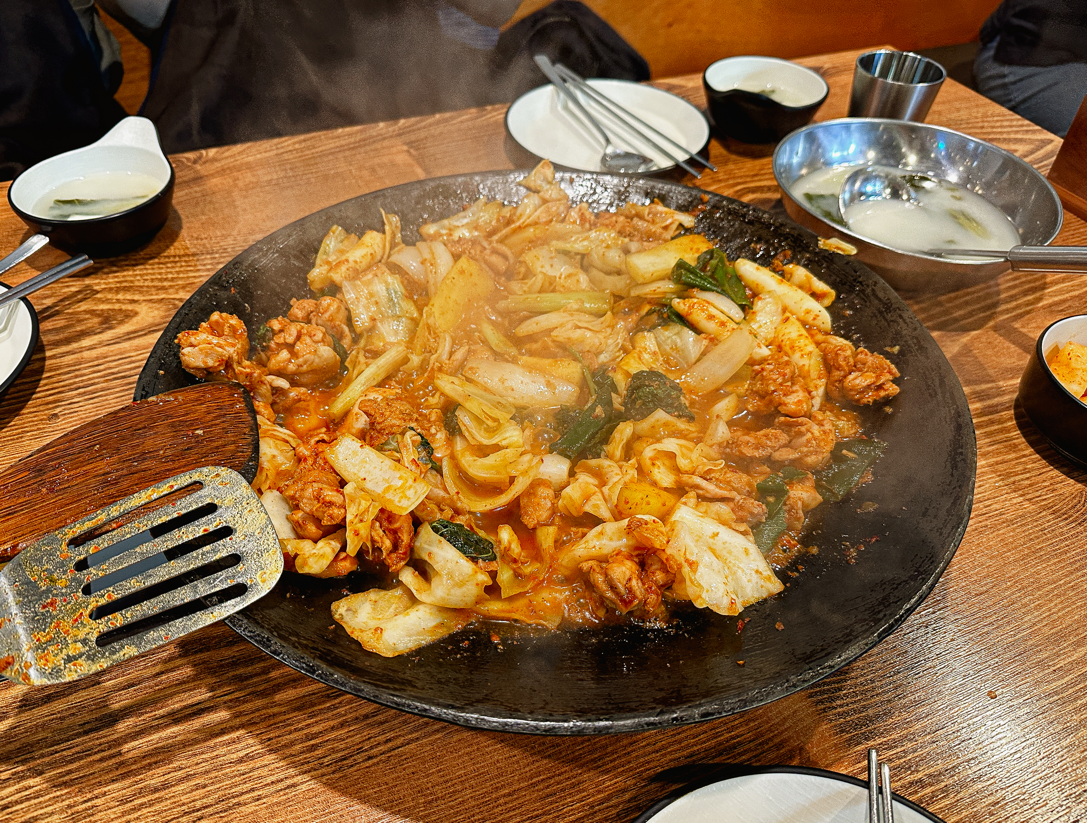 주문한 닭갈비와 함께 반찬이 나왔습니다. 반찬은 동치미와 깍두기가 나왔고, 동치미는 걸쭉하고 새콤한 맛이 강했습니다. 닭갈비는 가게 직원분이 직접 익혀주었고, 춘천의 닭갈비는 채소의 수분만으로 볶아내는 형태였지만, 거여동 유성닭갈비는 국물이 자작하게 있는 형태의 닭갈비인 것 같더라고요.