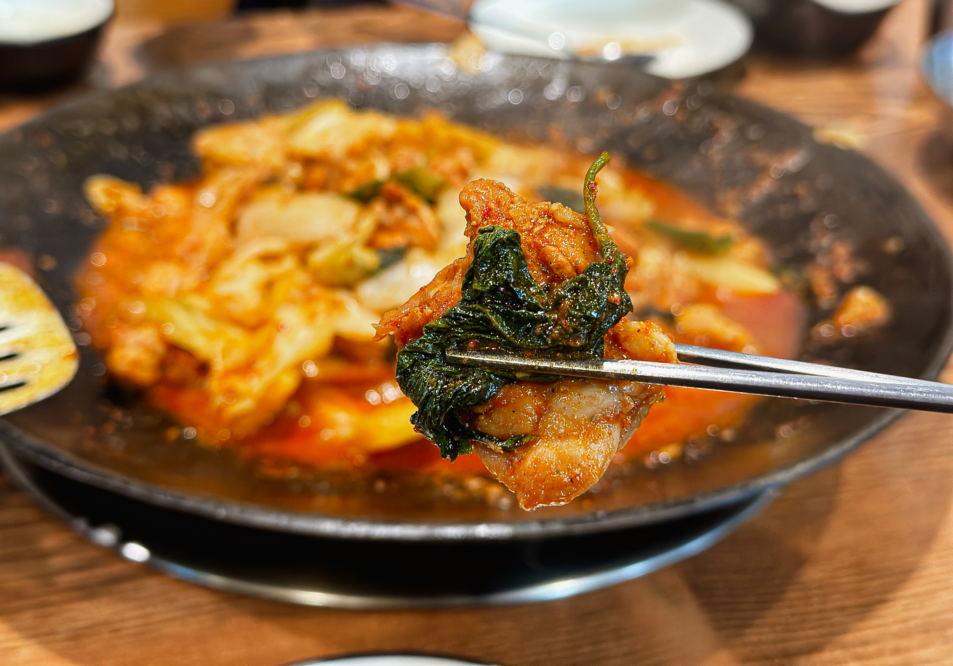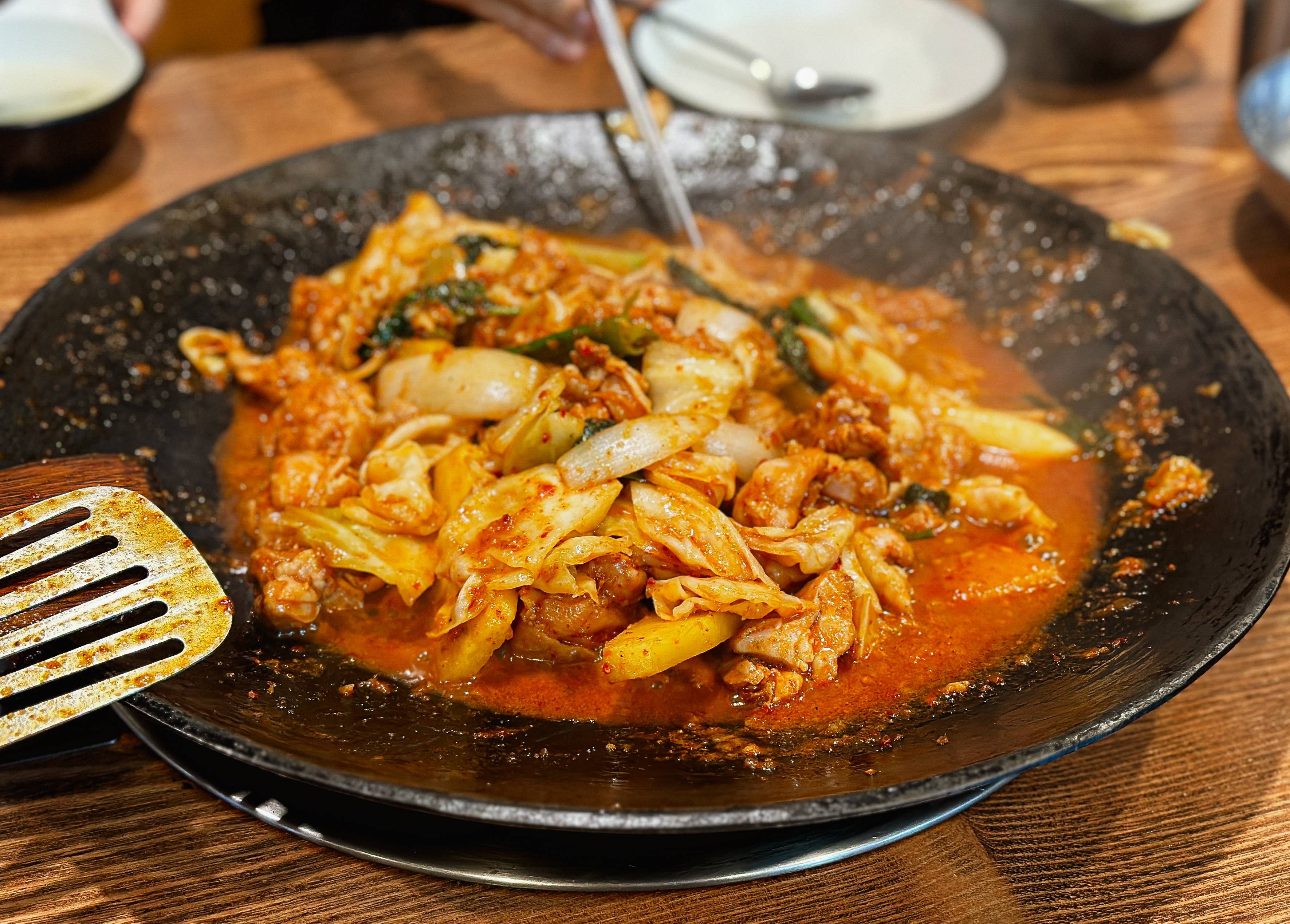 닭갈비는 매콤하면서도 깔끔한 맛이었습니다. 국물이 많이 있어서 그런지 졸이면서 먹도록 하고 있었습니다. 아쉬운 점은 쌈채소를 기본으로 주시는 게 아니라 추가로 주문을 해야 하는 점이었습니다. 닭갈비 가격이 저렴하다는 느낌은 아니었는데, 쌈채소까지 별도로 구입하도록 하니 뭔가 반감이 드는 부분이었죠.